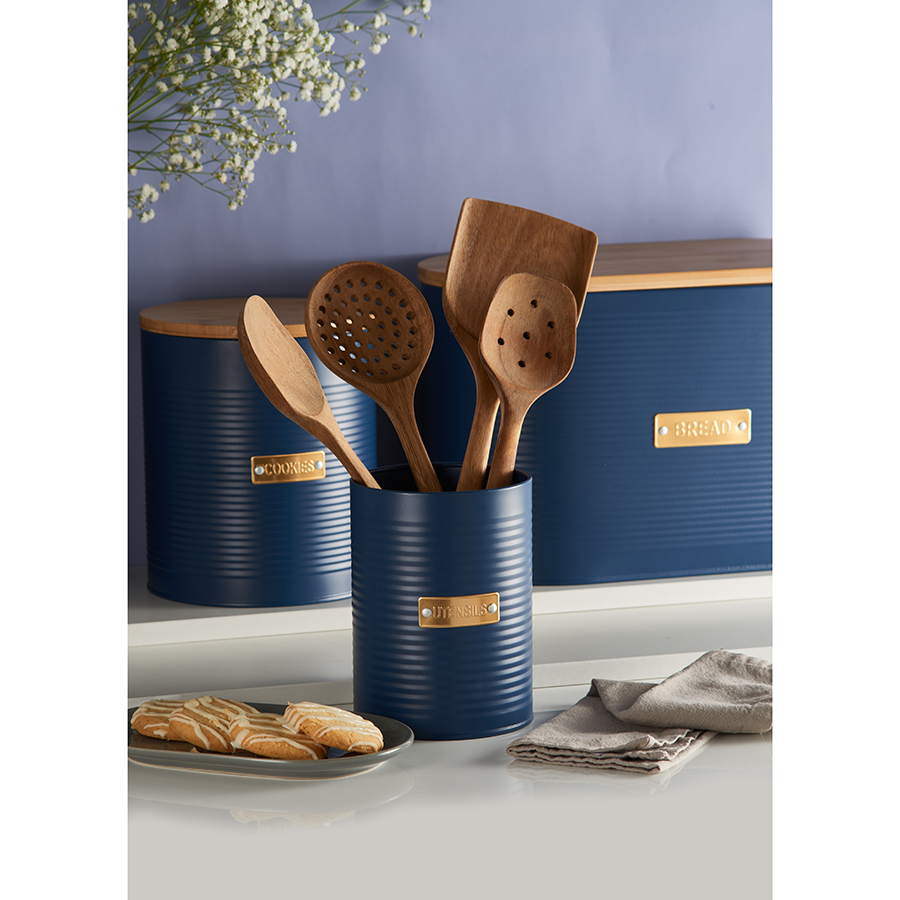Банка для печенья из коллекции Otto – удобное решение для хранения сыпучих продуктов и стильный элемент кухонного интерьера. Эргономичный контейнер выполнен из прочной, устойчивой к коррозии и деформации углеродистой стали. Плотно прилегающая бамбуковая крышка с силиконовым уплотнителем защищает содержимое банки от заветривания и отсыревания. Рельефная поверхность и красивое сочетание золотистого декора с матовым покрытием насыщенного синего цвета делает дизайн интересным. Такая посуда отлично вписывается в интерьер, оформленный в классическом и современном стиле.