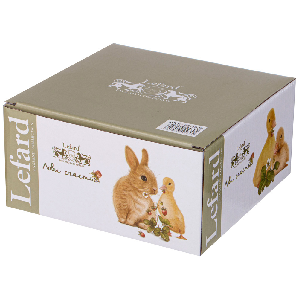 Наша жизнь состоит из маленьких мгновений счастья. Поймал это мгновение и наслаждайся! Только любовь и только доброта сделает мечты реальными. Пушистые крольчата и задорные утята заставят улыбнуться и согреть любовью родных и близких. ТМ LEFARD коллекция «Лови счастье» - это лучший подарок самым дорогим и любимым. Кружки, чайные пары, тарелки и салатники выполнены на тонкостенном высококачественном фарфоре. Удобные формы и размеры. Красочная упаковка. Продукция прошла сертификацию, безопасна для контакта с пищевыми продуктами. Можно использовать в микроволновой печи, мыть в посудомоечной машине.