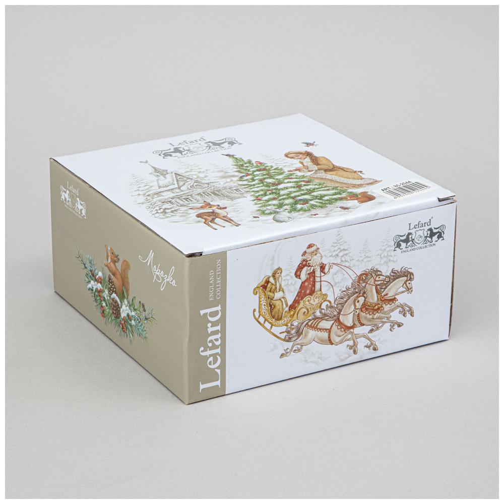 ТМ LEFARD эксклюзивная коллекция "Морозко" создана по мотивам любимой одноименной новогодней сказки, на которой выросли несколько поколений маленьких зрителей. Всем близка история доброй и красивой девушки Настеньки, которую злая мачеха отправила в зимний лес на верную погибель. Детальные композиции, тонкие линии, высокое качество печати на тонкостенном белоснежном фарфоре превращает изделия в ожившие сюжеты. Разнообразие посуды и предметов сервировки добавят волшебства и красок в Ваш дом и порадует всех тех, кто сохранил в душе детскую радость и предвкушение чуда в самый ожидаемый праздник в году. Оригинальная упаковка. Прекрасный подарок. Вся продукция сертифицирована и безопасна для контакта с пищевыми продуктами. Можно использовать в СВЧ, не рекомендуется мыть в посудомоечных машинах во избежание повреждения золотой отводки (деколи) на изделиях.