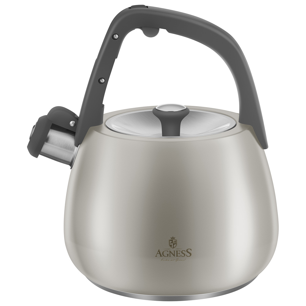 Чайник AGNESS - это надежность, функциональность и стильный дизайн. Чайник выполнен из нержавеющей стали - наиболее прочного и гигиеничного материала. Преимущества: • Легко наливать воду. Используя клапан на ручке чайника, вы легко сможете налить воду. Просто нажмите на клапан, чтобы открыть носик чайника. • Встроенный свисток подскажет, что вода в чайнике закипела и его пора снимать с плиты. • Благодаря стильному дизайну чайник AGNESS украсит любую кухню • Подходит для всех типов плит, включая Индукционные Металлический чайник AGNESS - незаменимый атрибут в Вашем доме, а также прекрасный подарок для Ваших близких. Внимание! Не нагревайте пустой чайник. Рекомендуется нагревать чайник, наполнив его на 2/3 от общего объема. Следите, чтобы диаметр конфорки совпадал или был меньше диаметра дна чайника. Пламя от газовой конфорки не должно попадать на корпус чайника. Не подходит для использования в микроволновой печи и посудомоечной машине. Рекомендована ручная мойка.