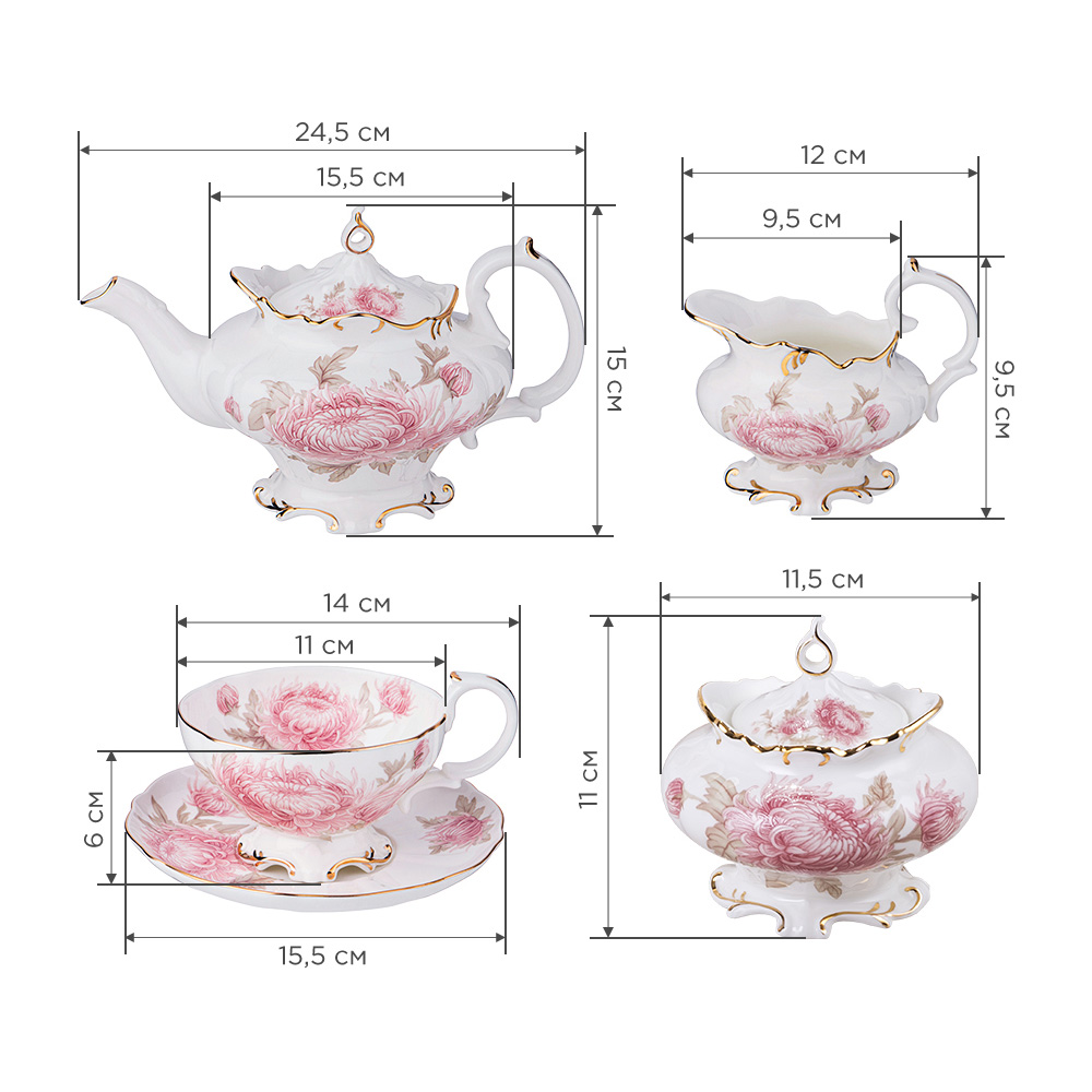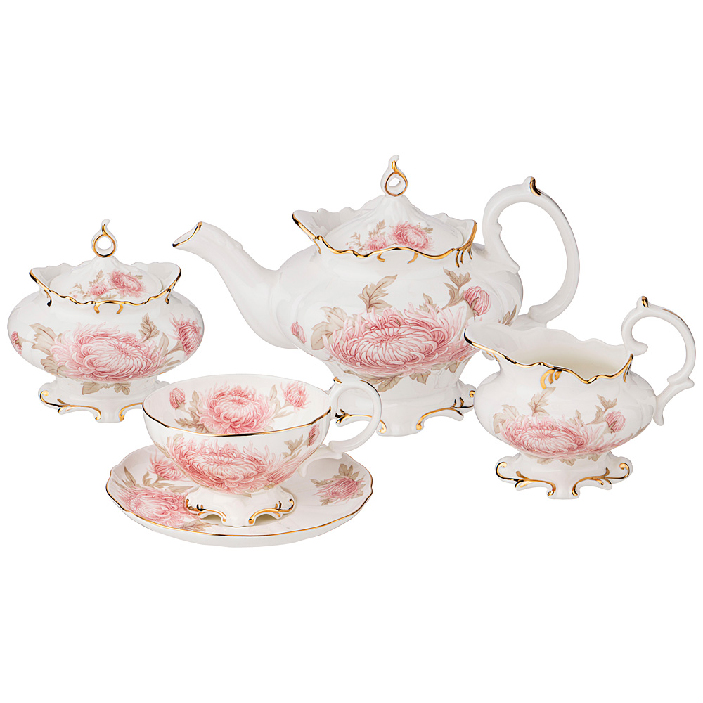 ТМ LEFARD представляет коллекцию "Астра". Этот цветок является одним из чудес мира растений, в переводе с греческого языка означает "звезда". По старинной легенде, этот цветок вырос из пылинки, упавшей со звезды. Этот небесный цветок объединяет в себе основные запахи осени, доносящие свежесть дождя и игру багряных красок. Посуда этой коллекции безупречно впишется практически в любой интерьер. Рельефный декор, тонкая золотая полоса, блеск и прозрачность тонкостенного фарфора делают особенно привлекательной эту коллекцию. Это прекрасный подарок. Не рекомендуется мыть в посудомоечной машине, нельзя использовать в микроволновой печи. Комплектность: чайник 800 мл, сахарница 350 мл, молочник 200 мл, чашка 250 мл 6 шт., блюдце 16 см 6 шт.