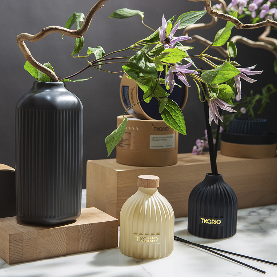 Время диффузии: 14-16 недель, в зависимости от количества фибровых палочек. Для создания ароматической композиции использовались отдушки из Англии.