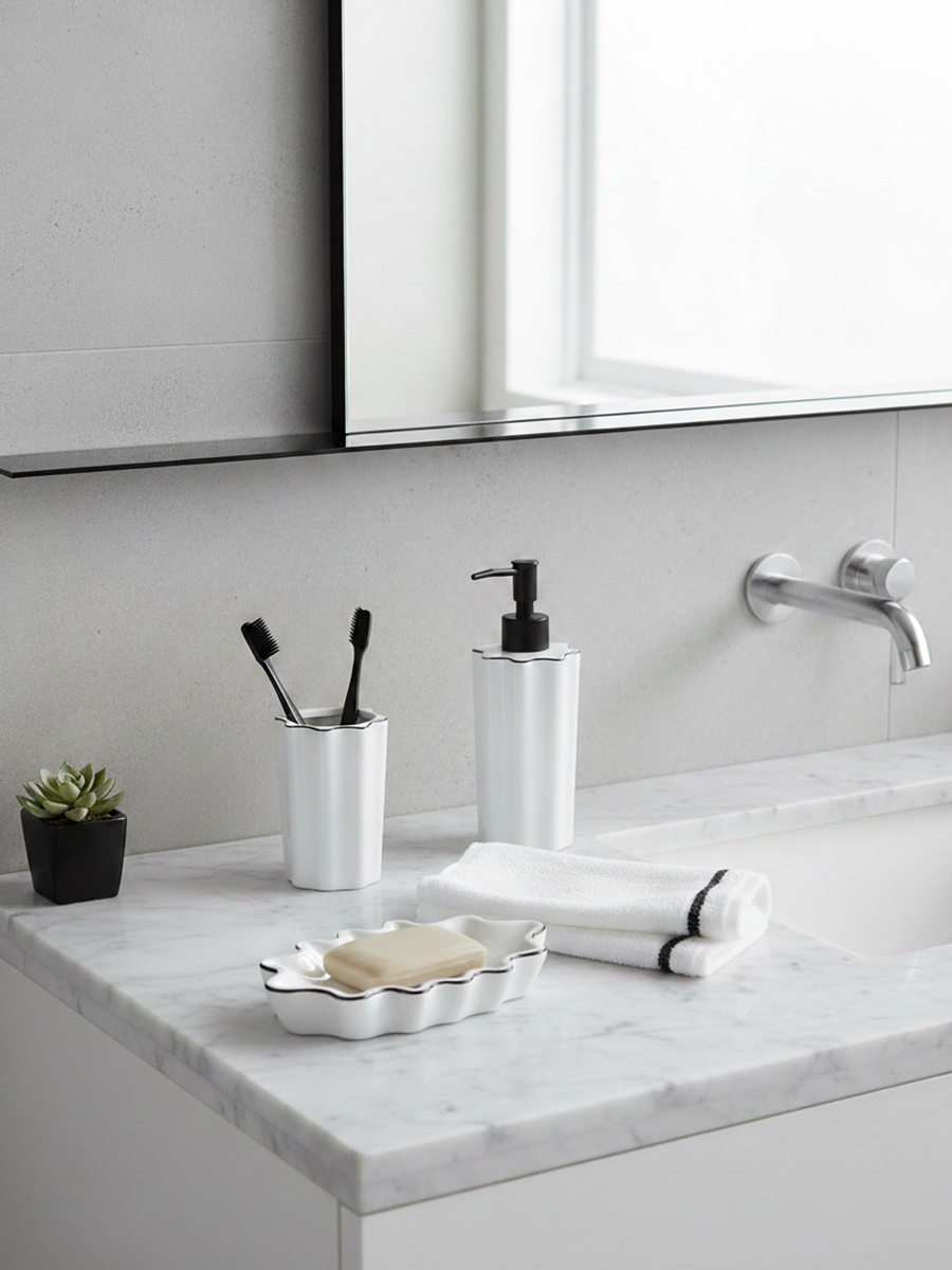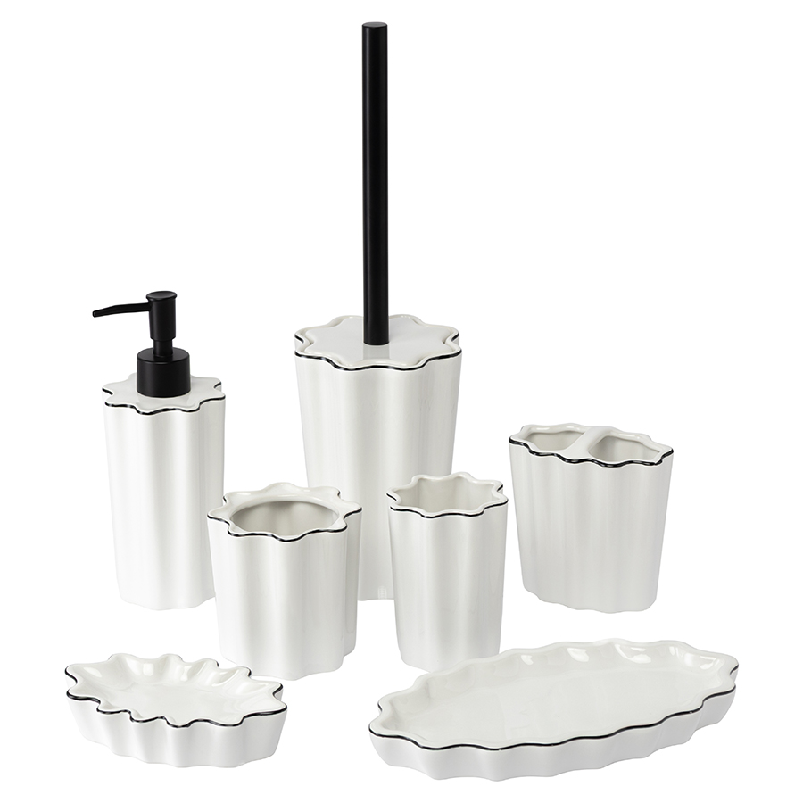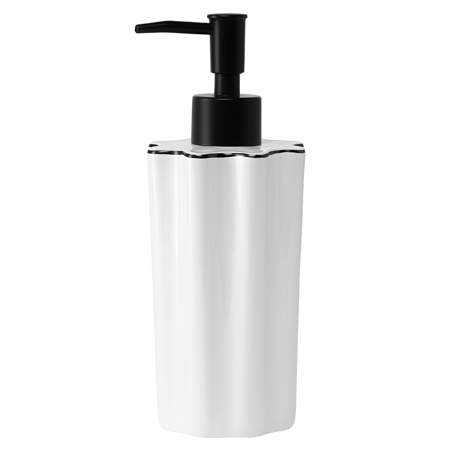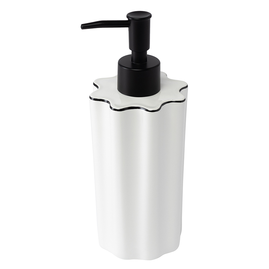 Диспенсер для жидкого мыла в сочетании с другими аксессуарами для ванной комнаты из коллекции Camellia привнесет в интерьер атмосферу спокойствия и природной гармонии. Он понравится тем, кто стремится найти в повседневных ритуалах возможность для эстетического наслаждения. Классическое сочетание белого и черного оттенков, приятная на ощупь волнообразная форма корпуса, эргономичный дизайн делают диспенсер универсальным аксессуаром. Он удачно дополнит обстановку ванной комнаты в любом стиле.
