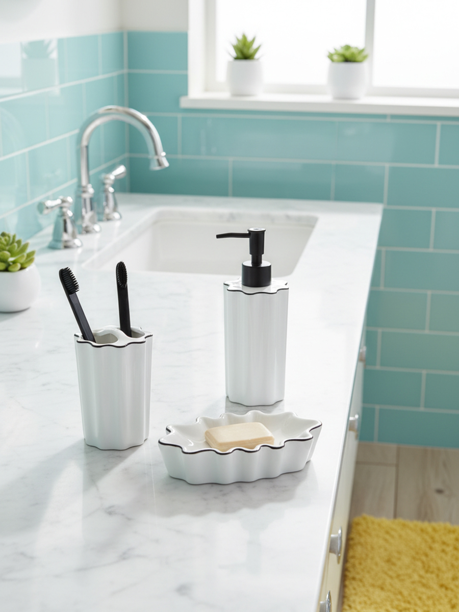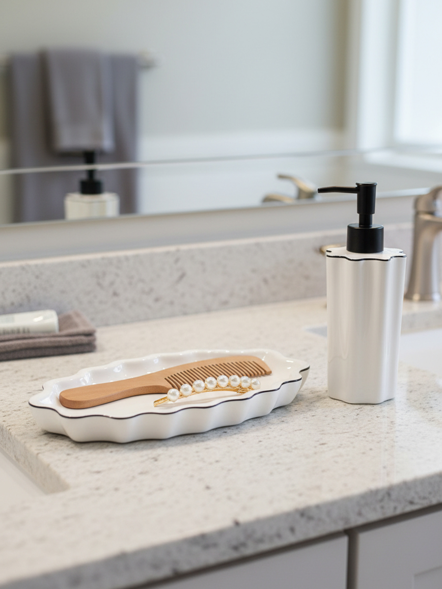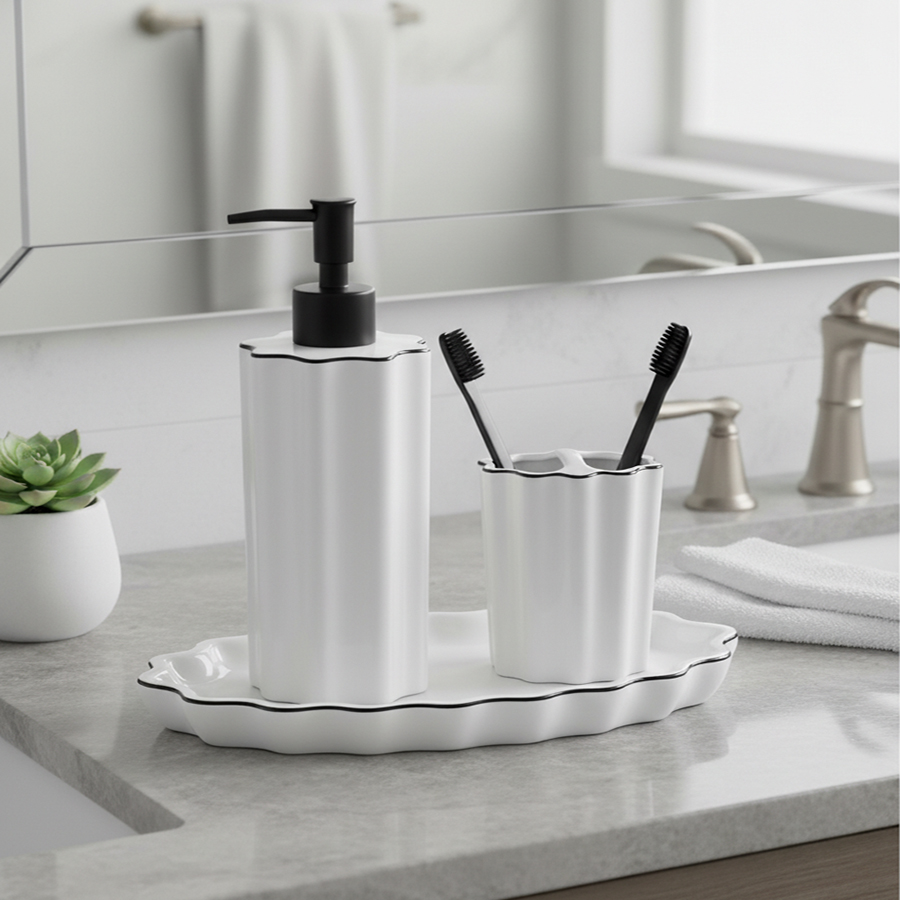 Диспенсер для жидкого мыла в сочетании с другими аксессуарами для ванной комнаты из коллекции Camellia привнесет в интерьер атмосферу спокойствия и природной гармонии. Он понравится тем, кто стремится найти в повседневных ритуалах возможность для эстетического наслаждения. Классическое сочетание белого и черного оттенков, приятная на ощупь волнообразная форма корпуса, эргономичный дизайн делают диспенсер универсальным аксессуаром. Он удачно дополнит обстановку ванной комнаты в любом стиле.