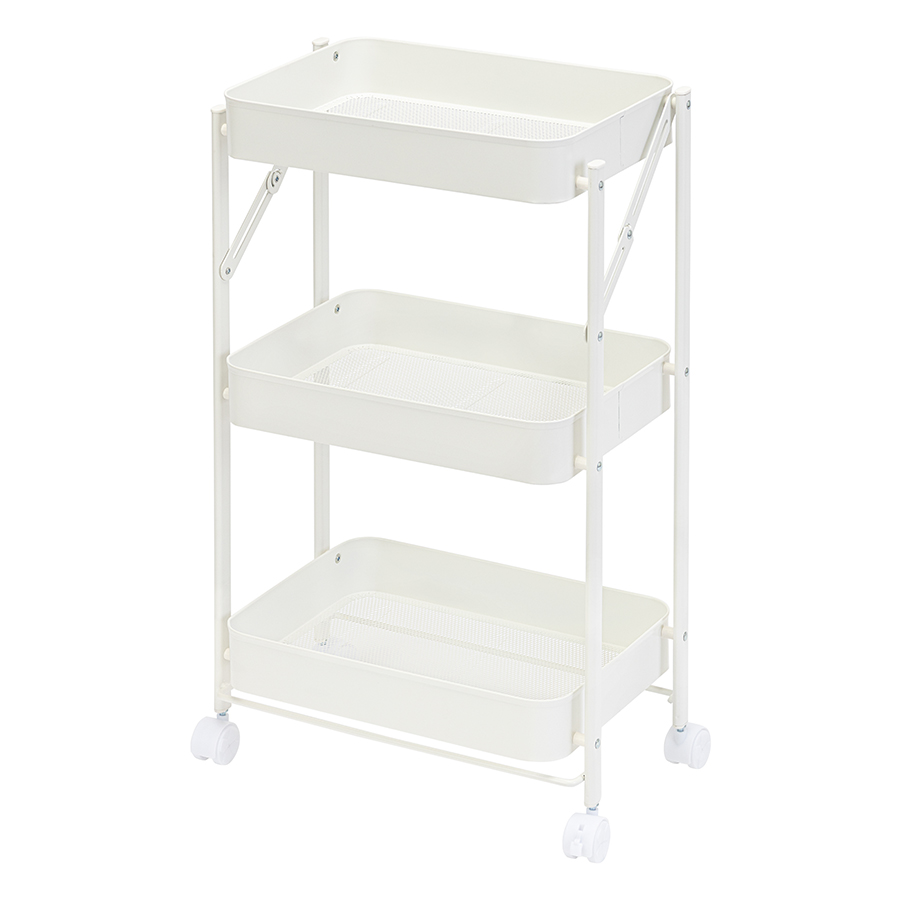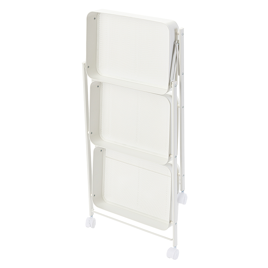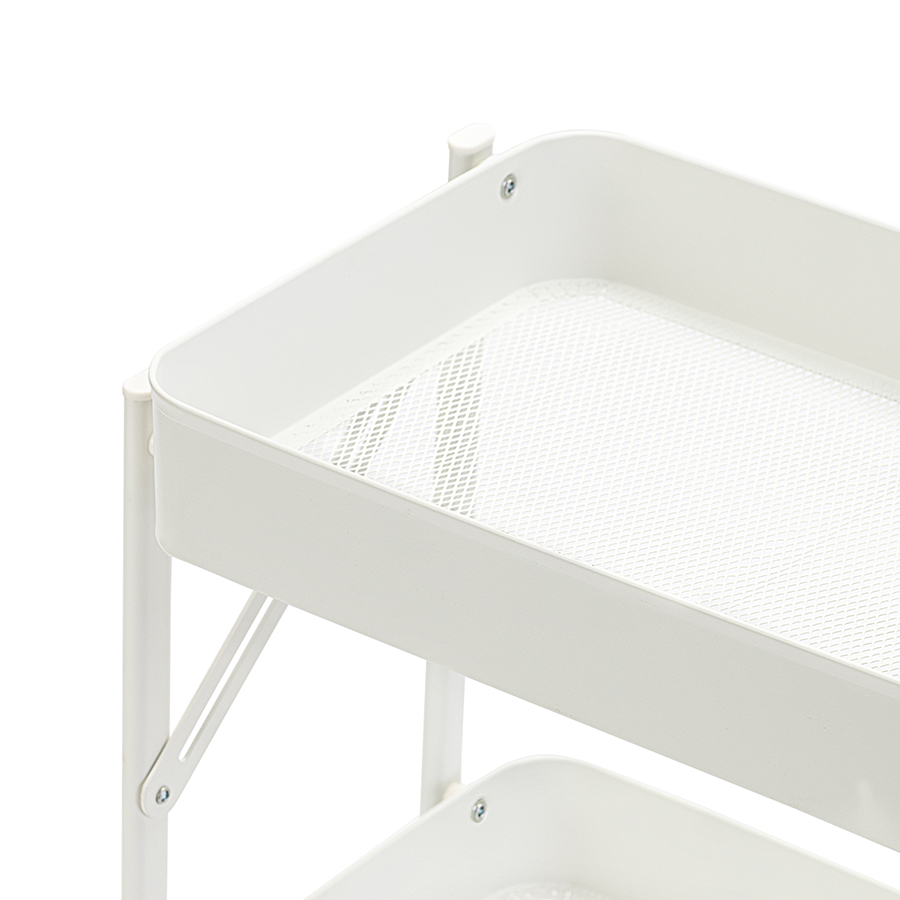 Материал: сталь, полипропилен. Размер изделия: 47х27,5х73 см, диаметр колес — 4 см, высота боковых сторон полок - 6,5 см, вес — 2,84 кг, максимальная нагрузка — 24 кг. Цвет белый.