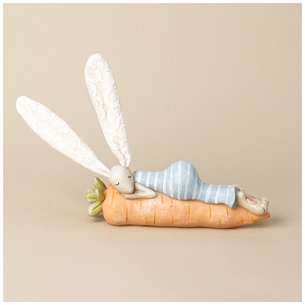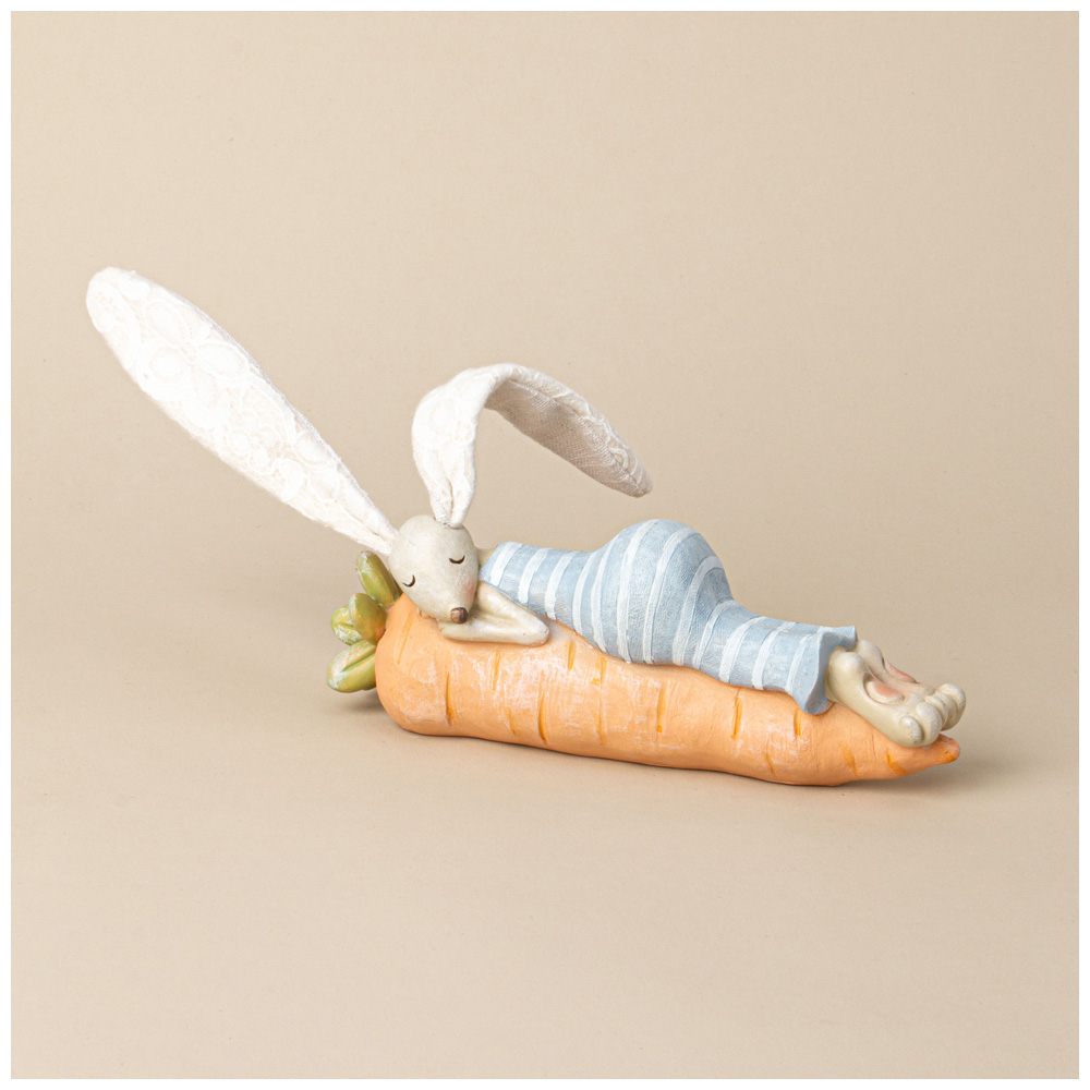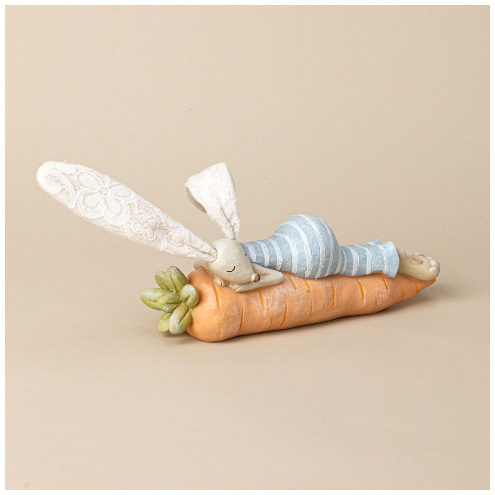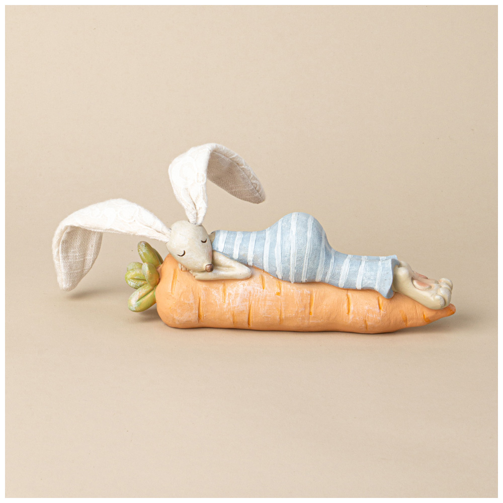 Эта восхитительная фигурка кролика, беззаботно устроившегося на сочной моркови, олицетворяет весеннее настроение и атмосферу уюта. С милой улыбкой и расслабленным выражением лица, он выглядит так, будто наслаждается теплыми солнечными лучами, придавая вашему интерьеру нотку игривости и радости.