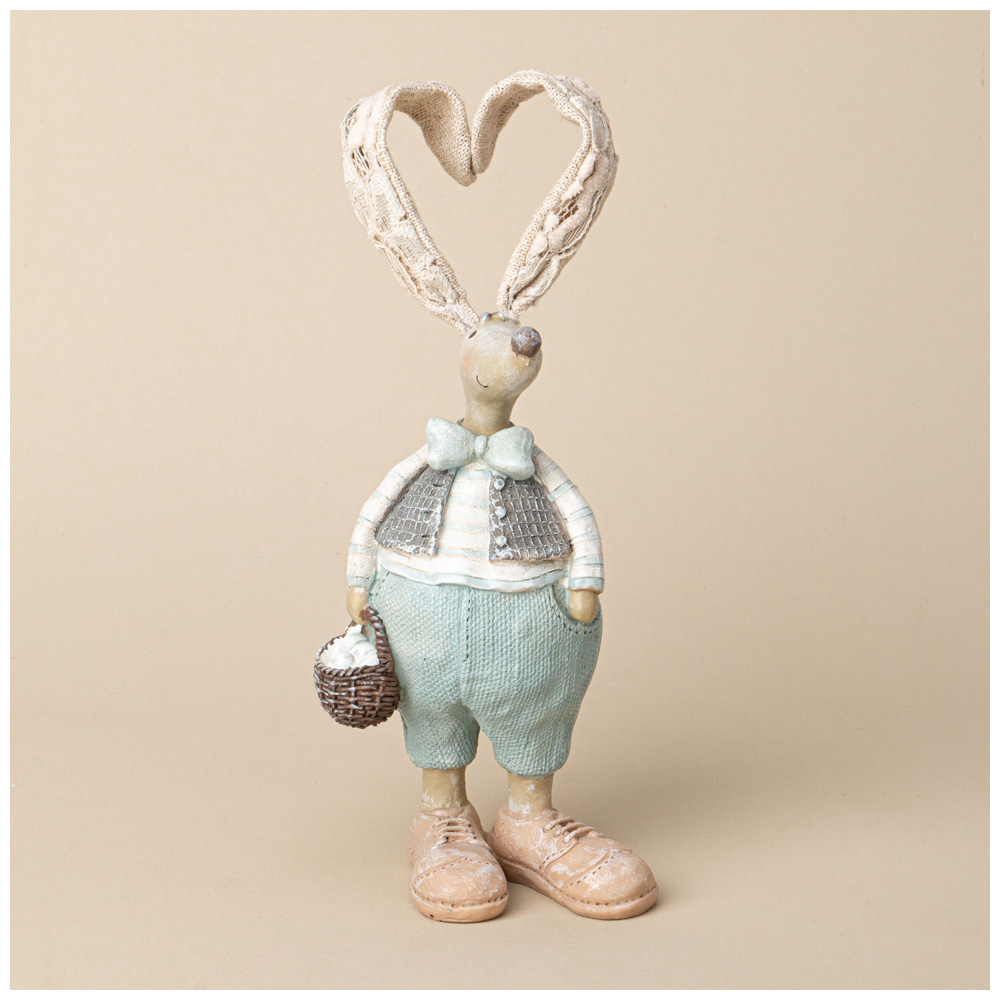 Его длинные, изящные уши, обрамленные кружевом, добавляют особого очарования и делают фигурку ещё более уникальной. В одной лапке заяц уверенно держит маленькую корзинку, которая словно приглашает на сказочное приключение. Этот забавный персонаж станет прекрасным акцентом в любом интерьере, вызывая улыбки и создавая атмосферу праздника.