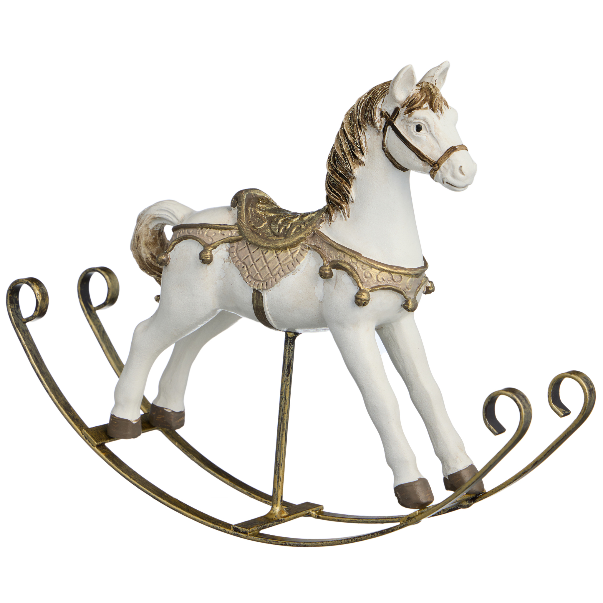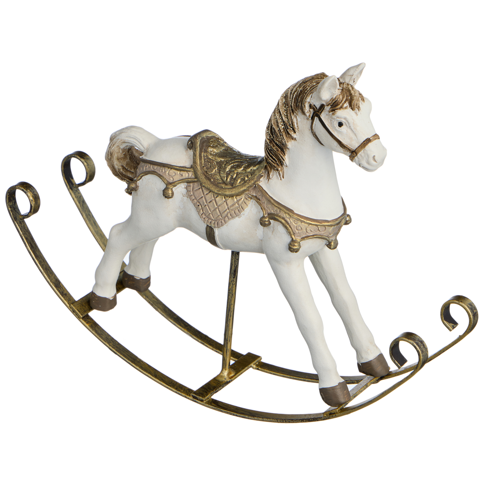 Изготовлен из прочного полистоуна — материал передаёт мягкость керамики, но не боится времени. Белая поверхность с матовым блеском, золотые акценты на уздечке, седле и копытах — всё продумано до мелочей. Даже дуги качалки — не просто элемент, а часть дизайна: лаконичные, грациозные, как будто выкованные для дворца.