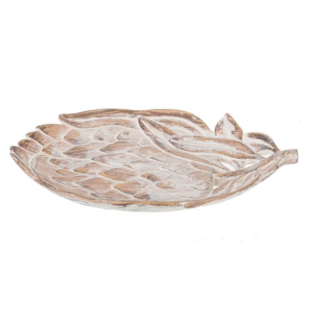 Декоративное блюдо из полимерных материалов выполнено в оригинальном дизайне, имитирующем лист. Изысканная форма и текстура с эффектом потертости придают изделию винтажный шарм и благородство. Универсальная цветовая гамма с сочетанием бежевого и белого оттенков позволяет гармонично вписать его в интерьер любого стиля – от классики до прованса. Это изделие станет стильным элементом декора, может использоваться для хранения мелочей, украшений или в качестве самостоятельного украшения интерьера. Лёгкий, но прочный материал обеспечивает долговечность и удобство в уходе.