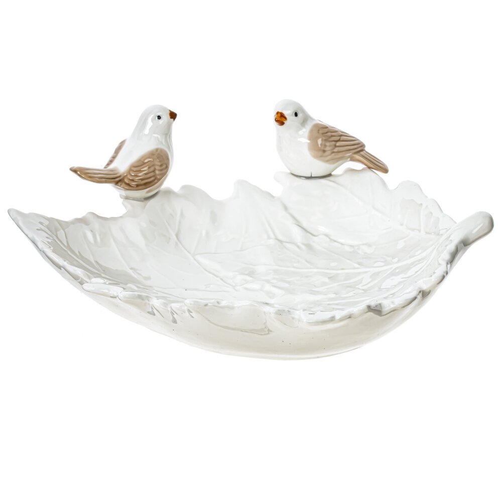 Декоративное блюдо из фарфора станет изысканным украшением вашего интерьера. Блюдо выполнено в виде большого листа с утонченными прожилками и украшено двумя фигурками птиц, что добавляет ему особого уюта и очарования. Такое изделие гармонично впишется в любую обстановку – будь то классика или современный стиль. Блюдо можно использовать как самостоятельный элемент декора, так и для сервировки сладостей, фруктов или небольших угощений. Фарфор отличается высокой прочностью и долговечностью, а глянцевая поверхность делает блюдо особенно нарядным. Этот аксессуар прекрасно подойдет в качестве подарка для ценителей изысканных вещей и станет необычным акцентом в любой комнате вашего дома.