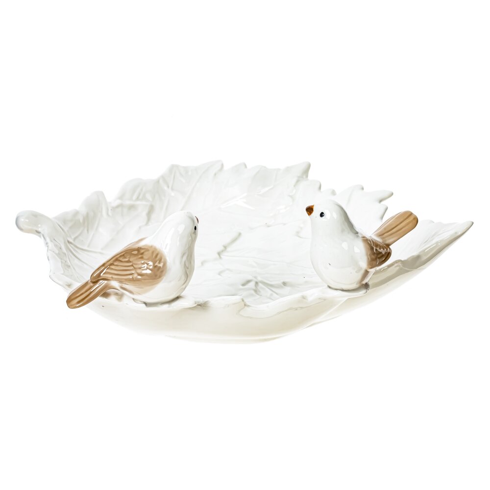 Декоративное блюдо из фарфора станет изысканным украшением вашего интерьера. Блюдо выполнено в виде большого листа с утонченными прожилками и украшено двумя фигурками птиц, что добавляет ему особого уюта и очарования. Такое изделие гармонично впишется в любую обстановку – будь то классика или современный стиль. Блюдо можно использовать как самостоятельный элемент декора, так и для сервировки сладостей, фруктов или небольших угощений. Фарфор отличается высокой прочностью и долговечностью, а глянцевая поверхность делает блюдо особенно нарядным. Этот аксессуар прекрасно подойдет в качестве подарка для ценителей изысканных вещей и станет необычным акцентом в любой комнате вашего дома.