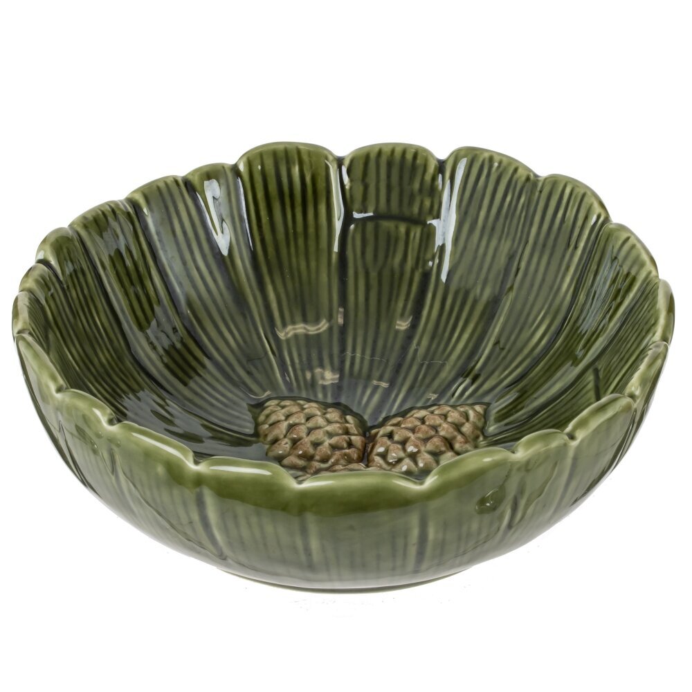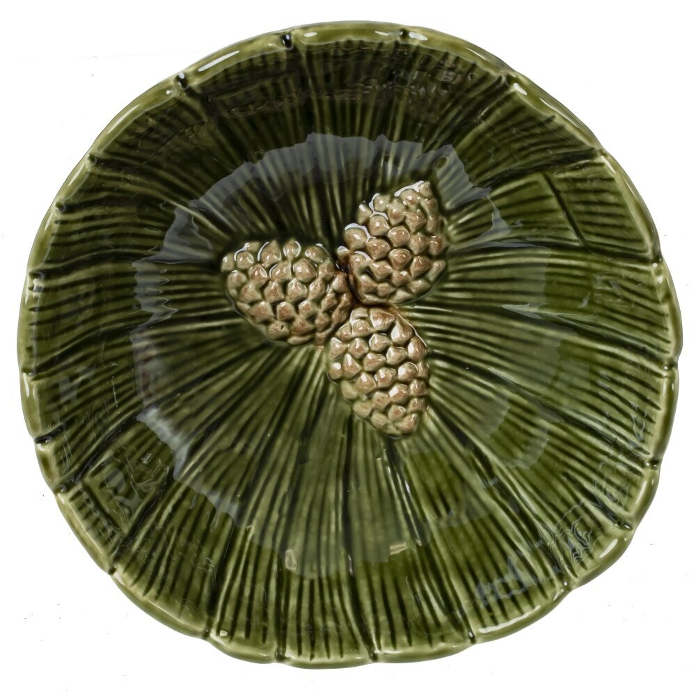 Это блюдо, выполненное из фарфора, прекрасно демонстрирует гармонию природы. Его размеры делают его идеальным для сервировки закусок или десертов, а также для использования в качестве стильного элемента декора. Блюдо выполнено в форме цветка. Глубокий зеленый цвет присваивает ему свежесть и живость, вызывая ассоциации с лесом и природой. В центре блюда изображеныхвойные шишки, выполненные в теплых коричневых тонах, которые контрастно подчеркивают насыщенность зеленой основы. Эта изящная деталь добавляет элемент утонченности и делает блюдо потрясающе привлекательным в любой обстановке.