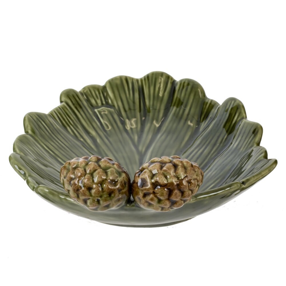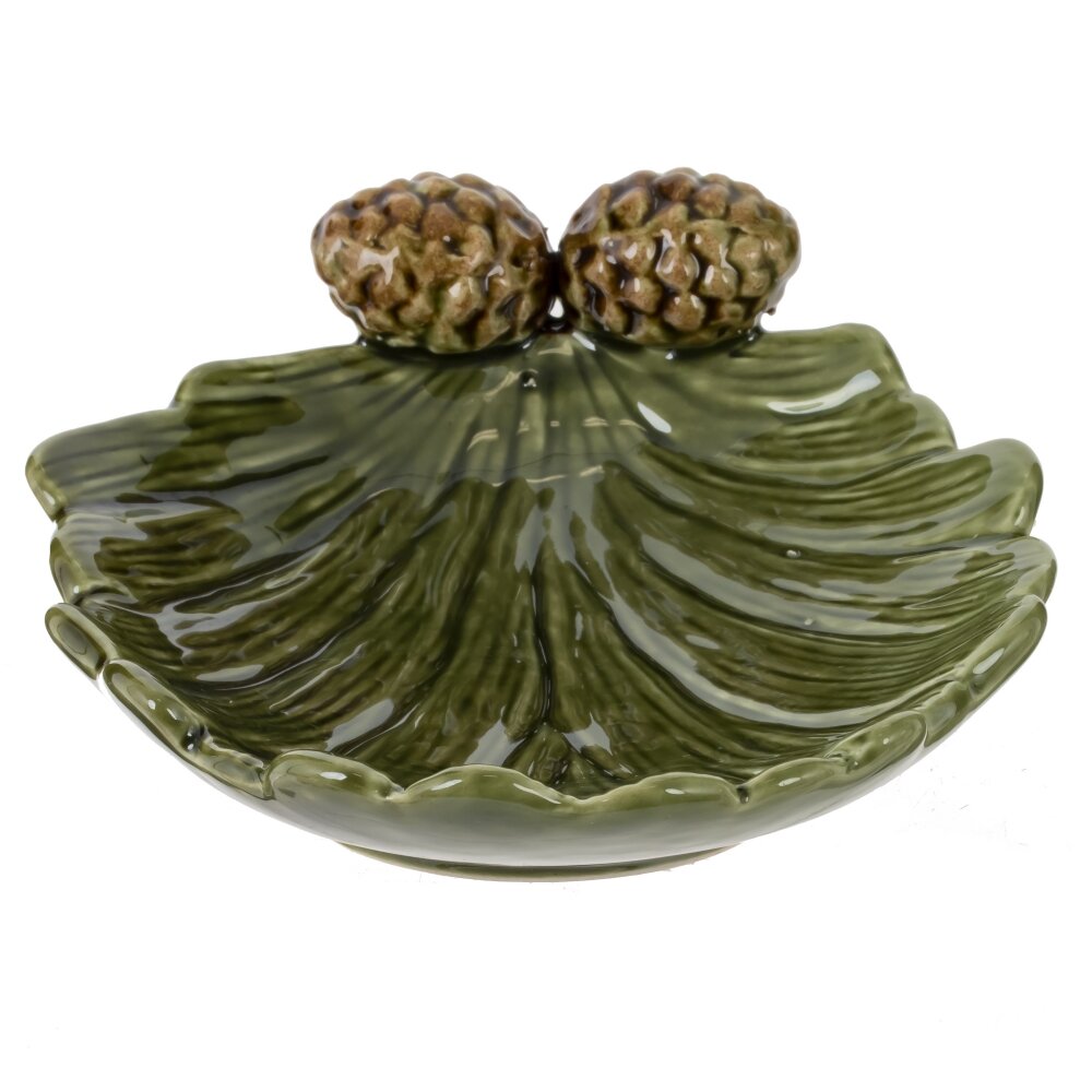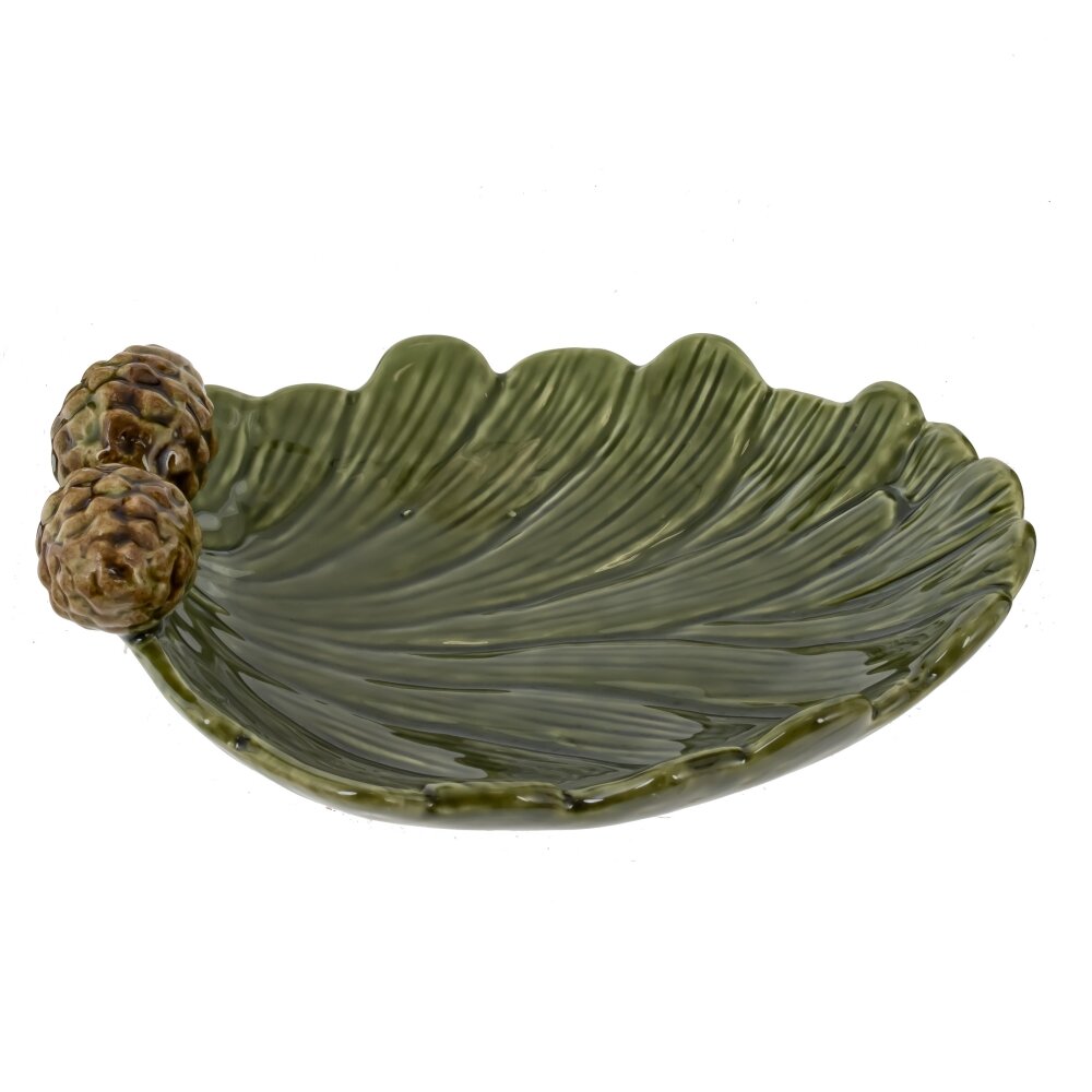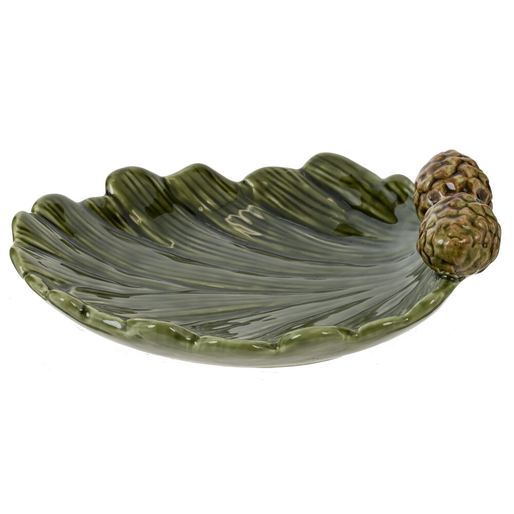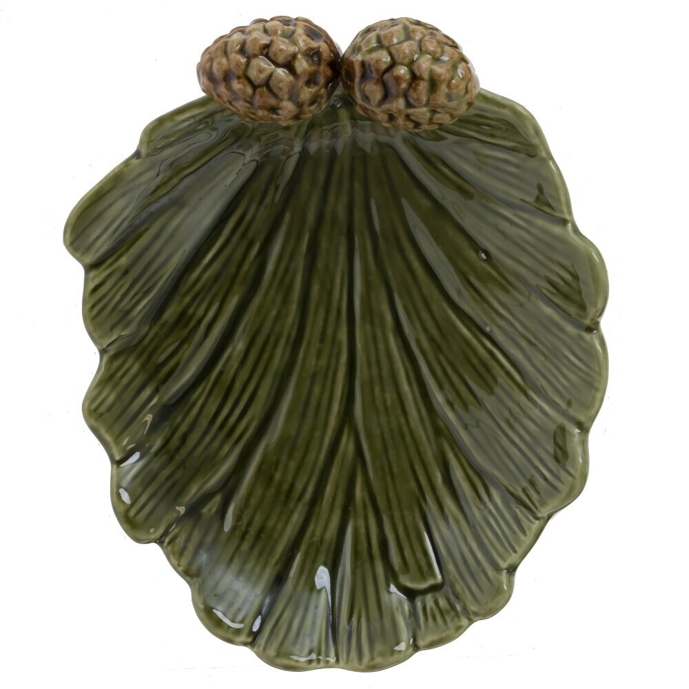 Это блюдо, выполненное из фарфора, прекрасно демонстрирует гармонию природы. Его размеры делают его идеальным для сервировки закусок или десертов, а также для использования в качестве стильного элемента декора. Блюдо выполнено в форме листа. Глубокий зеленый цвет присваивает ему свежесть и живость, вызывая ассоциации с лесом и природой. На краю блюда расположены аккуратные фигурки двух хвойных шишек, выполненные в теплых коричневых тонах, которые контрастно подчеркивают насыщенность зеленой основы. Эта изящная деталь добавляет элемент утонченности и делает блюдо потрясающе привлекательным в любой обстановке.