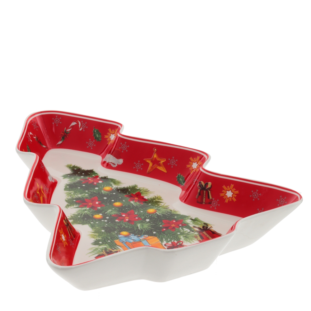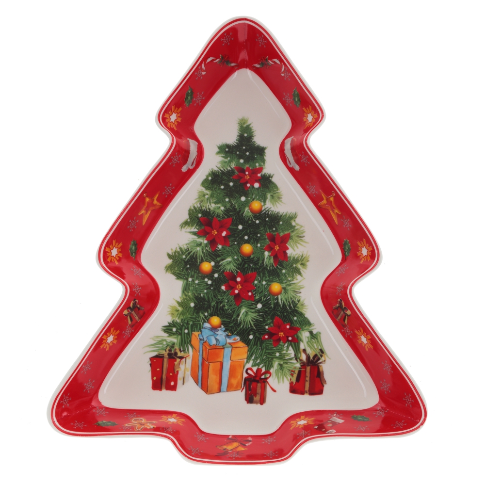 Тарелка в форме елочки выполнена из фарфора, покрыта прочной глазурью и раскрашена в яркие цвета, которые не только создадут праздничное настроение, но и будут отлично сочетаться с любым дизайном кухни, столовой и другой сервировочной посудой.