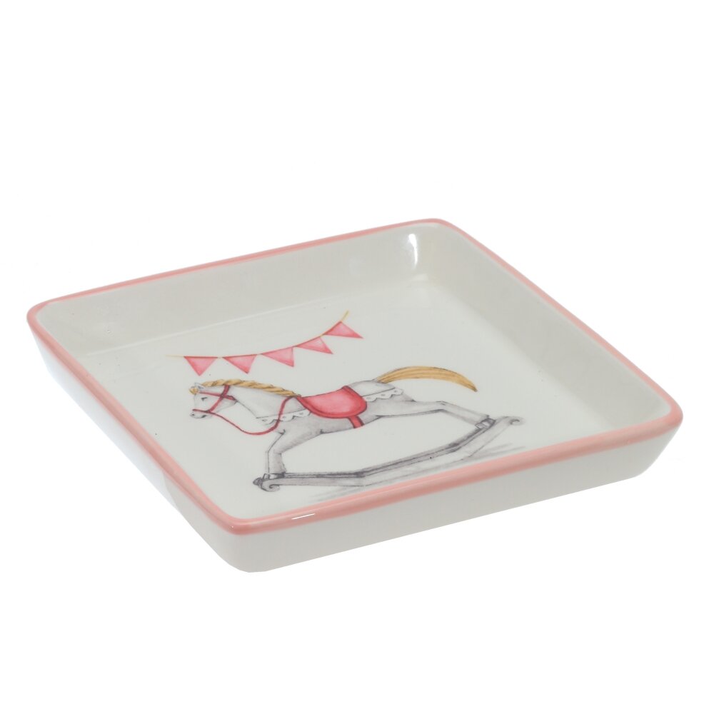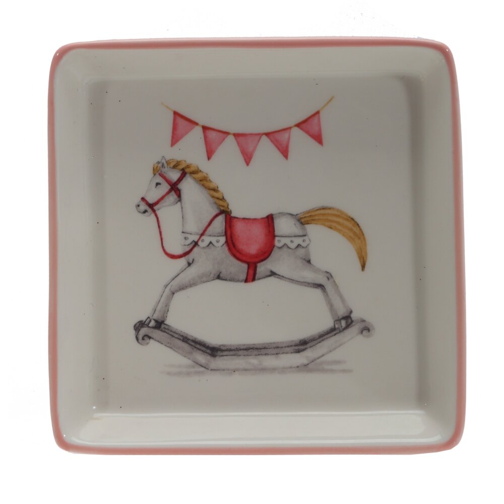 Керамическая тарелка с изображением лошадки-качалки — это не просто предмет сервировки, а настоящее украшение стола. Очаровательный рисунок с лошадкой вызывает ассоциации с детством, теплом и уютом, создавая особую атмосферу за каждым приёмом пищи. Изготовленная из прочной керамики, тарелка идеально подходит для подачи завтраков, десертов, выпечки или фруктов. Поверхность гладкая, легко очищается, а качественная глазурь сохраняет яркость рисунка надолго. Такая посуда особенно уместна в сервировке праздничного или детского стола, а также может использоваться как декоративный элемент интерьера. Прекрасно подойдёт в подарок на Новый год, день рождения или просто как приятный сувенир.