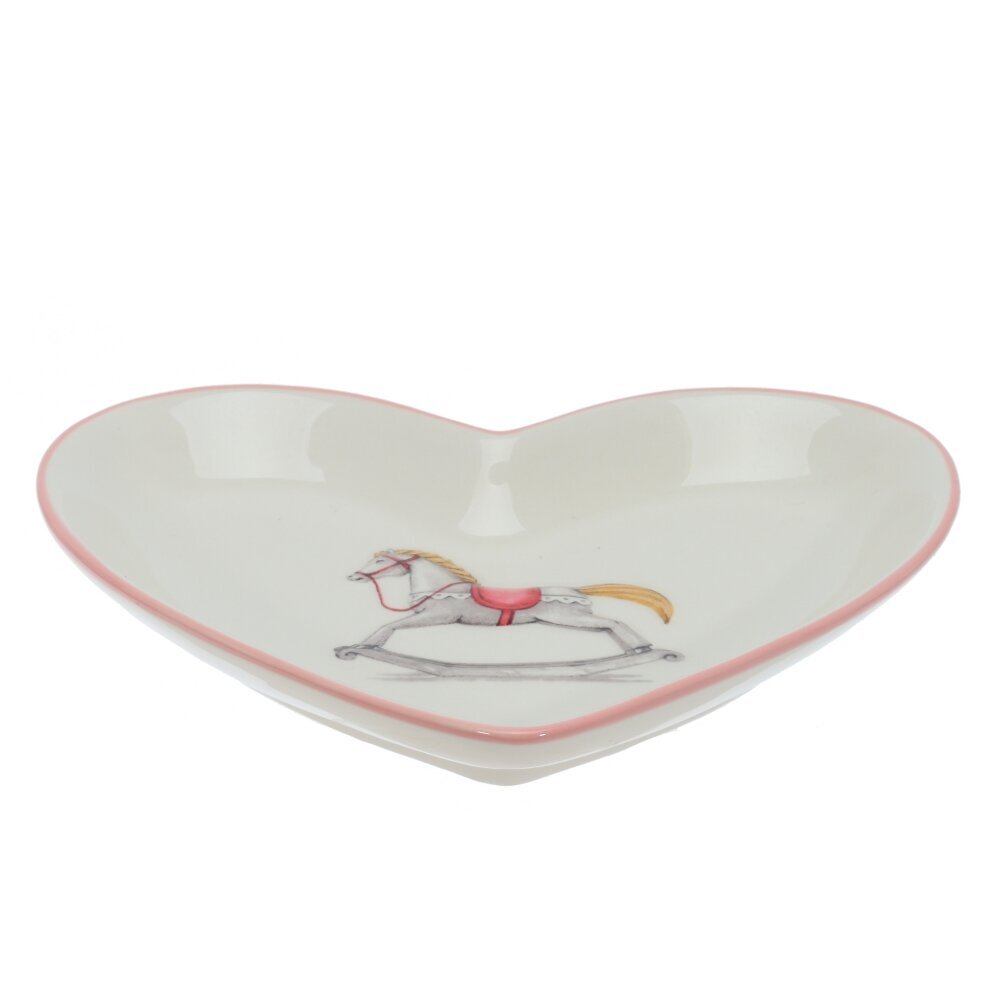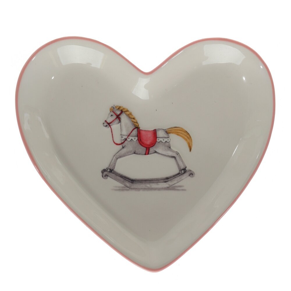 Керамическая тарелка оригинальной формы в виде сердца с изображением лошадки-качалки — изящный и уютный аксессуар для сервировки. Подходит для подачи десертов, фруктов, сладостей или выпечки, а также может использоваться как декоративный элемент интерьера. Милый ретро-рисунок вызывает тёплые ассоциации и создаёт атмосферу уюта и домашнего тепла. Такая тарелка станет прекрасным дополнением праздничного стола, а также милым подарком на день рождения, Новый год, 14 февраля или в любой другой особенный день. Качественная керамика гарантирует долговечность и устойчивость к повседневному использованию.