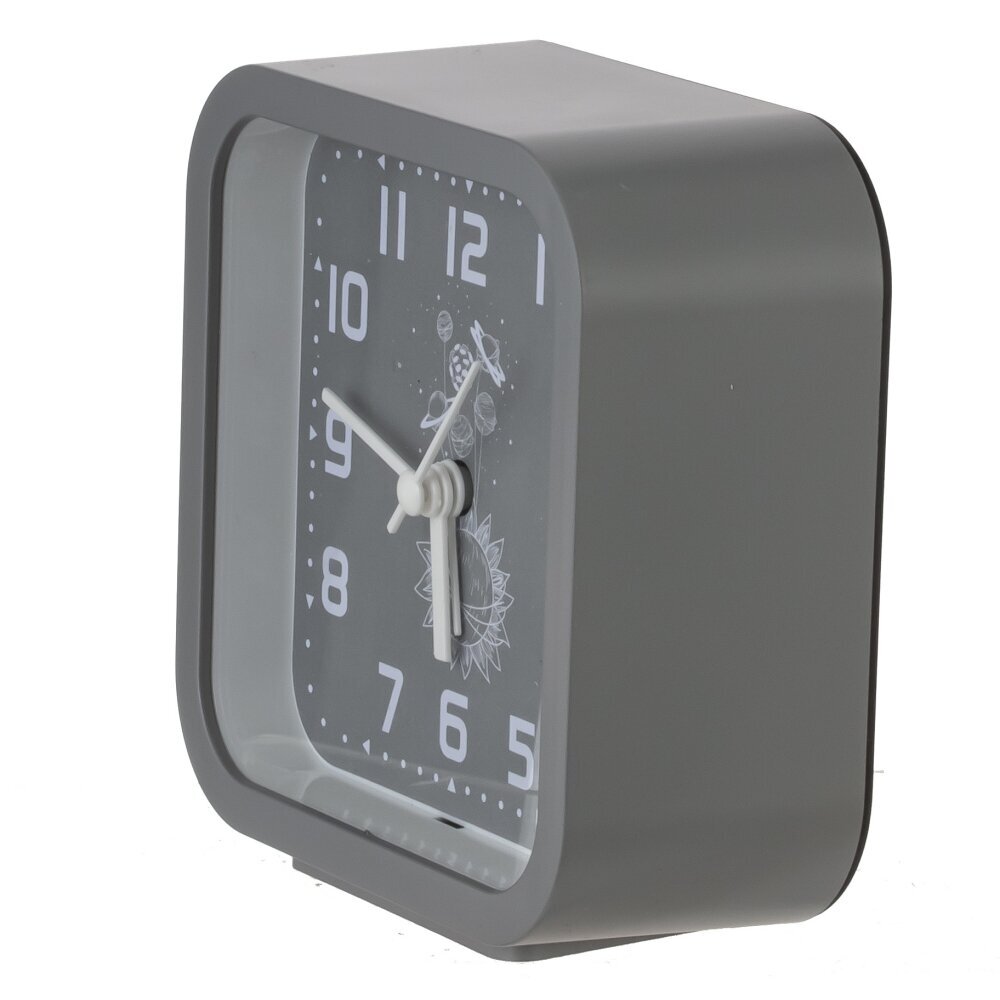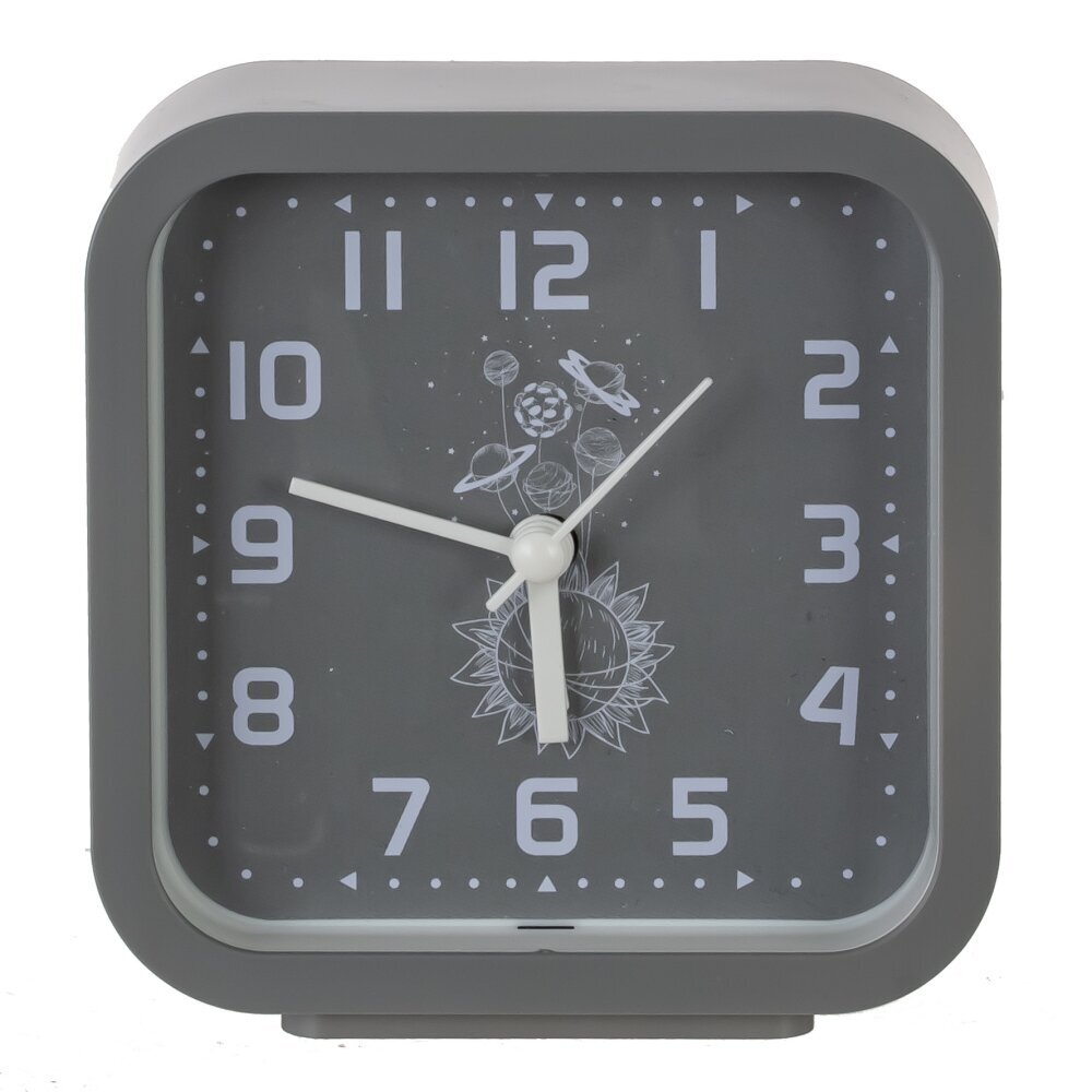 Этот стильный будильник имеет современный квадратный корпус серого цвета, выполненный из полимерных материалов, что обеспечивает его легкость и прочность. Фасад будильника покрыт стеклом, защищающим циферблат от пыли и повреждений. Циферблат 8,5*8,5 см выполнен в тёмных тонах с крупными легко читаемыми арабскими цифрами белого цвета и оригинальным рисунком в виде графических планет и солнца в центре, что придаёт устройству особый декоративный характер. Механизм будильника работает от одной батарейки типа АА (не прилагается), что делает его удобным для использования в любых условиях без необходимости подключения к электросети. Металлические стрелки белого цвета хорошо видны на тёмном фоне, позволяя легко определять время даже с расстояния. Такой будильник гармонично впишется в любой современный интерьер и отлично подойдёт как для спальни, так и для рабочего стола.