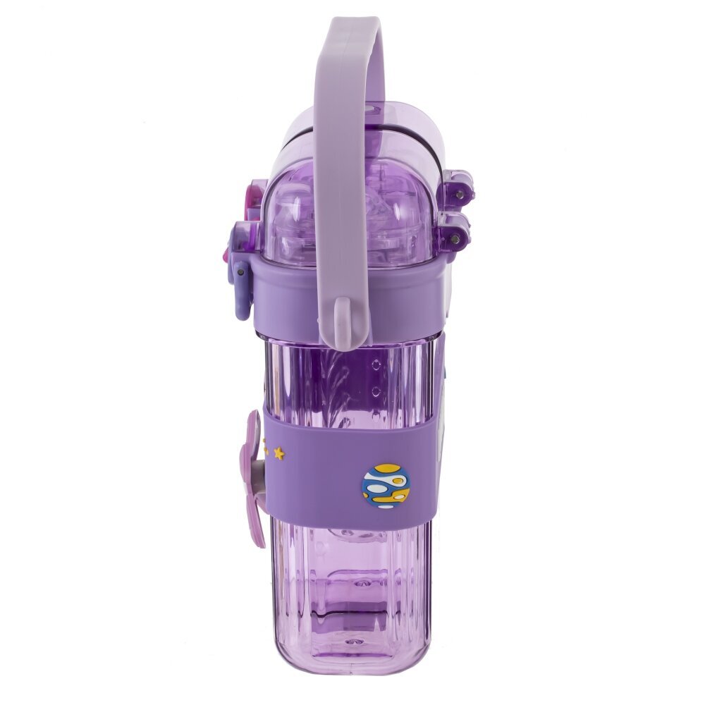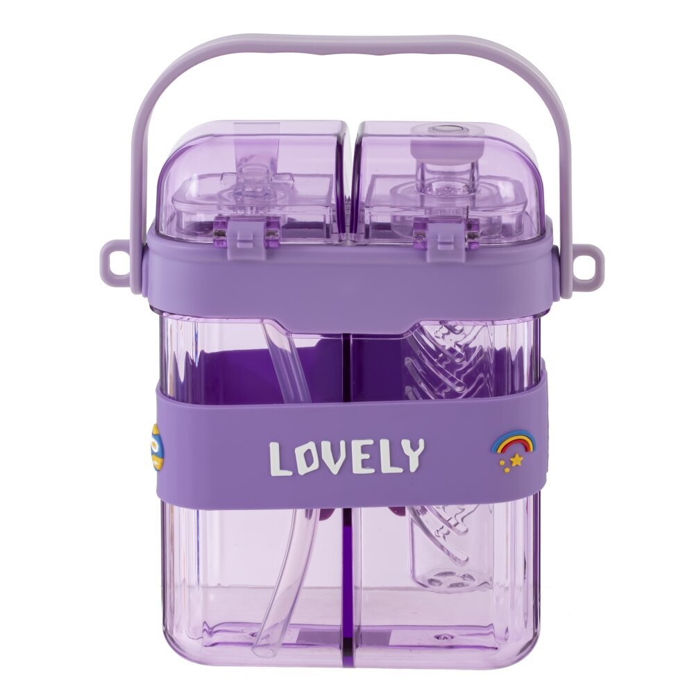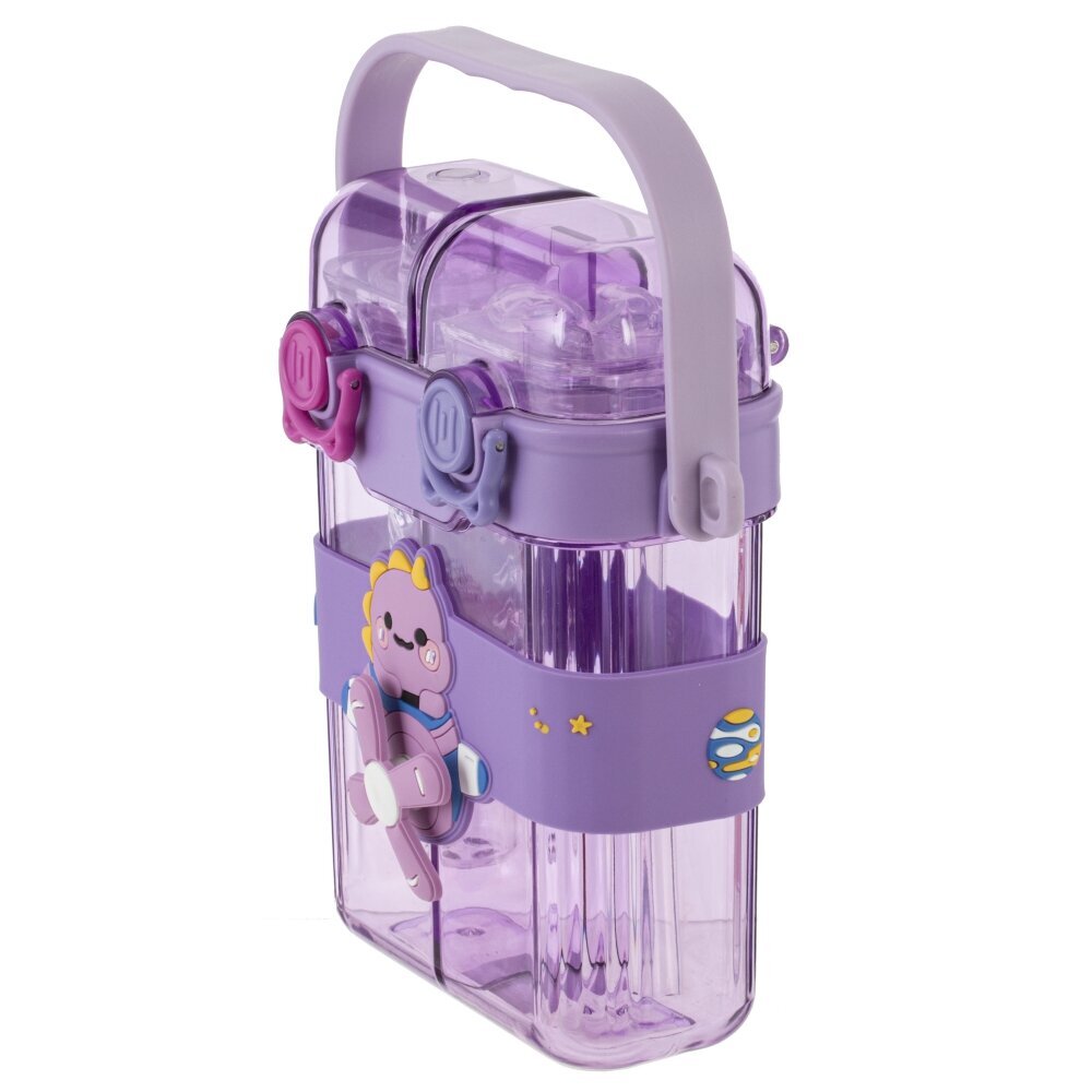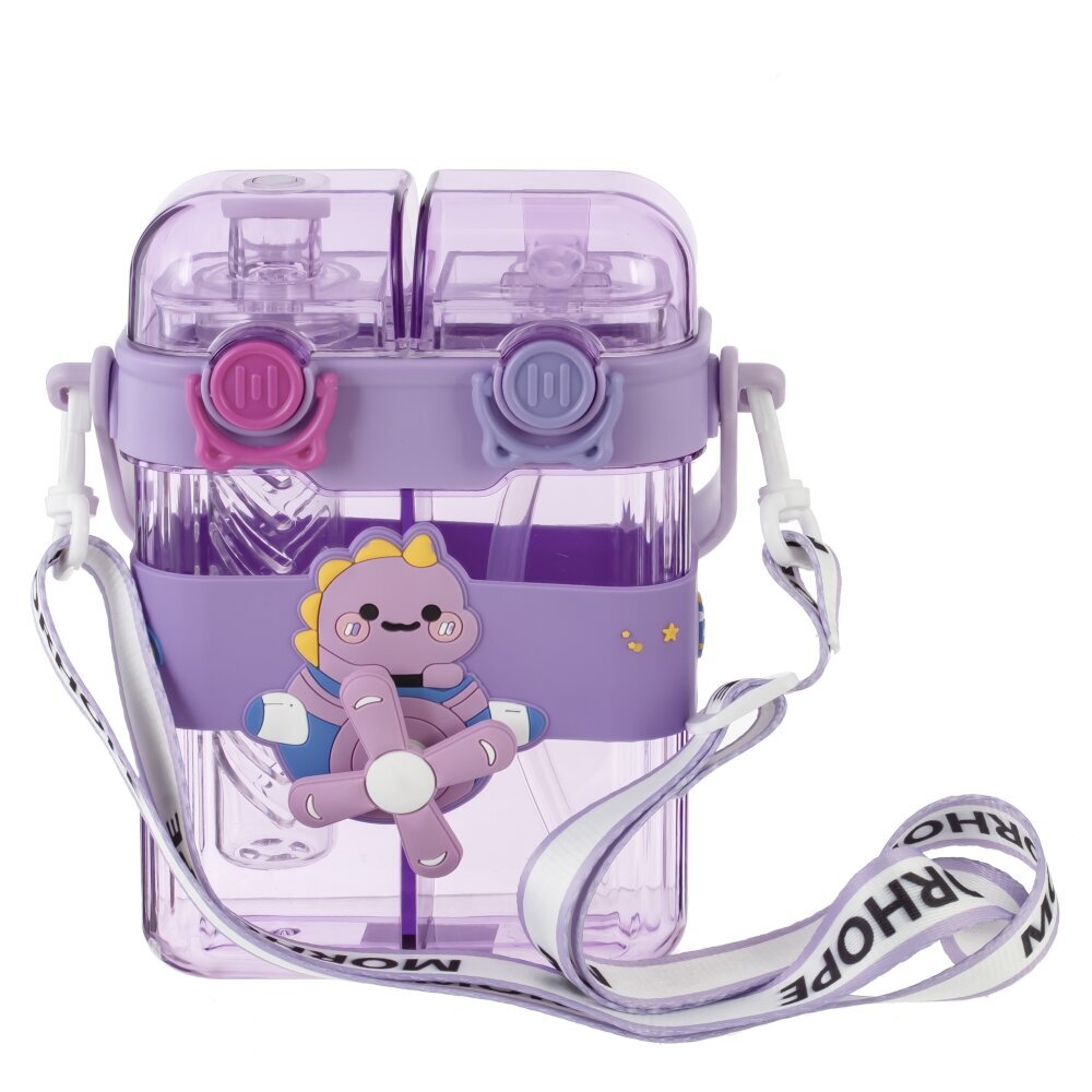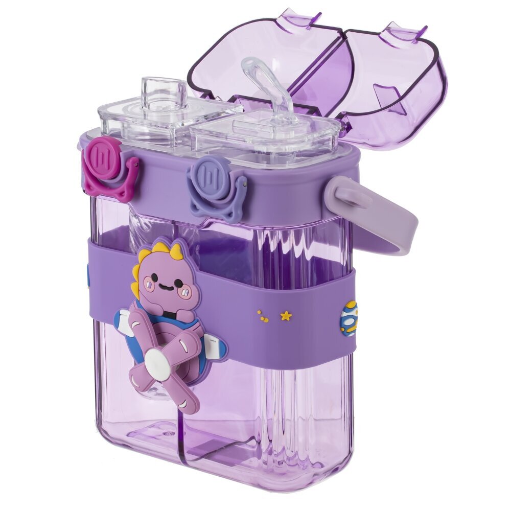 Яркая и оригинальная бутылка объёмом 700 мл. Её корпус выполнен из прозрачного прочного пластика с элементами фиолетового цвета, что делает дизайн стильным и современным. На бутылке имеется забавное изображение милого мультяшного динозавра, сидящего на пропеллере, которое добавляет изделию индивидуальности и обязательно понравится детям. Особенно удобно, что бутылка оснащена двумя независимыми крышками с отдельными кнопками для открытия, что позволяет использовать сразу два отделения для разных напитков. Регулируемый плечевой ремень делает бутылку удобной для переноски на прогулке, в школе или на тренировке. Такой аксессуар станет отличным выбором для активного ребёнка или подростка, заботящегося о своевременном употреблении воды.