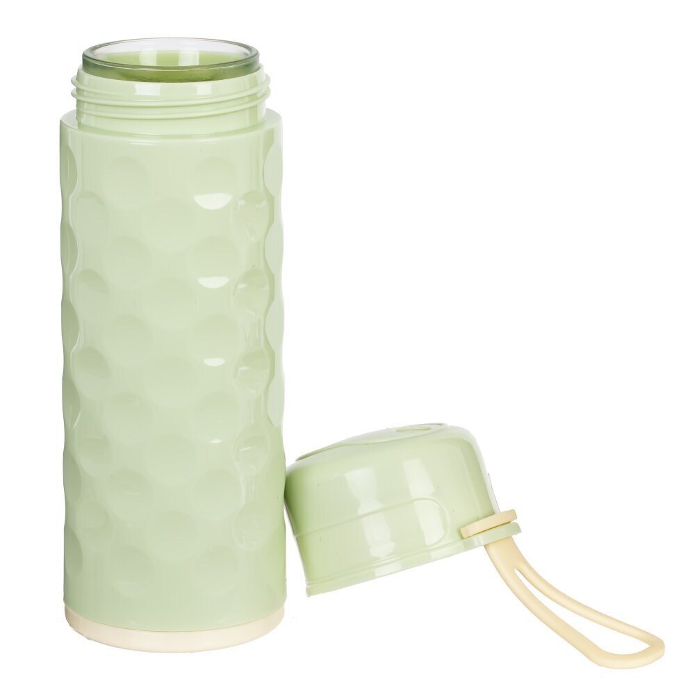 Стильная бутылка для напитков объемом 500 мл, выполненная из прочного стекла с защитной поверхностью из полимерных материалов. Корпус с геометрическим узором смотрится свежо и аккуратно, а широкое горлышко удобно для наливания воды, компота, холодного чая или лимонада. Плотная винтовая крышка из рифлёного пластика обеспечивает надежную герметичность и не скользит в руках; к ней прикреплён ремешок?петля для удобной переноски. Стекло не впитывает запахи и сохраняет вкус напитков, а полимерная оболочка смягчает удары и делает бутылку менее скользкой. Подходит для работы, учебы, прогулок и поездок. Легко мыть и приятно держать в руках. Современный, практичный аксессуар на каждый день. Представлено в четырех вариантах.