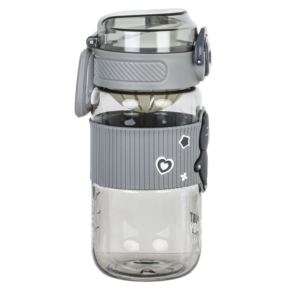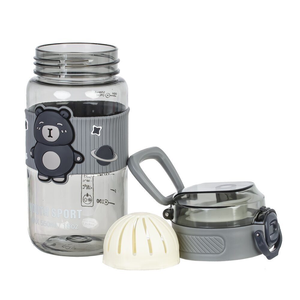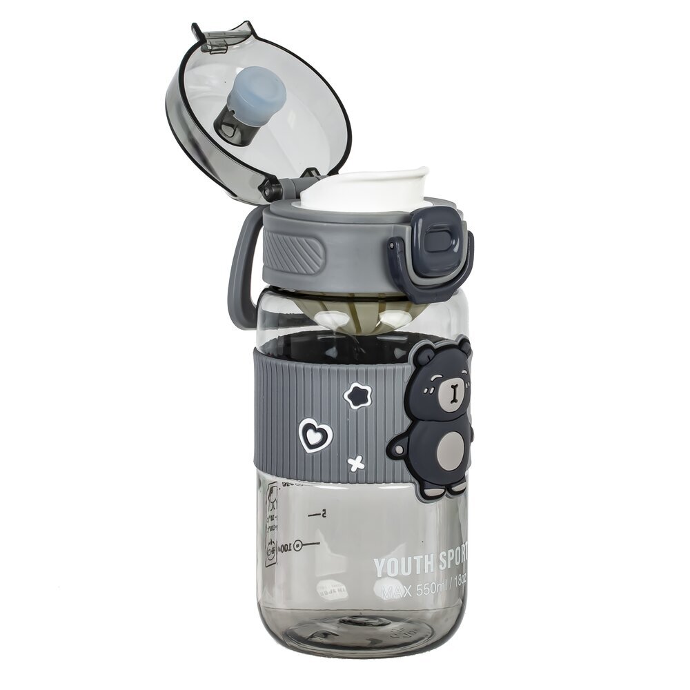 Стильная пластиковая бутылка объёмом 550 мл, предназначенная для воды или других напитков. Её основная особенность — яркий и привлекательный дизайн: на центральной части расположена миловидная фигура медвежонка, что делает бутылку особенно популярной среди детей и подростков. Серый цвет корпуса и крышки придаёт аксессуару современный, универсальный вид. Бутылка оснащена удобной крышкой с защёлкой, которая предотвращает протекание жидкости, а также позволяет легко открывать и закрывать ёмкость одной рукой. На корпусе есть удобная мерная шкала, облегчающая контроль за потребляемым объёмом воды. Благодаря компактному размеру и лёгкому весу бутылка идеально подойдёт для школы, прогулок или занятий спортом. Милая декоративная вставка и яркие элементы делают её отличным выбором для подарка.