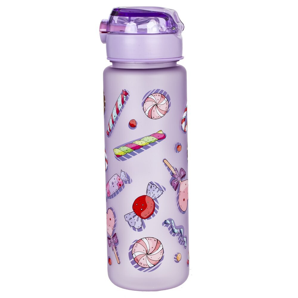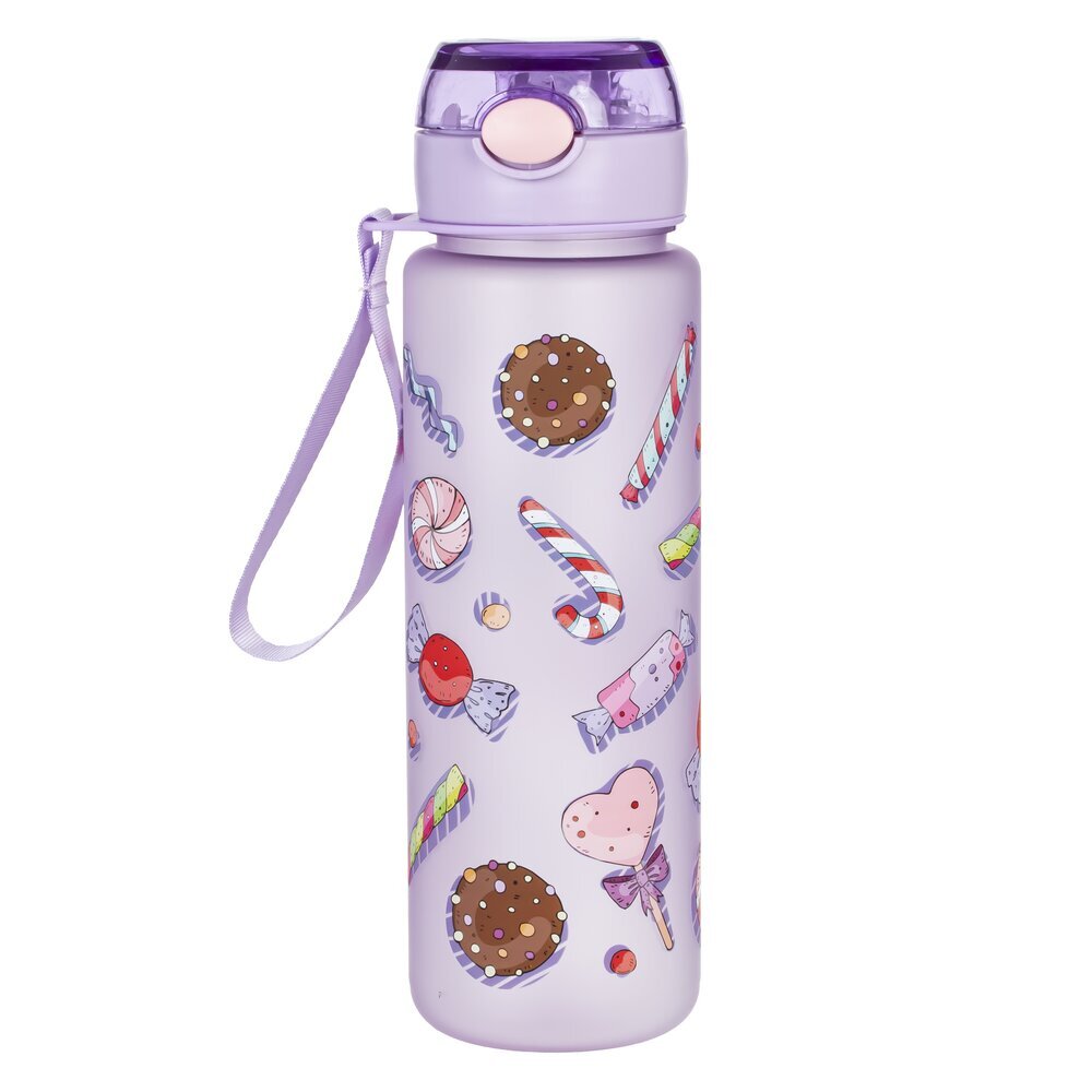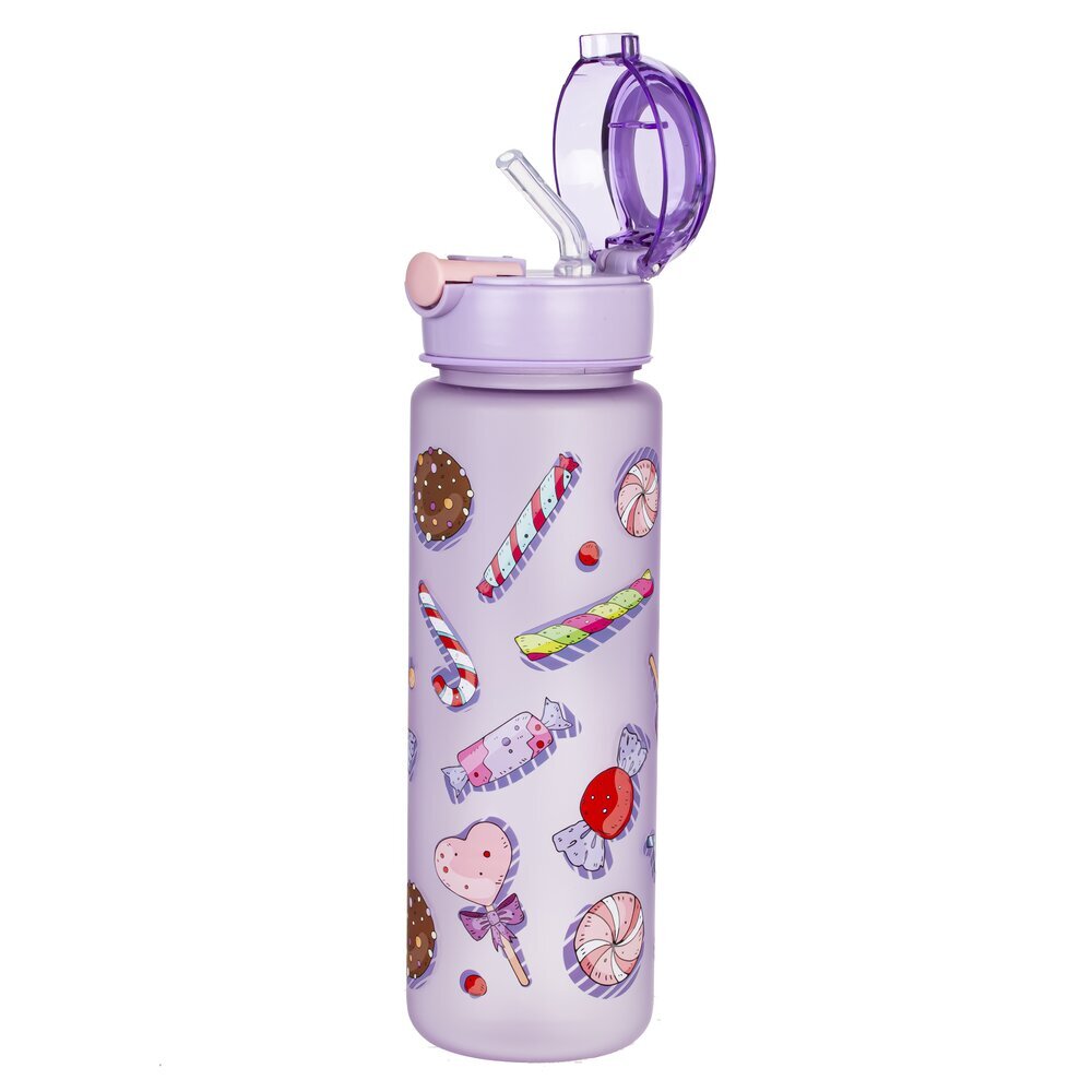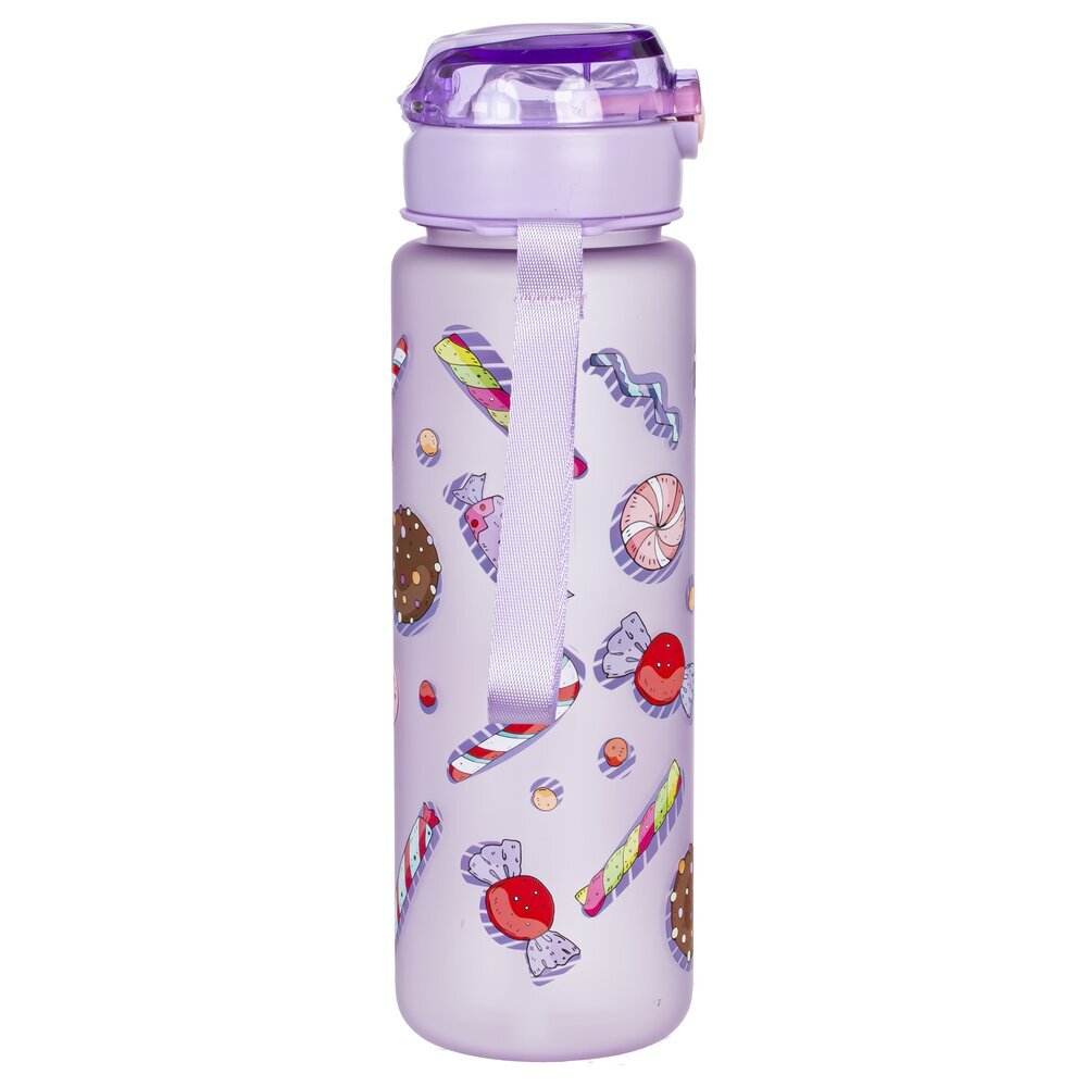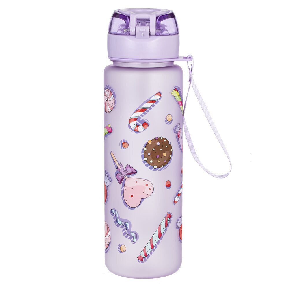 Эта бутылка для воды объемом 600 мл изготовлена из прочных полимерных материалов, что обеспечивает ее легкость и удобство в использовании. Корпус выполнен в приятном светло-фиолетовом оттенке и украшен ярким и веселым принтом с изображением различных сладостей: леденцов, конфет, пряников и печенья. Благодаря наличию удобной ручки, бутылку удобно носить с собой на прогулку, в школу или на тренировку. Плотная крышка и прочный клапан защищают содержимое от проливания, а современный дизайн делает аксессуар особенно привлекательным для детей и подростков. Такая бутылка будет отличным спутником в повседневной жизни, добавляя ярких красок в каждый день.