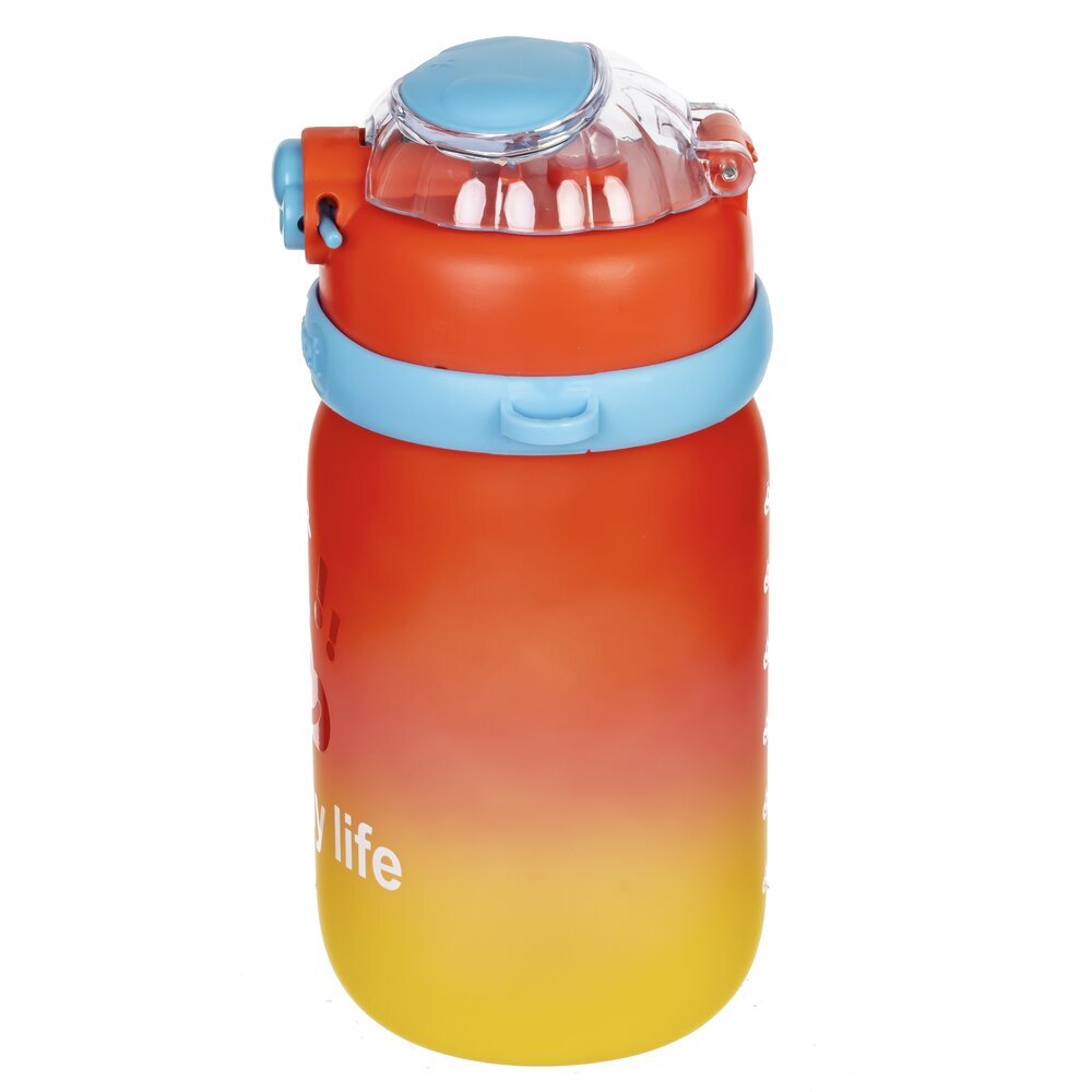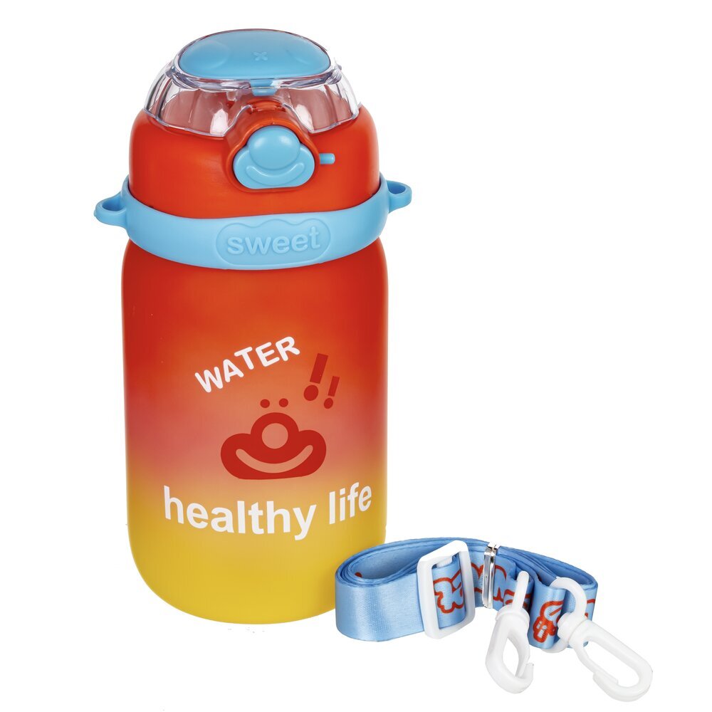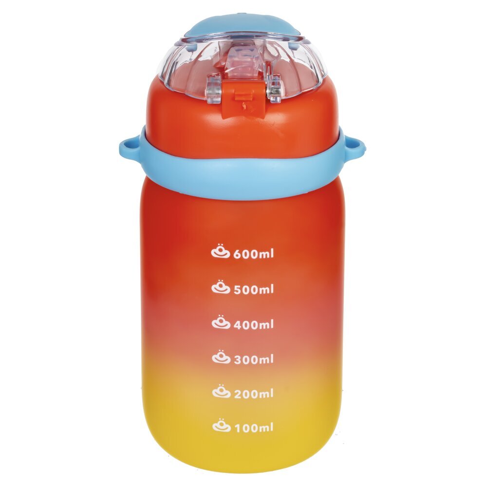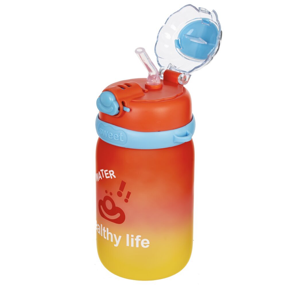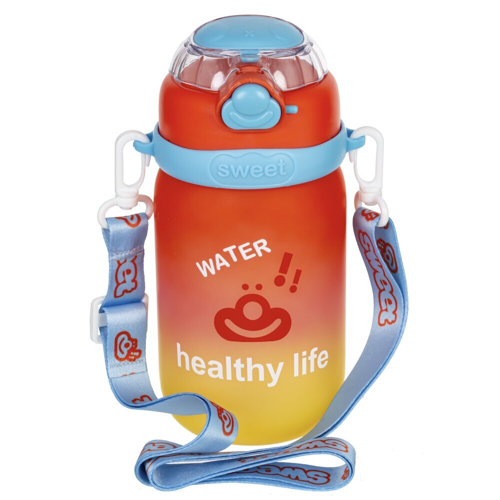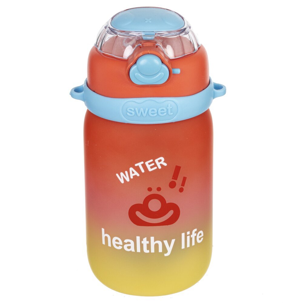 Яркая пластиковая бутылка для воды объёмом 600 мл. Её дизайн выполнен в градиентных оттенках оранжевого и жёлтого, что придаёт ей привлекательный и жизнерадостный внешний вид. На лицевой стороне бутылки нанесены надписи на английском языке: "WATER healthy life", что подчёркивает важность здорового образа жизни и ежедневного потребления воды. Бутылка оснащена удобной широкой крышкой голубого цвета с защитной прозрачной накладкой, позволяющей легко открывать и закрывать ёмкость одним движением. По бокам предусмотрены крепления для ремешка, а сам ремешок голубого цвета украшен яркими надписями и рисунками, что делает использование бутылки ещё более комфортным — её можно носить на плече или через плечо. Такая бутылка отлично подойдёт для школы, спорта, прогулок и путешествий, не протекает и легко моется. Изготовлена из качественного материала, безопасного для здоровья, что позволяет использовать её как для детей, так и для взрослых.