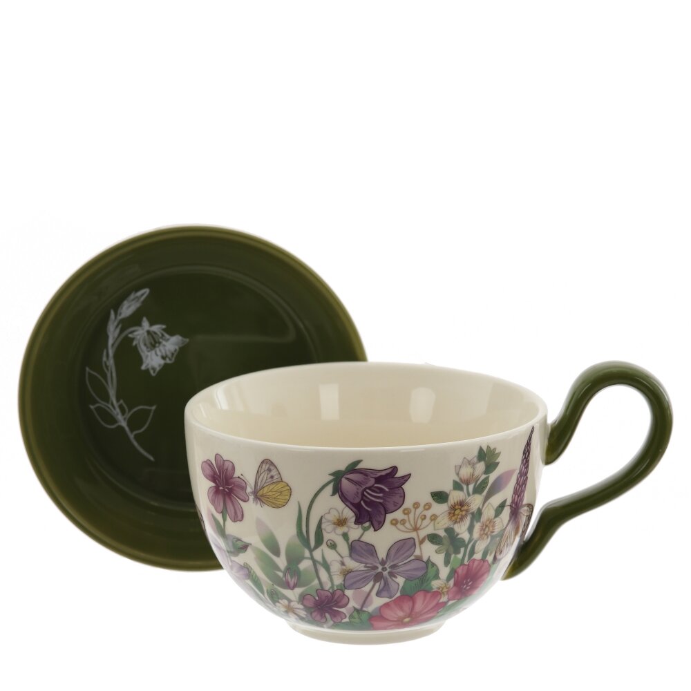 Изящная порционная чашка с крышкой объёмом 400 мл станет любимой посудой для чая, кофе или какао. Изготовлена из качественного фарфора, который хорошо сохраняет тепло и не впитывает запахи. Нежный зеленый цвет в сочетании с тонким цветочным рисунком придаёт изделию романтичный, весенний характер. Крышку удобно использовать как подставку для пакетика чая или десерта. Эргономичная ручка обеспечивает комфортный захват, а гладкая глазурованная поверхность легко очищается и подходит для ежедневного использования. Отличный вариант для подарка и украшения кухонного интерьера.