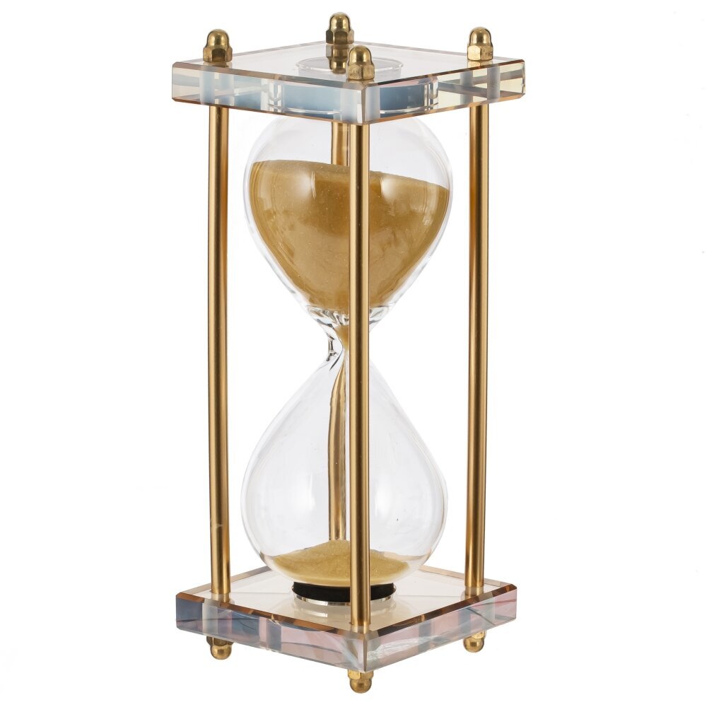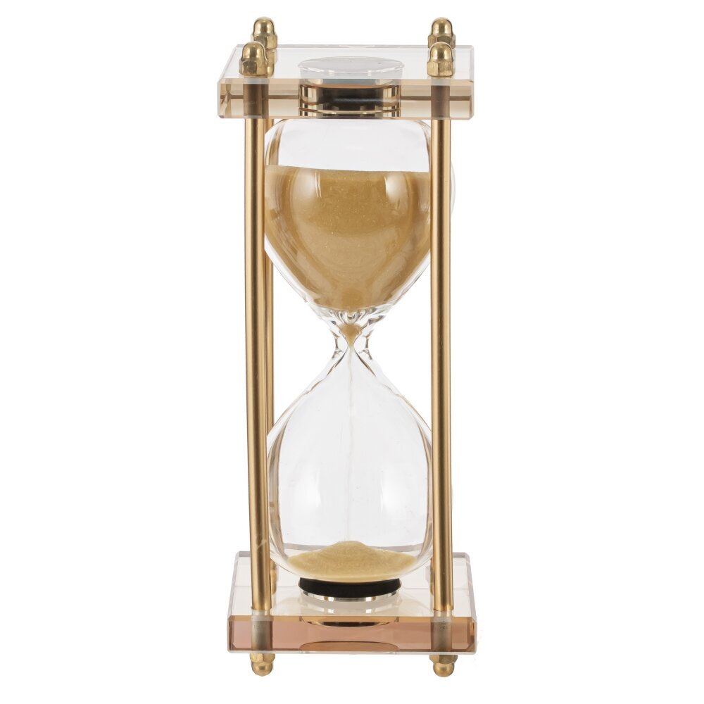 Изящные песочные часы. Две колбы из прозрачного стекла соединены тонким перешейком, через который медленно пересыпается золотистый песок. Конструкция заключена в прямоугольную раму из металла: четыре вертикальные стойки тёплого золотого оттенка поддерживают верхнюю и нижнюю прозрачные площадки со строгими металлическими опорами. Контраст блеска металла и чистоты стекла подчёркивается мягкой матовостью песка, создавая спокойное, медитативное ощущение течения времени. Такой предмет одинаково уместен как функциональный таймер и как стильный акцент для рабочего стола или полки, добавляя интерьеру нотку классической элегантности.