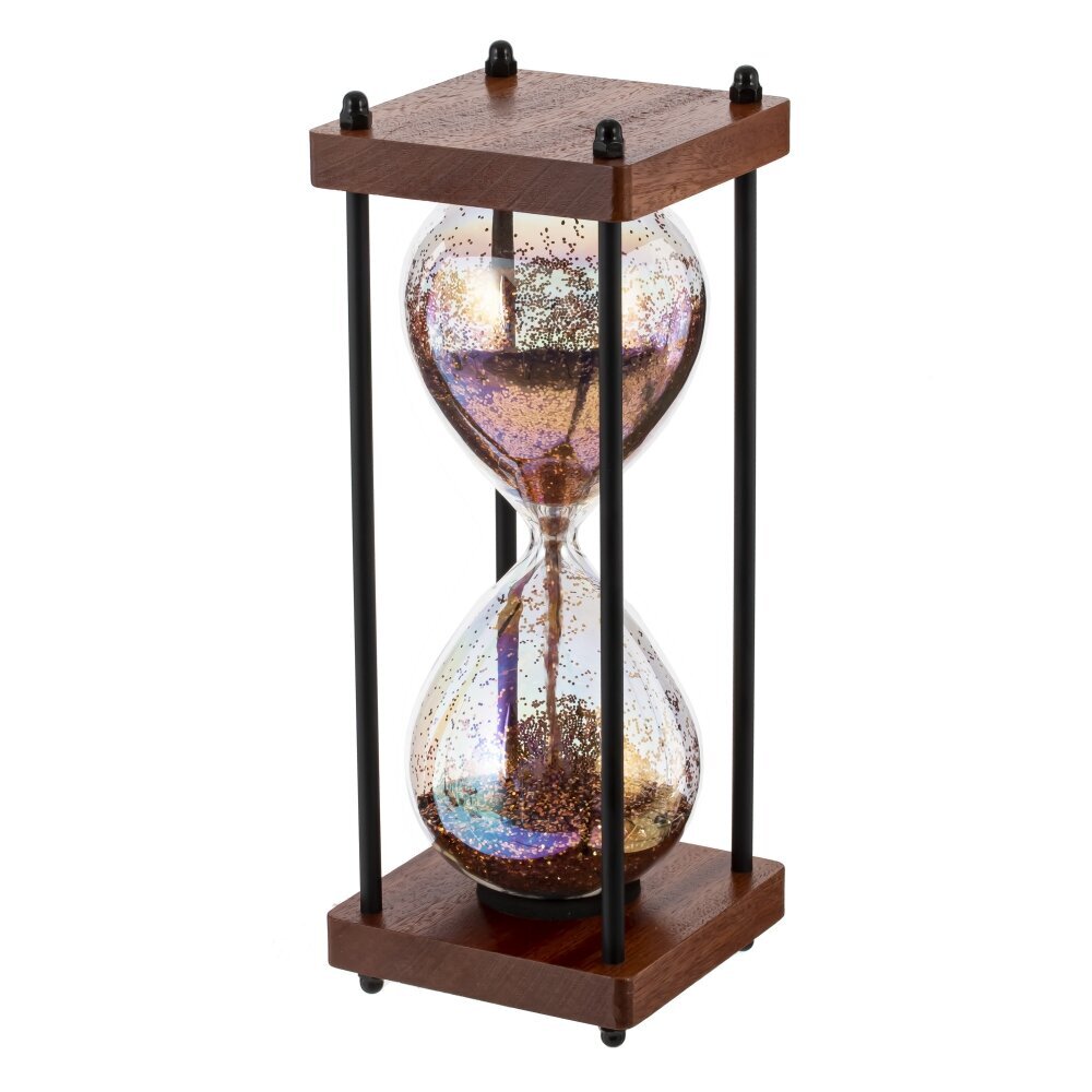 Элегантные песочные часы, в которых гармонично сочетаются дерево, стекло, песок и металл. Конструкция состоит из квадратного деревянного основания и такой же верхней крышки тёплого оттенка, соединённых четырьмя тонкими чёрными металлическими стойками с декоративными крепежами. Между платформами подвешена изящная стеклянная колба с плавным перехватом — прозрачное стекло отливает радужными переливами. Внутри мерцает золотисто?медный песок с мелкими блёстками, который тонкой струйкой пересыпается через узкое горлышко, образуя внизу аккуратный конус. Контраст материалов подчёркивает стиль: тёплое дерево, холодный металл и хрупкое стекло создают ощущение ретро?индустриального предмета. Такие часы станут эффектным акцентом на столе или полке и помогут ненавязчиво отсчитывать короткие промежутки времени.