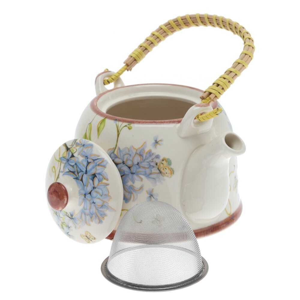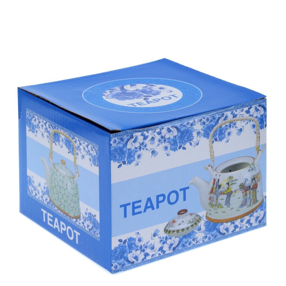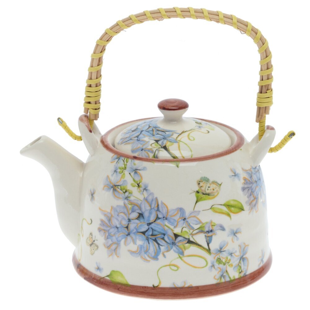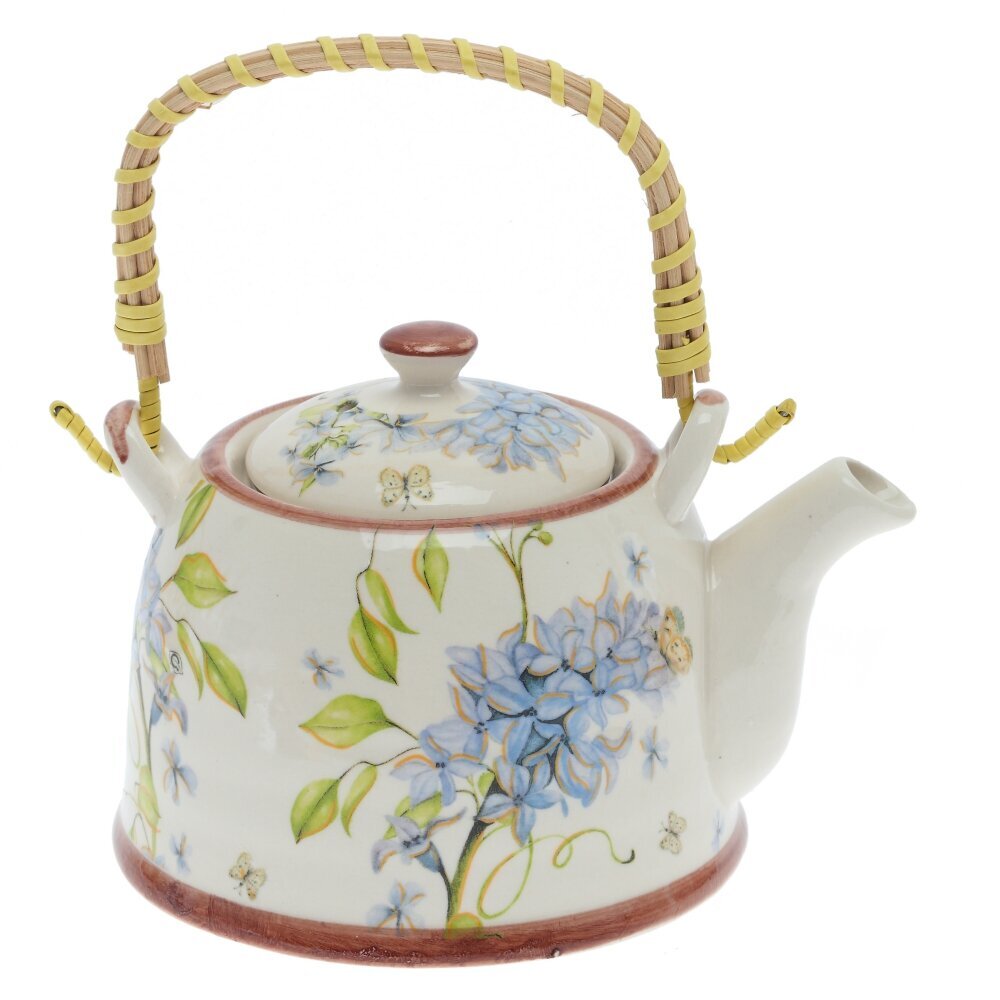 Перед вами изысканный фарфоровый чайник объемом 800 мл, который станет украшением для любой кухни или чайной церемонии. Его изящная округлая форма выполнена в классическом стиле, ладно ложится в руку. Особого внимания заслуживает рисунок: на светлом фоне чайника изображены нежные цветы голубого цвета и зеленые листья, что придает ему изысканный и благородный вид. Помимо растительного орнамента, по поверхности разбросаны милые бабочки, что символизирует легкость и уют. Крышка чайника и его основание аккуратно отделаны коричневой каймой, гармонирующей с основной цветовой гаммой изделия. Отдельного упоминания достойна ручка из плетеного материала – она прочная и удобная, что обеспечивает комфорт при наливании чая. Такой чайник прекрасно подойдет как для семейных чаепитий, так и для встречи гостей, подчеркивая утонченность вкуса хозяев.