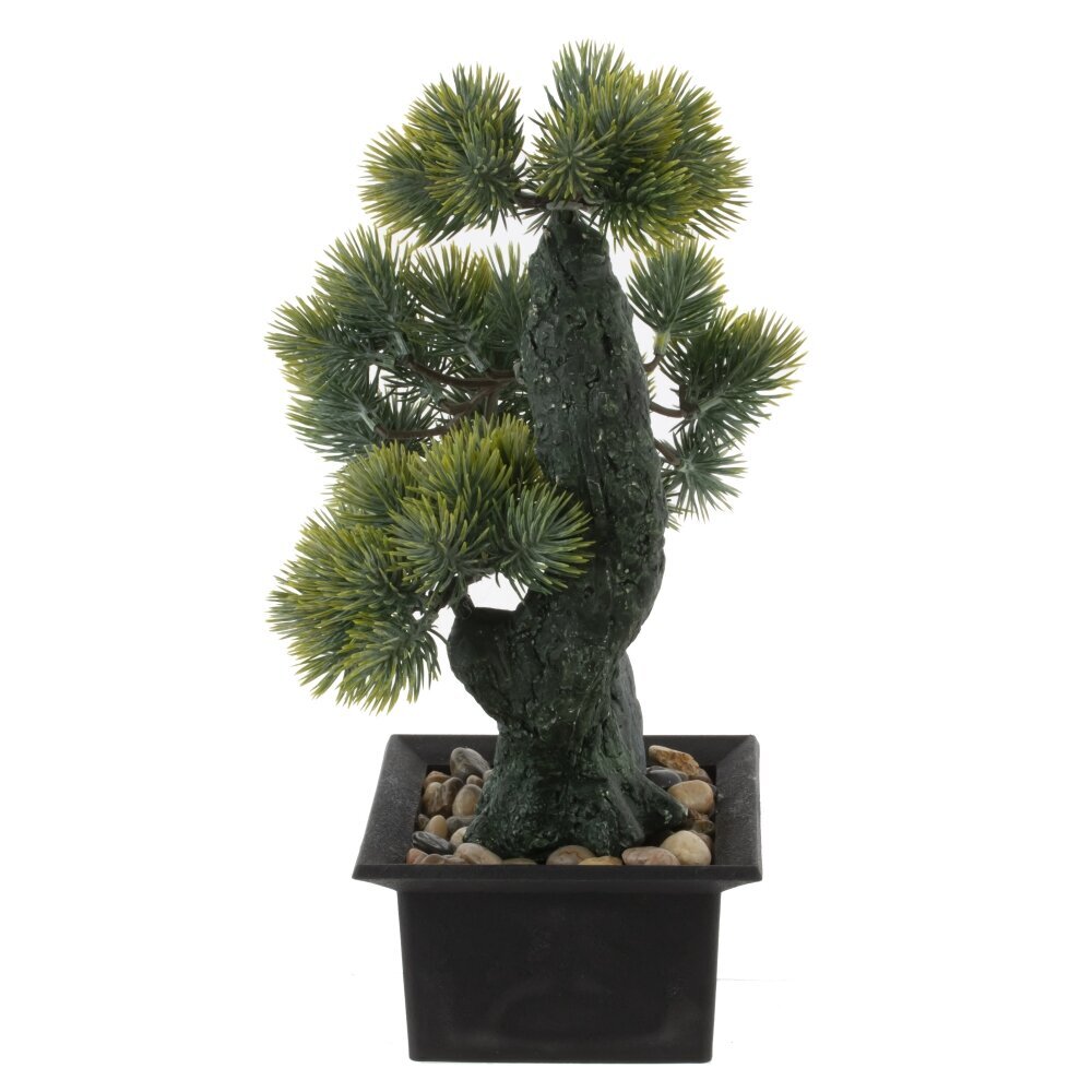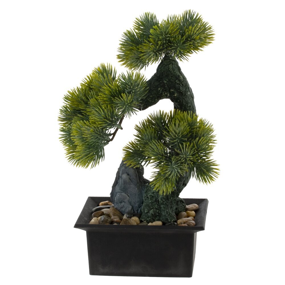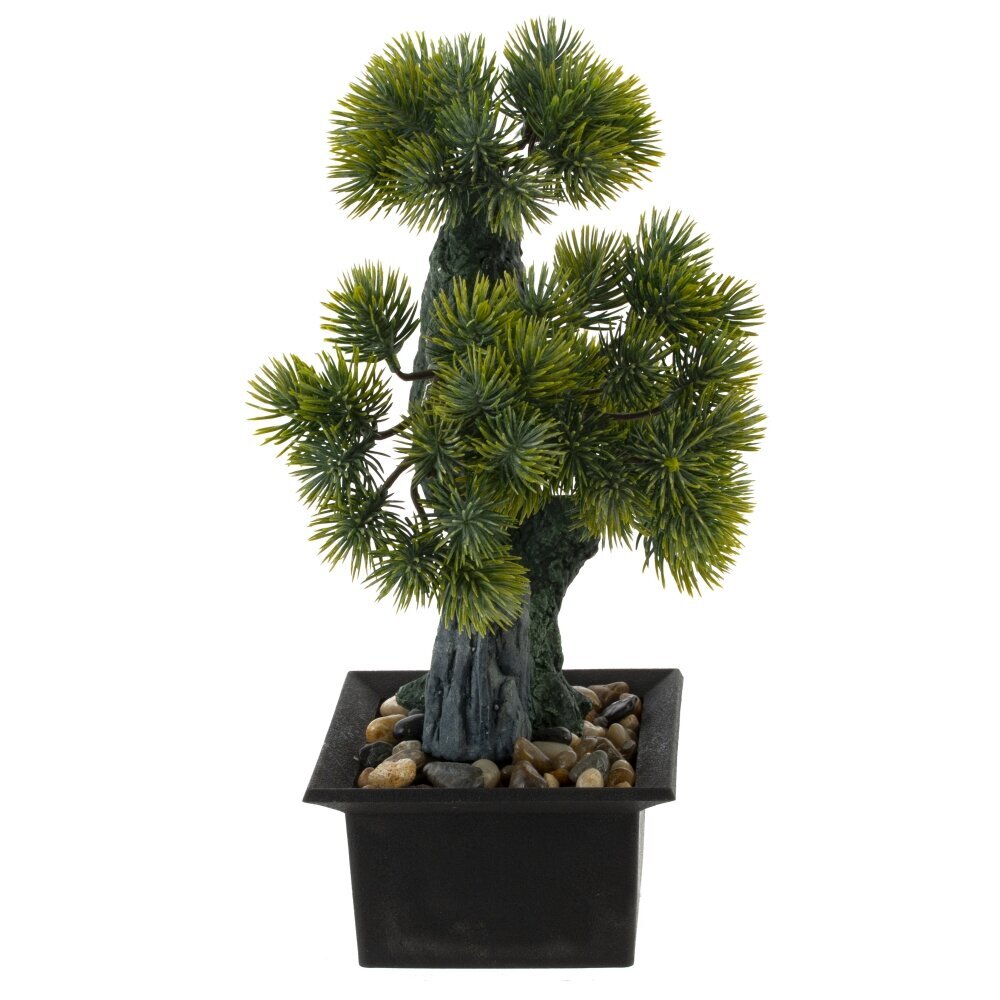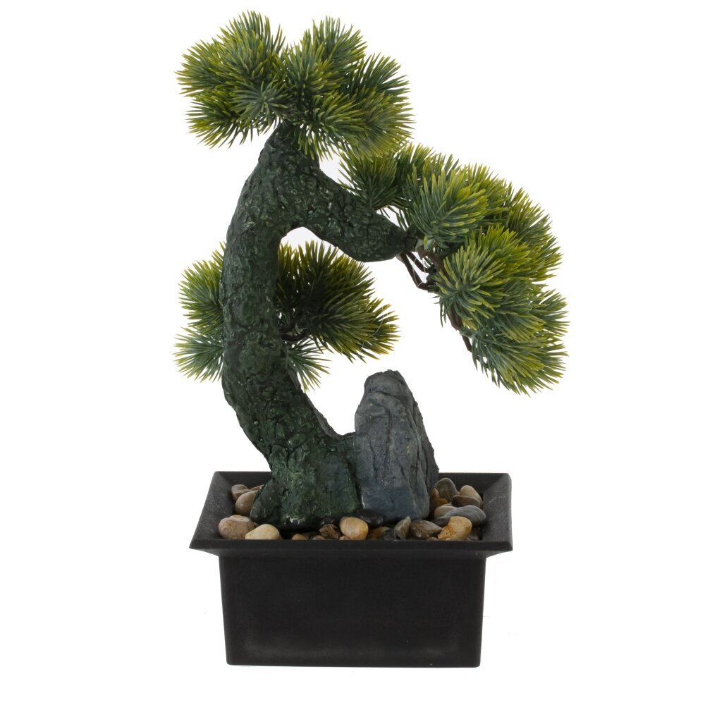 Искусственное декоративное дерево в стиле бонсай с изящно изогнутым стволом и пышными шаровидными кронами из густых зелёных иголочек с лёгким жёлто-оливковым оттенком. Основание оформлено гладкой галькой, размещено в строгом прямоугольном чёрном кашпо. Фактура «коры» и естественные переходы цвета создают реалистичный вид без хлопот ухода: не требует полива, обрезки и особого освещения, долго сохраняет форму и насыщенность красок. Компактная композиция станет спокойным акцентом на рабочем столе, подоконнике или полке, привнося в интерьер нотки японской эстетики и гармонии.
