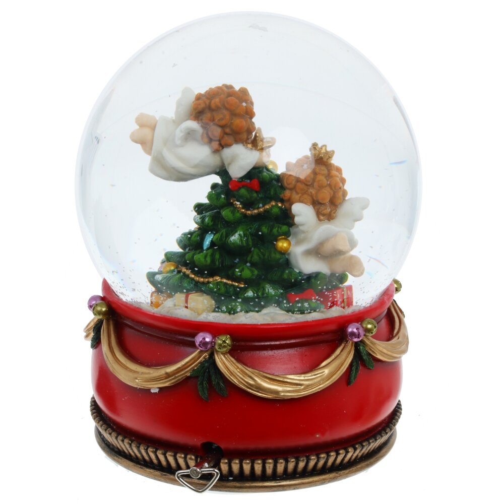 Один из самых популярных во всем мире подарков - это водяной, музыкальный шар. Каждый шар – это сказочная история, волшебство которой завораживает. Стеклянный шар, диаметром 15 см, заполнен водой с белыми хлопьями, имитурующими снегопад при встряхивании. Фигурки и подставка изготовлены из полистоуна с любовью к деталям. Сбоку подставки расположен заводной ключик, при повороте которого воспроизводится мелодия "We wish you a Marry Chrismas".