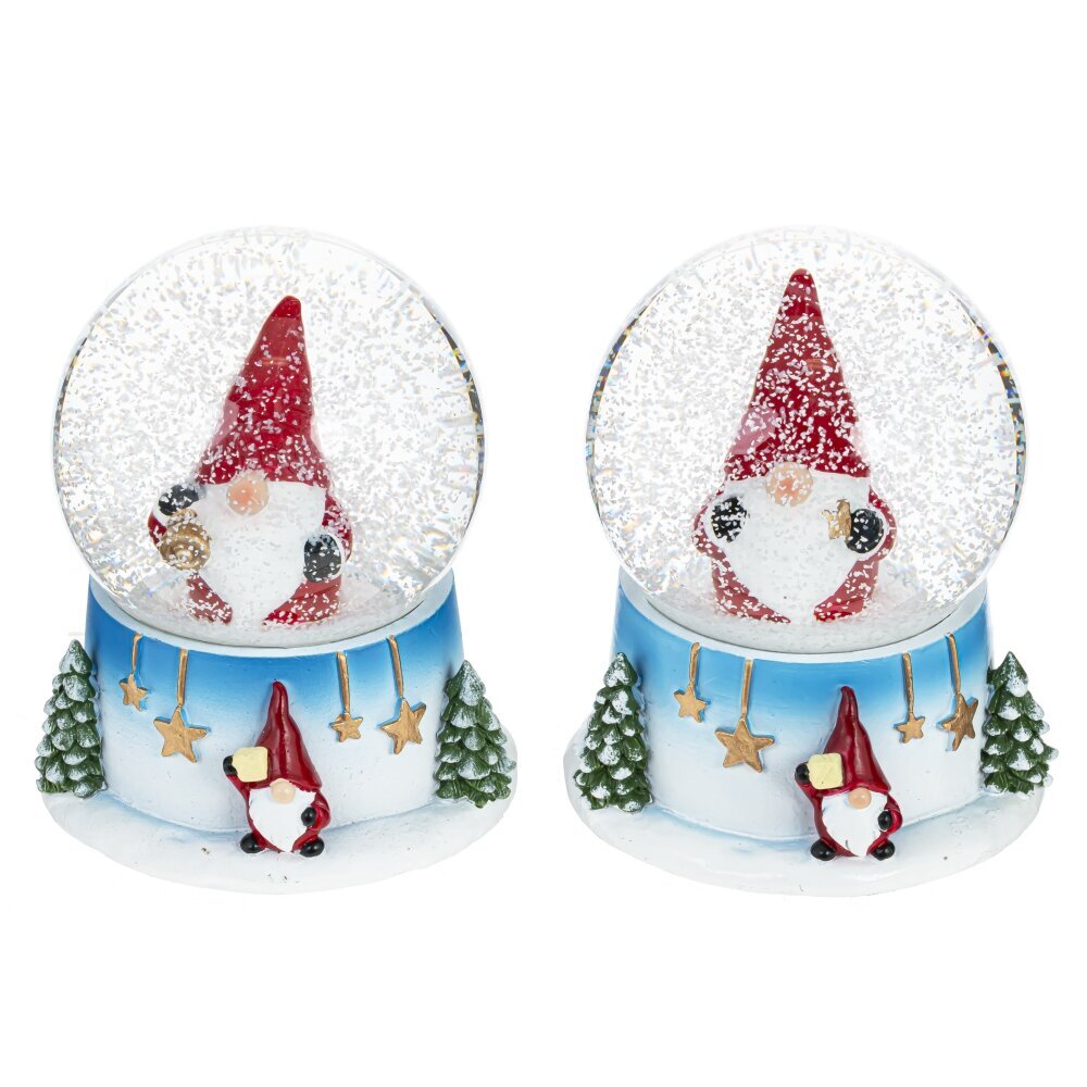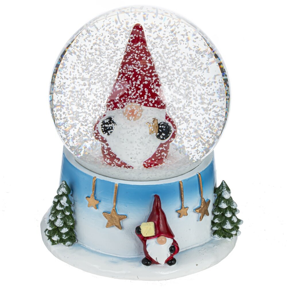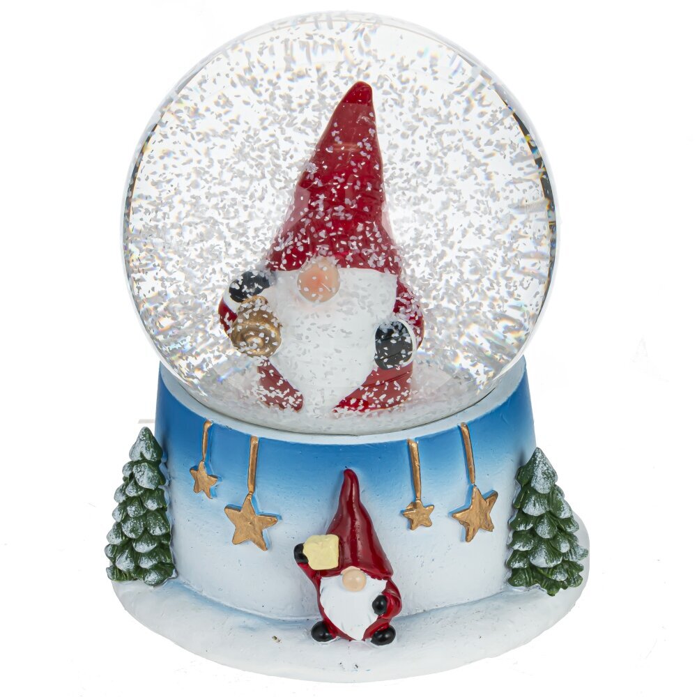 Новогодний снежный шар с фигуркой Гнома внутри подарит вам праздничное настроение и радость. Завораживающее зрелище разворачивается внутри: при встряхивании поднимаются вверх сотни блёсток, создавая эффект снегопада. Изделие станет прекрасным подарком для родных и близких. Представлено в двух вариантах. Внимание: при длительном нахождении в минусовой температуре возможно образование льда, который сместит фигурки и повредит шар. Наличие воздушной прослойки внутри водяного шара является технической необходимостью производства.