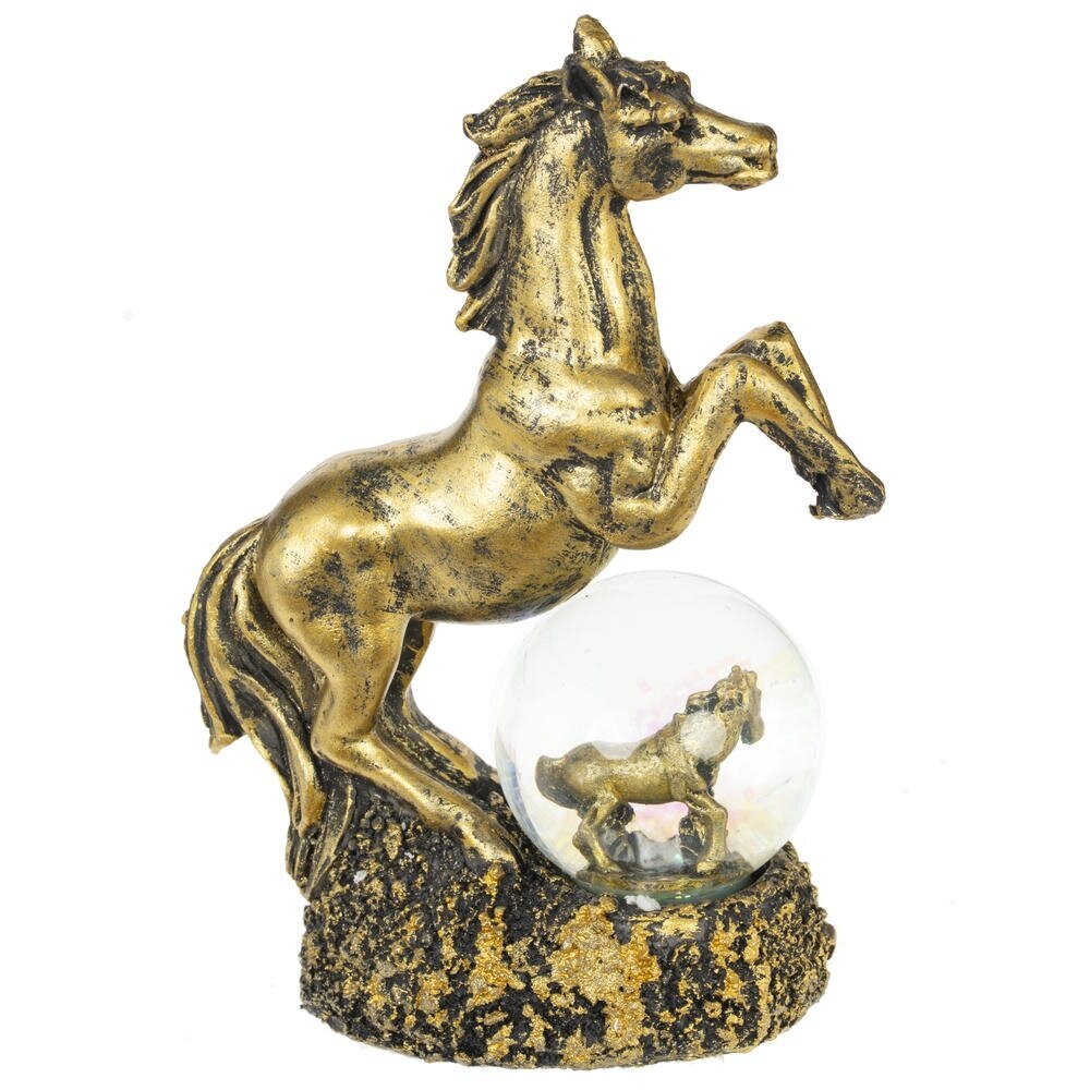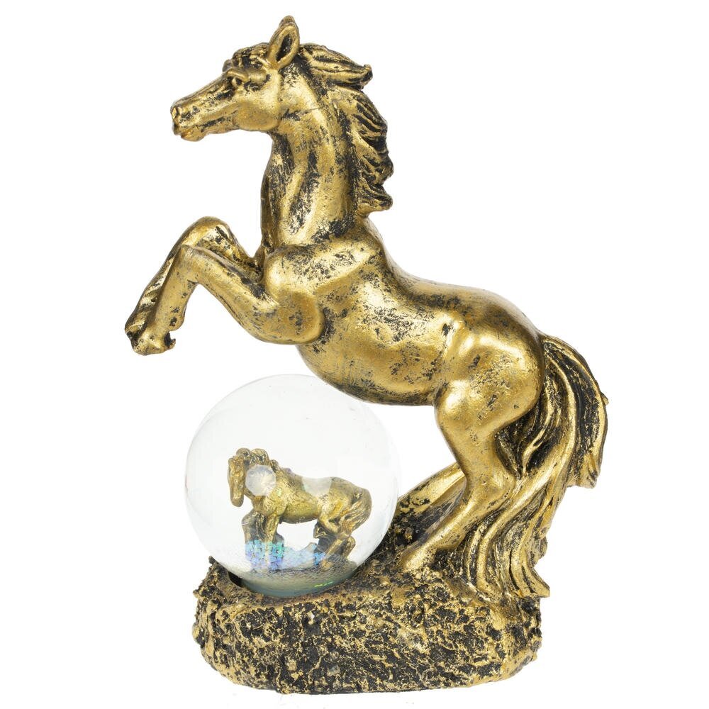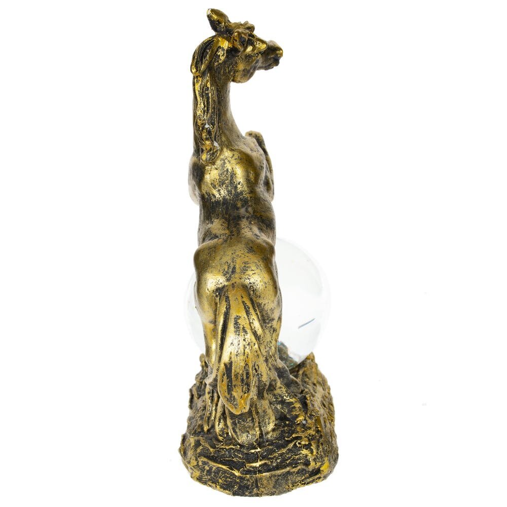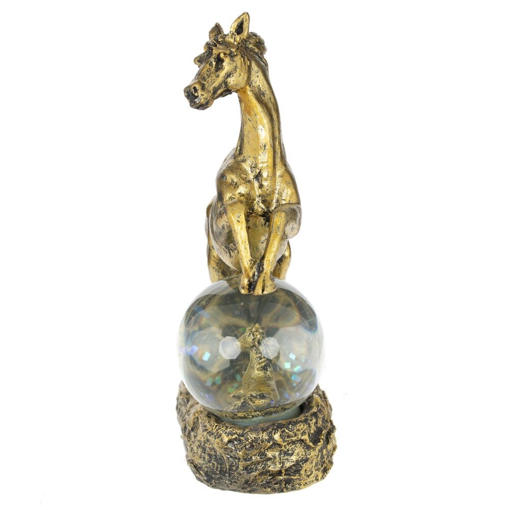 Фигурка декоративная в стеклянном шаре "Лошадь" — волшебный талисман на удачу, идеально воплощающий символ 2026 года и добавляющий магии в ваш интерьер! Композиция состоит из грациозной фигуры лошади в позе курбета с развивающейся гривой и хвостом, словно в танце ветра, полная динамики и элегантности. Под ее ногами — стеклянный шар с прозрачной водой и мерцающими блестками, внутри которого стоит или лежит милый жеребенок. Цвет черненое золото придает композиции роскошный блеск и благородство. Прекрасный подарок или сувенир к Новому году для любителей лошадей, коллекционеров украшений или тех, кто ищет уютный талисман удачи — он станет ярким акцентом на полке, столе или подоконнике.