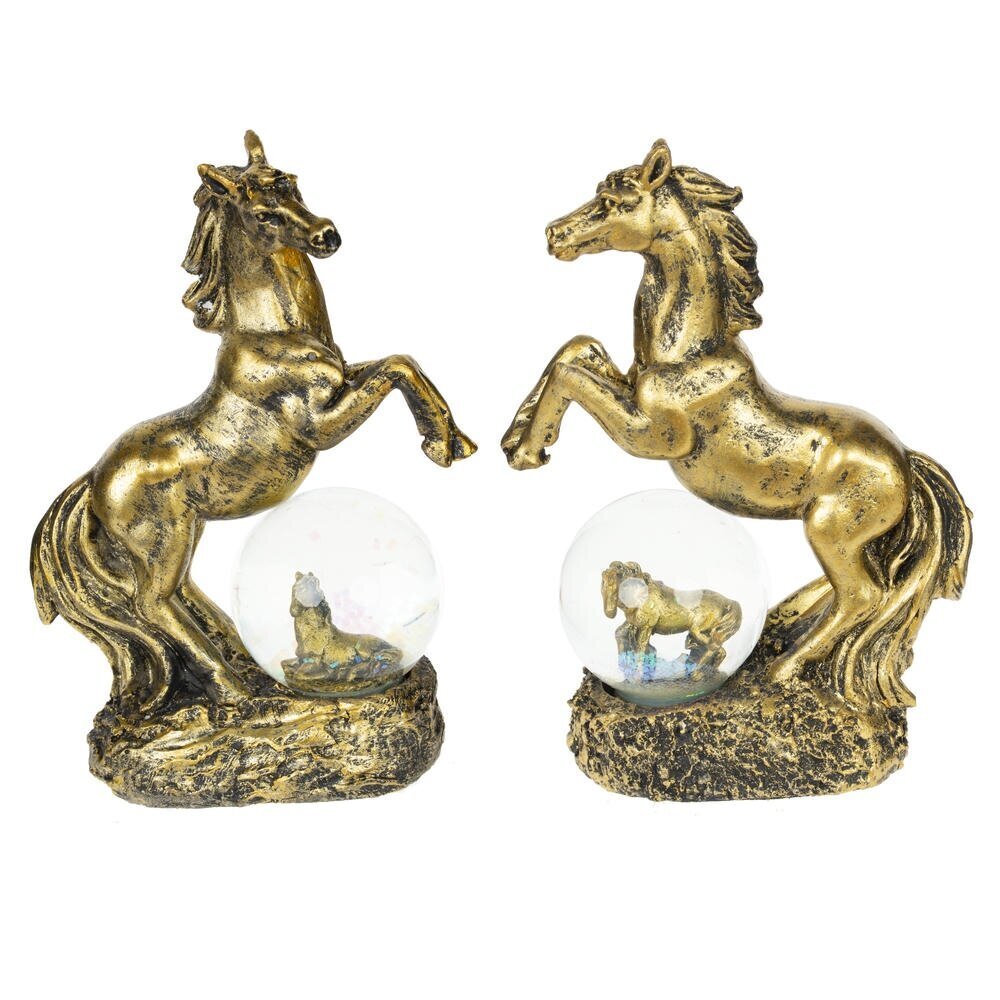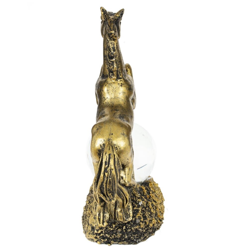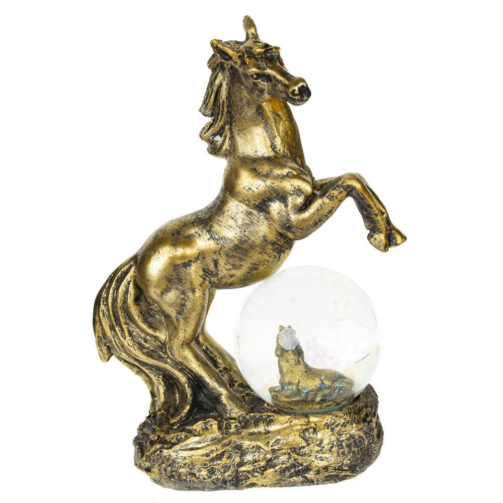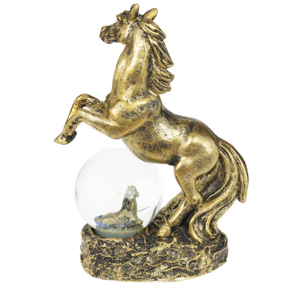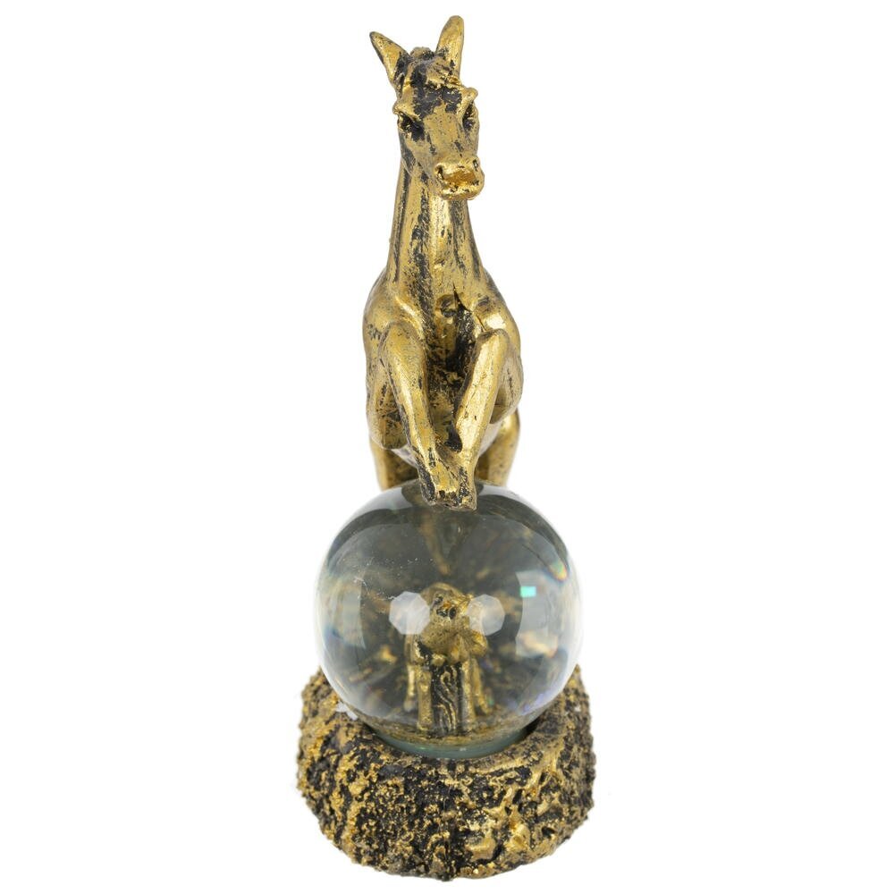 Фигурка декоративная в стеклянном шаре "Лошадь" — волшебный талисман на удачу, идеально воплощающий символ 2026 года и добавляющий магии в ваш интерьер! Композиция состоит из грациозной фигуры лошади в позе курбета с развивающейся гривой и хвостом, словно в танце ветра, полная динамики и элегантности. Под ее ногами — стеклянный шар с прозрачной водой и мерцающими блестками, внутри которого стоит или лежит милый жеребенок. Цвет черненое золото придает композиции роскошный блеск и благородство. Прекрасный подарок или сувенир к Новому году для любителей лошадей, коллекционеров украшений или тех, кто ищет уютный талисман удачи — он станет ярким акцентом на полке, столе или подоконнике.