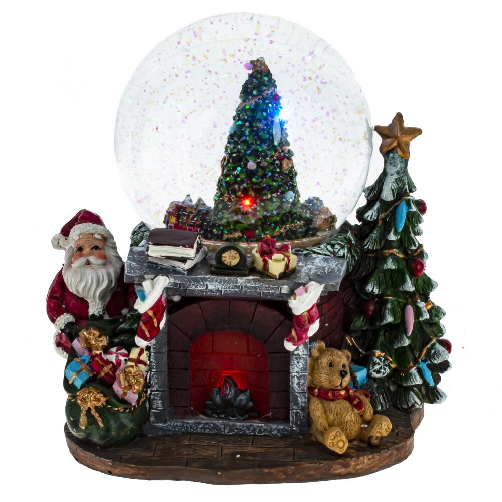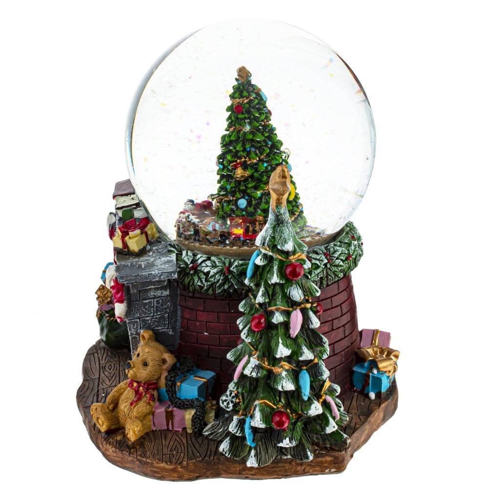 Декоративная фигурка в стеклянном шаре с подсветкой, музыкой и функцией движения "Ёлка" вдохновляет на праздничное настроение. Выполненная из полистоуна, она представляет собой украшенный камин, около которого расположился дед Мороз с мешком подарков. Внутри стеклянного шара диаметром 12 см находится рождественская ель с железной дорогой у основания. При включении рычага на дне фигурки зажигаются и мигают огни на елке, и огонь в камине. И под восемь праздничных мелодий поровозик начинает движение вокруг елки. Музыкальная и визуальная симфония, созданная этой фигуркой, подарит волшебство праздника. Работает от трех батареек типа АА, которые не входят в комплект. Имеется два режима с музыкой и без нее.