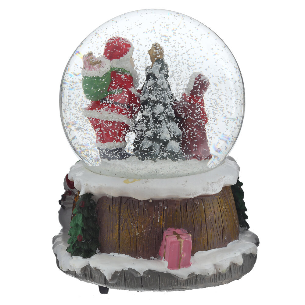 Новогодний снежный шар с фигуркой Деда Мороза с детьми внутри подарит вам праздничное настроение и радость. Завораживающее зрелище разворачивается внутри: при встряхивании поднимаются вверх сотни блёсток, создавая эффект снегопада, а при повороте заводного ключа начинает играть музыка. Изделие станет прекрасным подарком для родных и близких. Внимание: при длительном нахождении в минусовой температуре возможно образование льда, который сместит фигурки и повредит шар. Наличие воздушной прослойки внутри водяного шара является технической необходимостью производства.