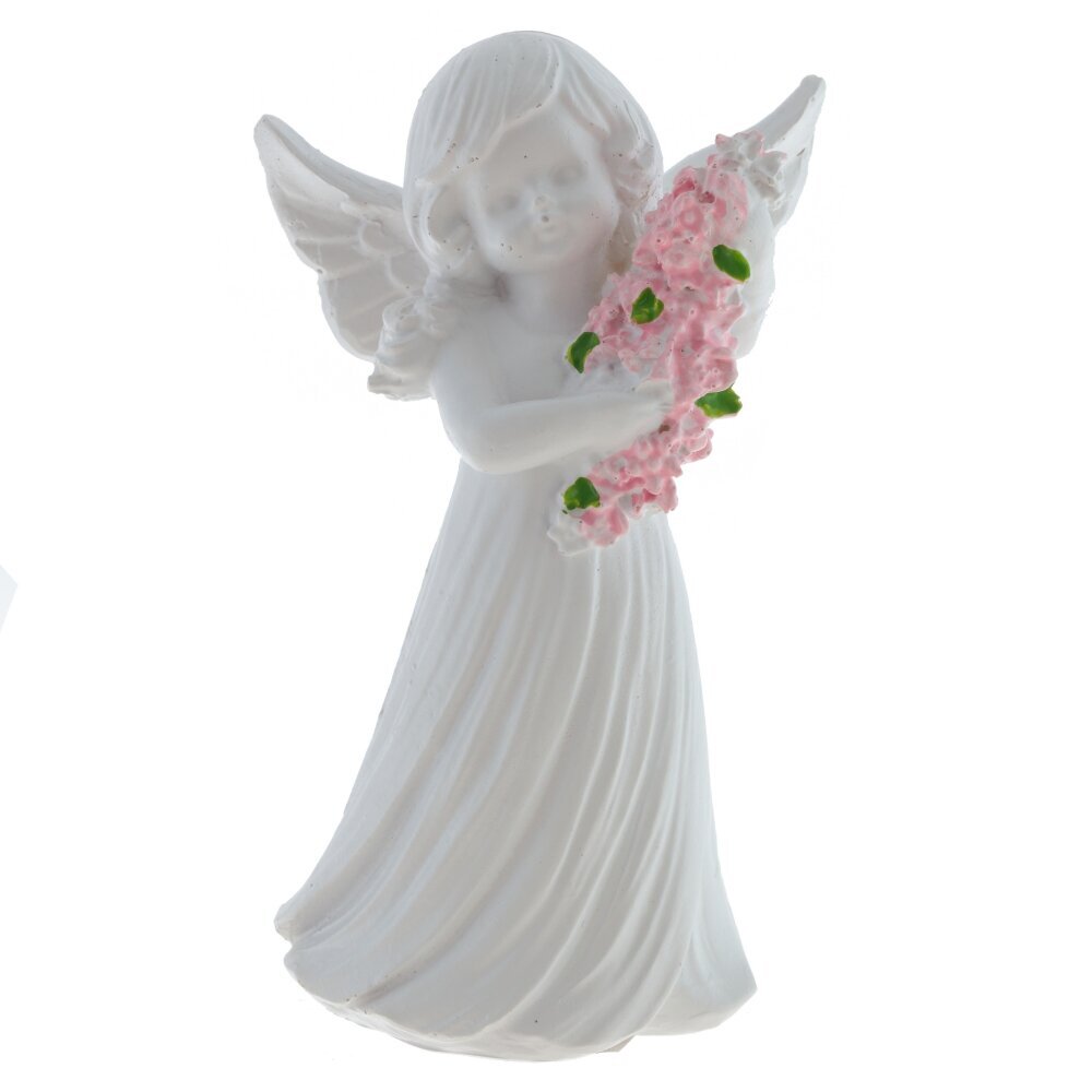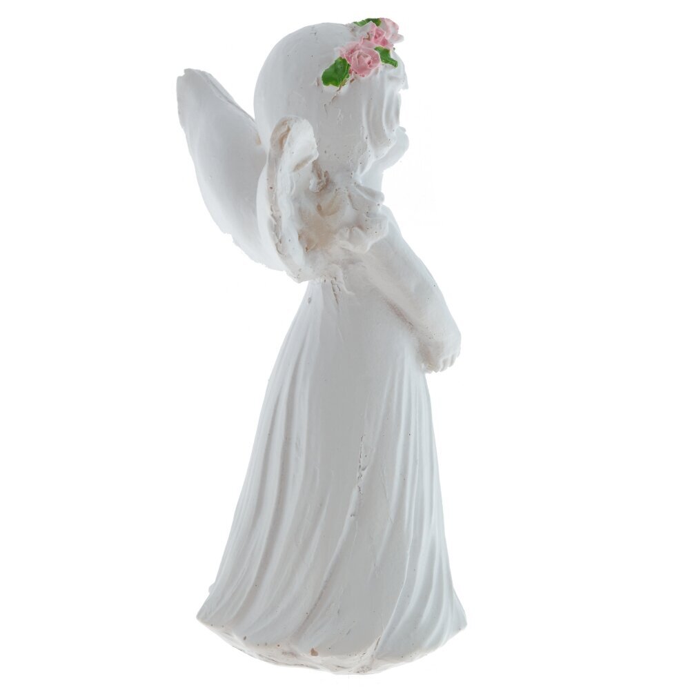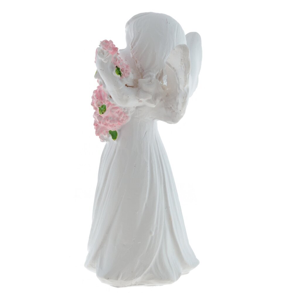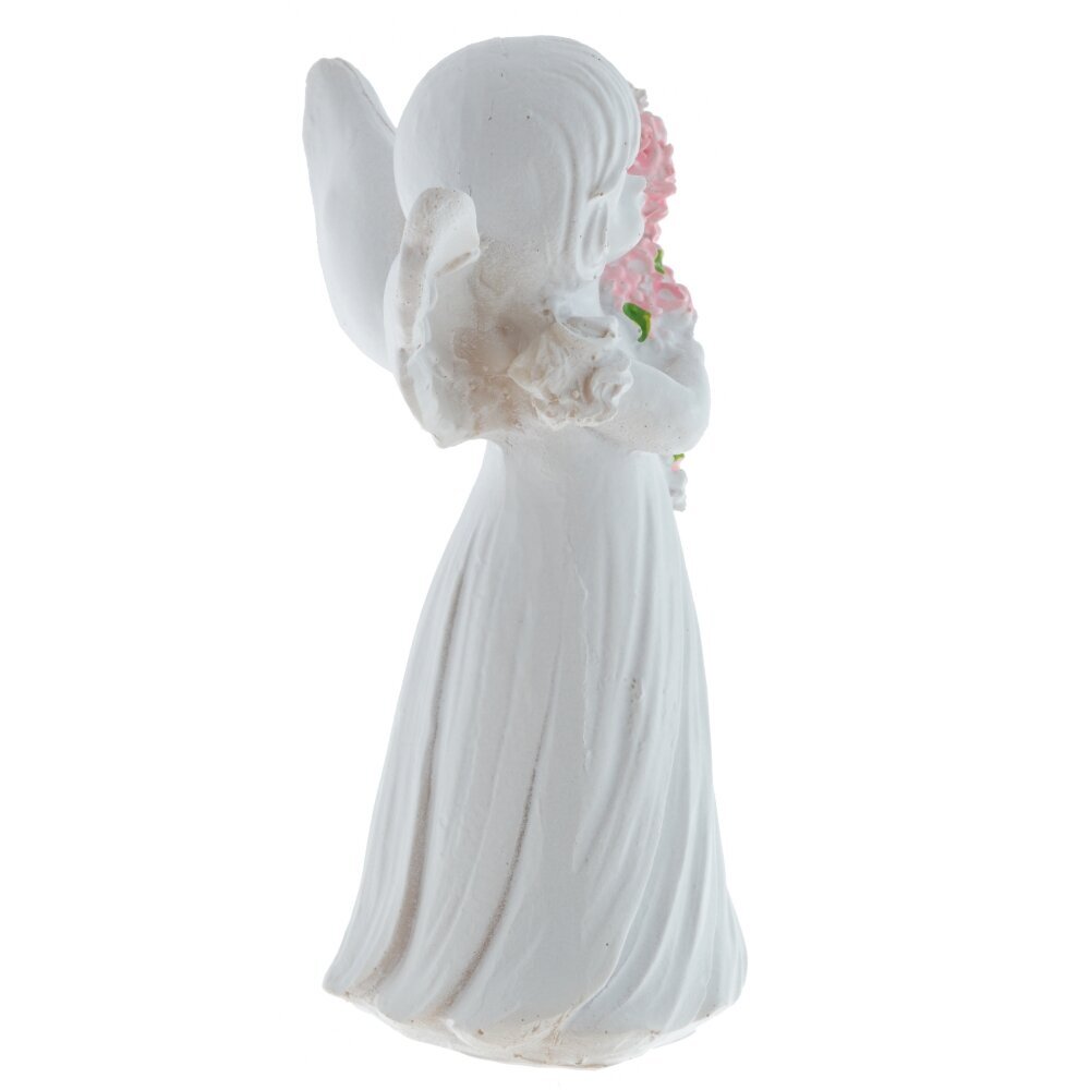 Декоративная фигурка ангела выполнена из полимерных материалов и представляет собой изящное изделие белого цвета. Ангел изображен с нежным выражением лица, с распущенными волосами и изогнутыми крыльями за спиной. В руках он держит большой букет розовых цветов с ярко-зелёными листочками, что добавляет фигуре особый шарм и мягкость. Скульптура отличается детальной проработкой складок на платье и тщательно вылепленными чертами лица, что придает ей живость и выразительность. Такая фигурка станет прекрасным украшением интерьера, подойдет для создания уютной атмосферы в доме или может стать символическим подарком близкому человеку. Благодаря использованию современных полимерных материалов фигурка долго сохраняет свой первоначальный внешний вид, устойчива к внешним воздействиям и не требует особого ухода. Представлено в двух вариантах.