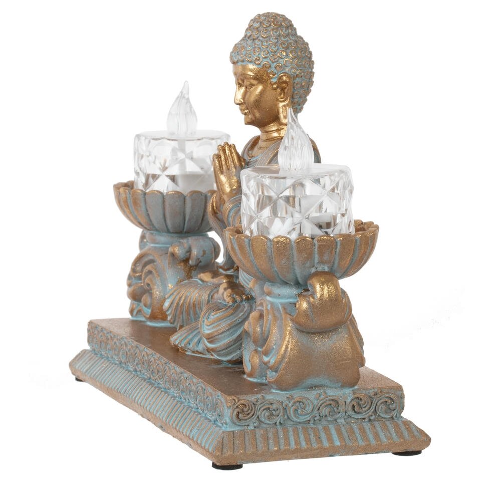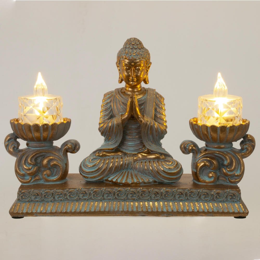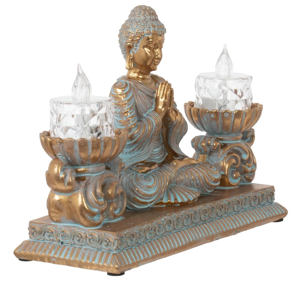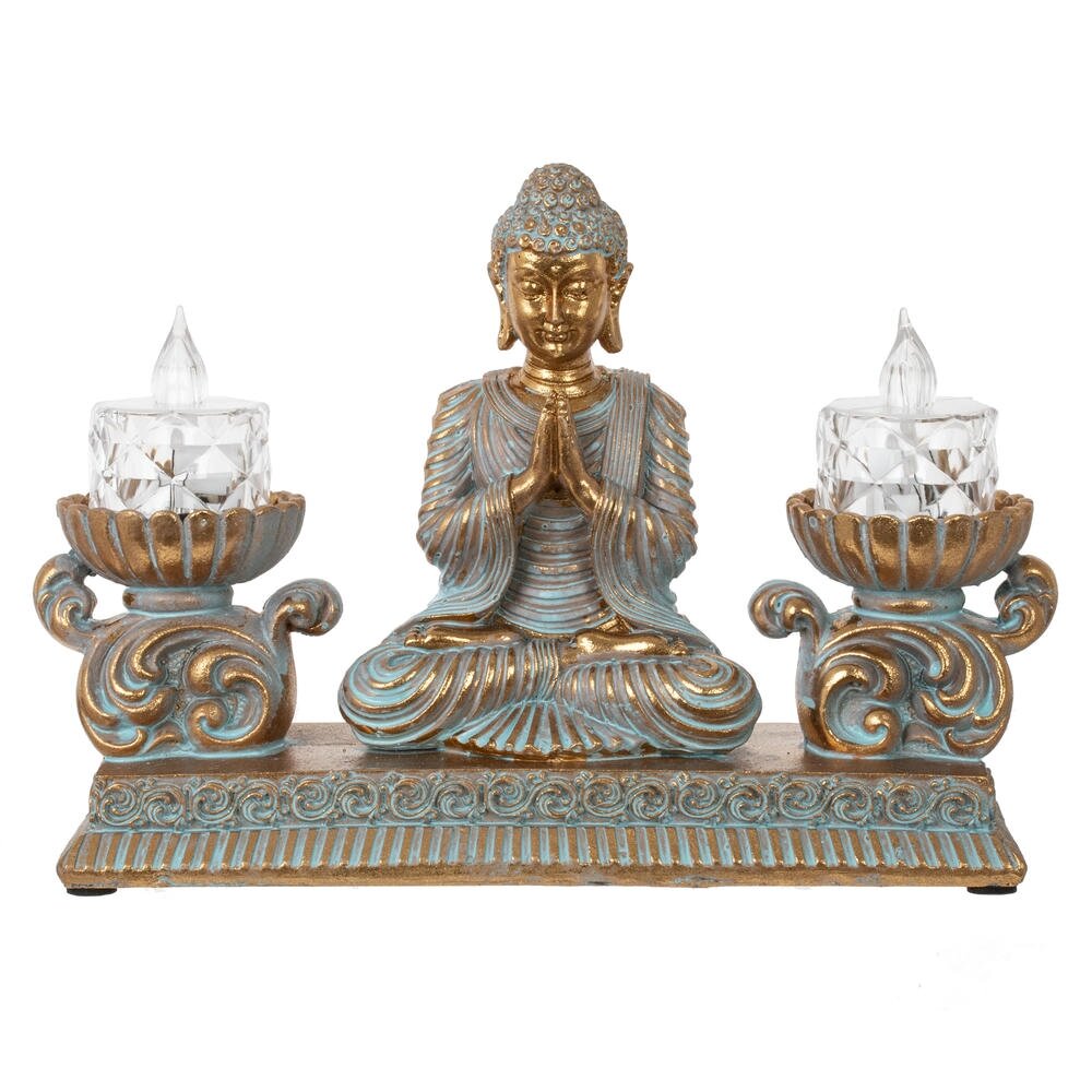 Изысканная композиция в восточном стиле, сочетающая духовность и функциональность. В центре расположена статуэтка медитирующего Будды, выполненная в благородных тонах золота и бирюзы с эффектом патины. По бокам размещены два элегантных подсвечника в форме лотоса с LED-свечами, имитирующими живое пламя. Вся композиция установлена на единой платформе с изящным орнаментом. Фигурка станет прекрасным украшением интерьера, создаст атмосферу умиротворения и гармонии. Идеально подходит для meditation-зоны, гостиной или спальни. LED-свечи безопасны и создают мягкое, расслабляющее освещение. Отличный подарок для ценителей восточной культуры и философии.