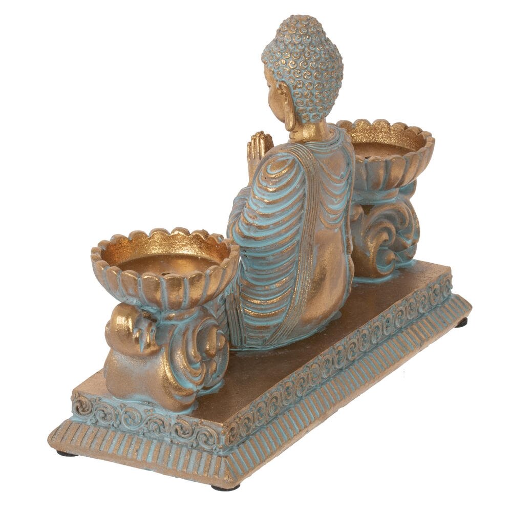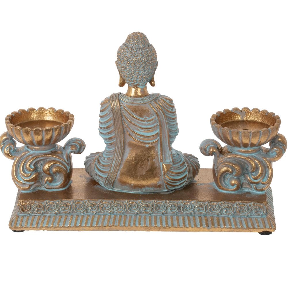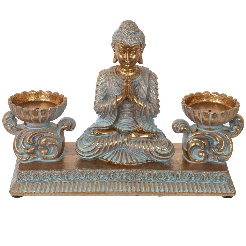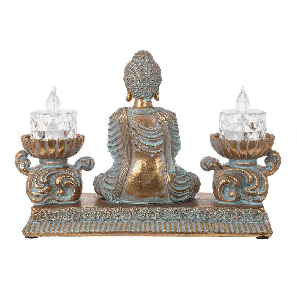 Изысканная композиция в восточном стиле, сочетающая духовность и функциональность. В центре расположена статуэтка медитирующего Будды, выполненная в благородных тонах золота и бирюзы с эффектом патины. По бокам размещены два элегантных подсвечника в форме лотоса с LED-свечами, имитирующими живое пламя. Вся композиция установлена на единой платформе с изящным орнаментом. Фигурка станет прекрасным украшением интерьера, создаст атмосферу умиротворения и гармонии. Идеально подходит для meditation-зоны, гостиной или спальни. LED-свечи безопасны и создают мягкое, расслабляющее освещение. Отличный подарок для ценителей восточной культуры и философии.
