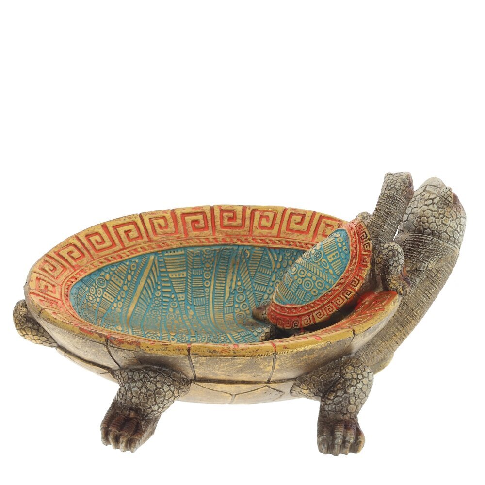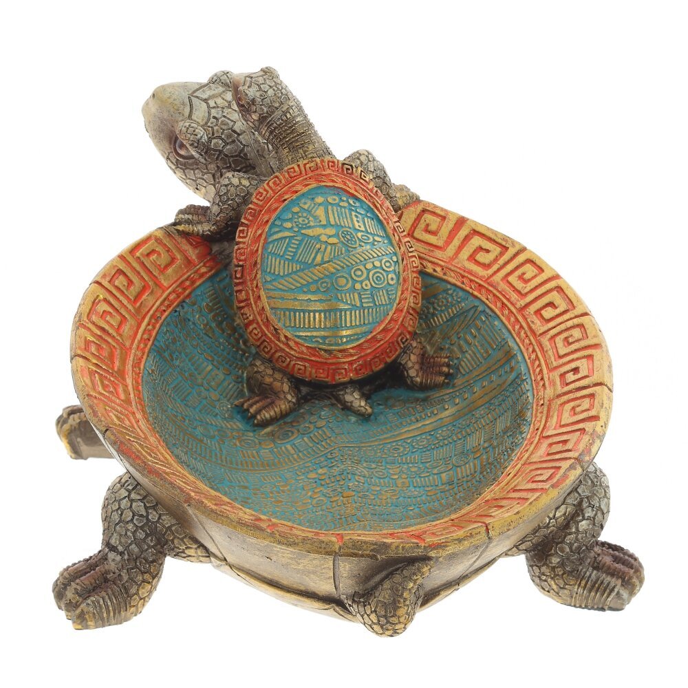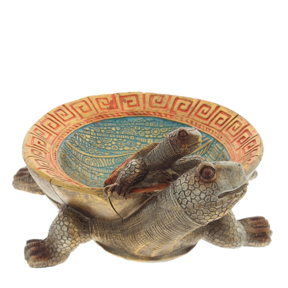 Декоративная фигурка "Черепахи" выполнена из полимерных материалов, что придает ей прочность и долговечность. Элегантный коричневый цвет фигурки дополнен золотым узором, создавая изысканный и стильный вид. Дизайн и качественное изготовление делают этот предмет идеальным дополнением для любого интерьера. Изделие так же может оригинально решить вопрос хранения мелочей, особенно тех, которыми вы пользуетесь чаще всего. Фигурка "Черепахи" станет прекрасным акцентом в вашем доме, добавляя шарм и уют.