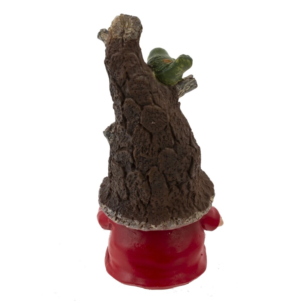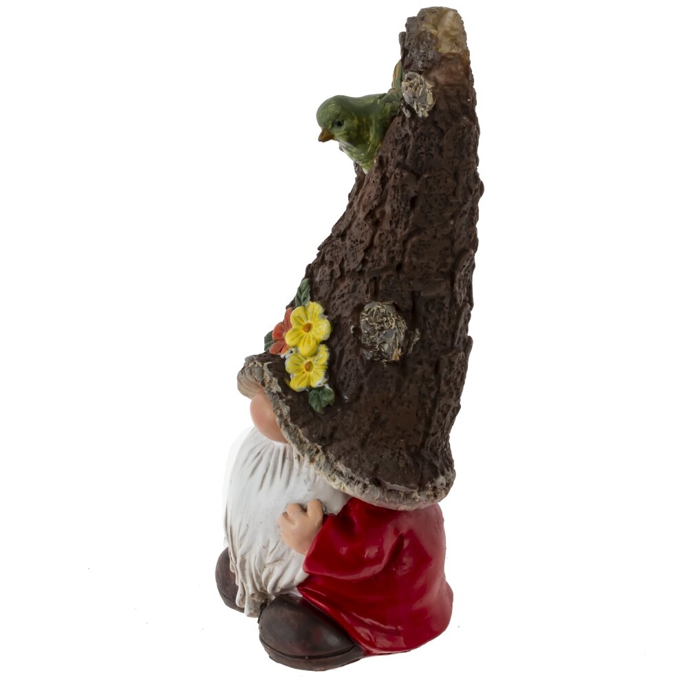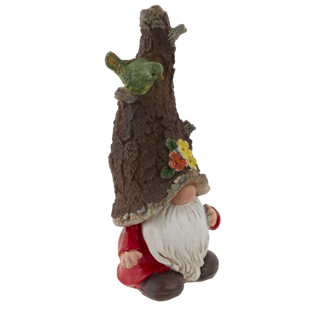Декоративная фигурка «Гном» из полимерных материалов добавит в пространство нотку лесной сказки. Милый персонаж в красной куртке и коричневых башмачках спрятал лицо под высоким шутливым колпаком, стилизованным под кору дерева. На «шляпе» прорисованы фактурные неровности, сидит зеленая птичка, а у края — яркие цветы с листьями. Длинная белая борода придает образу уют и добродушие. Аккуратные детали и теплые оттенки подчеркивают декоративность изделия. Фигурка компактна, устойчиво стоит на ровной поверхности и уместна на полке, подоконнике, в прихожей или среди комнатных и садовых композиций. Полимерная основа легкая и неприхотливая в уходе — достаточно протирать пыль мягкой тканью.