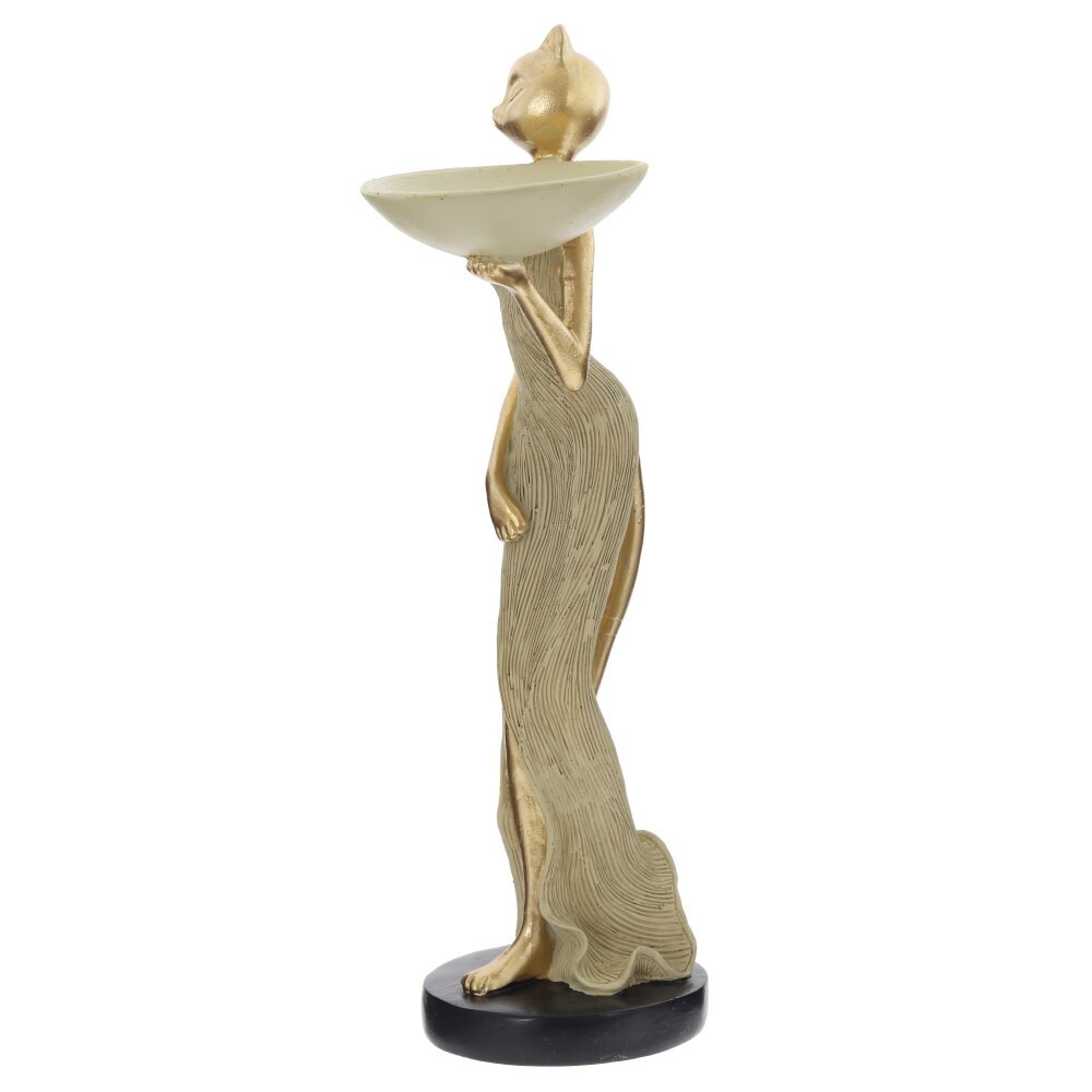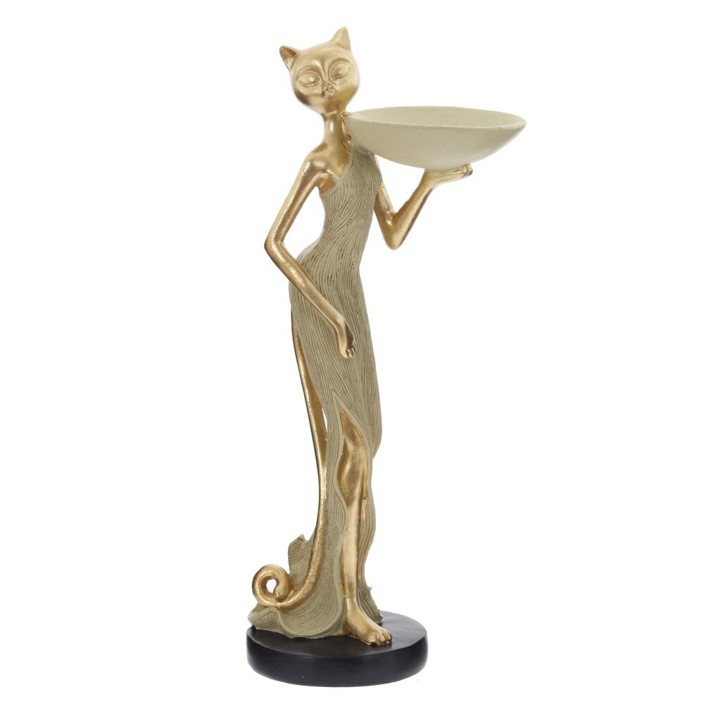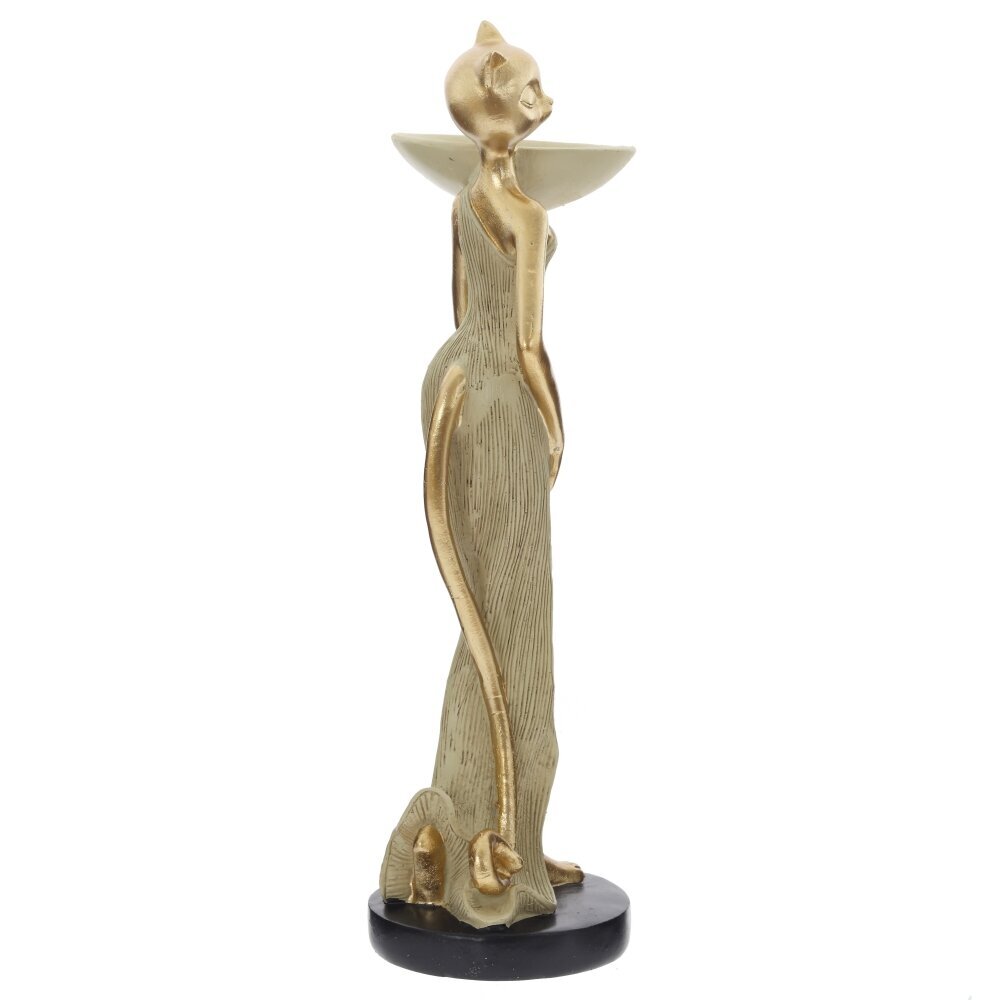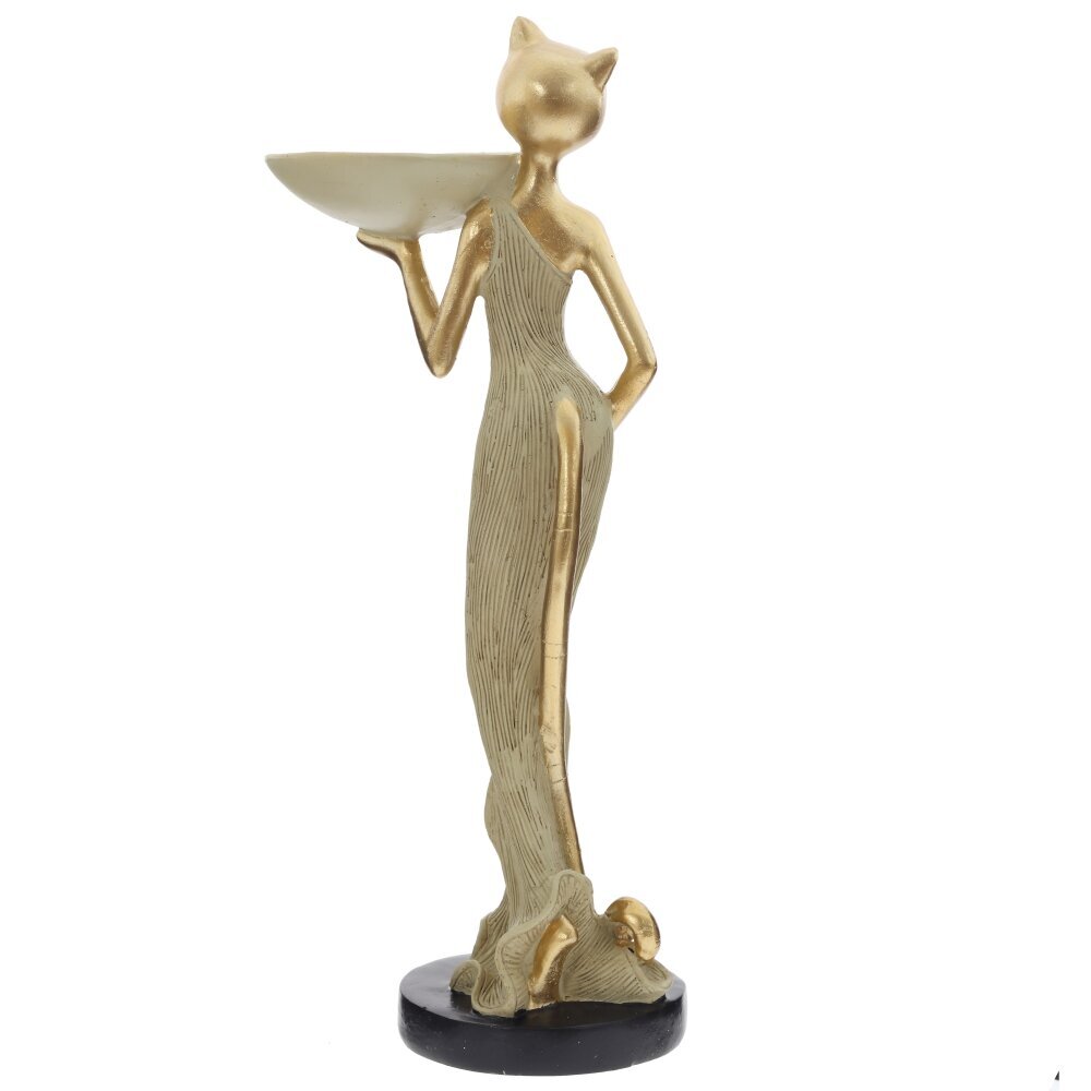 Декоративная фигурка «Кошка» с подставкой для мелочей — изящный акцент для интерьера в современном или классическом стиле. Статная кошка в длинном платье выдержана в благородных золотистых оттенках и стоит на устойчивом круглой подставке. В приподнятой лапе она держит аккуратную чашу?поднос, куда удобно складывать ключи, украшения, монеты, канцелярские мелочи и другие небольшие предметы. Изделие выполнено из прочных полимерных материалов, устойчивых к выцветанию и легких в уходе: достаточно периодически протирать его мягкой сухой тканью. Такая фигурка станет стильным украшением прихожей, спальни, гостиной или рабочего стола, а также оригинальным подарком для ценителей необычного декора и любителей кошек.