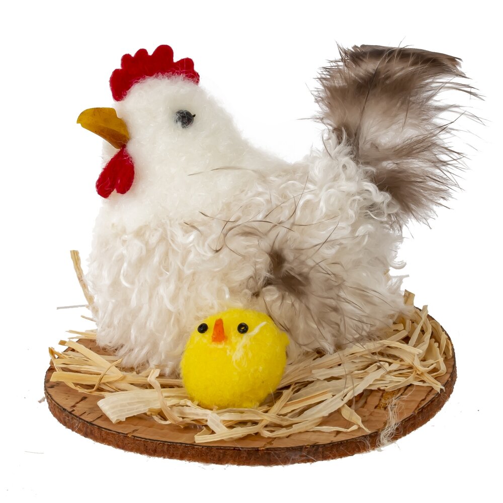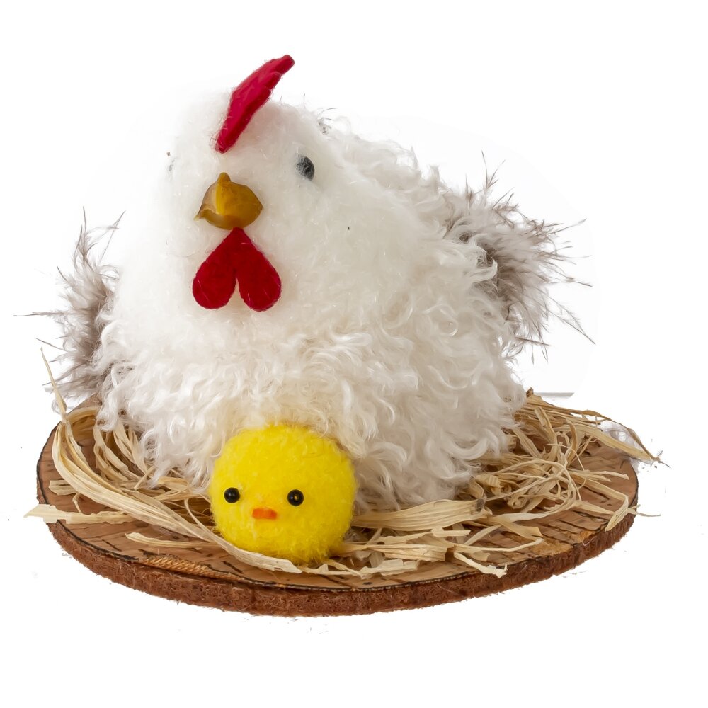 Декоративная пасхальная фигурка «Курица» станет трогательным акцентом вашего весеннего декора. На небольшом основании-«подставке» из натурального материала расположено гнездо из соломки, в котором устроилась пушистая белая курочка с нарядным красным гребешком и настоящими перышками в хвосте. Рядом с ней сидит яркий желтый цыпленок, создавая атмосферу уюта и семейного тепла. Фигурка отлично смотрится на праздничном столе, подоконнике, полке или в композиции с пасхальными яйцами и цветами, поднимает настроение и напоминает о пробуждении природы. Подойдет для украшения дома, офиса, витрины магазина или в качестве небольшого сувенира к Пасхе. Представлено в трех вариантах.