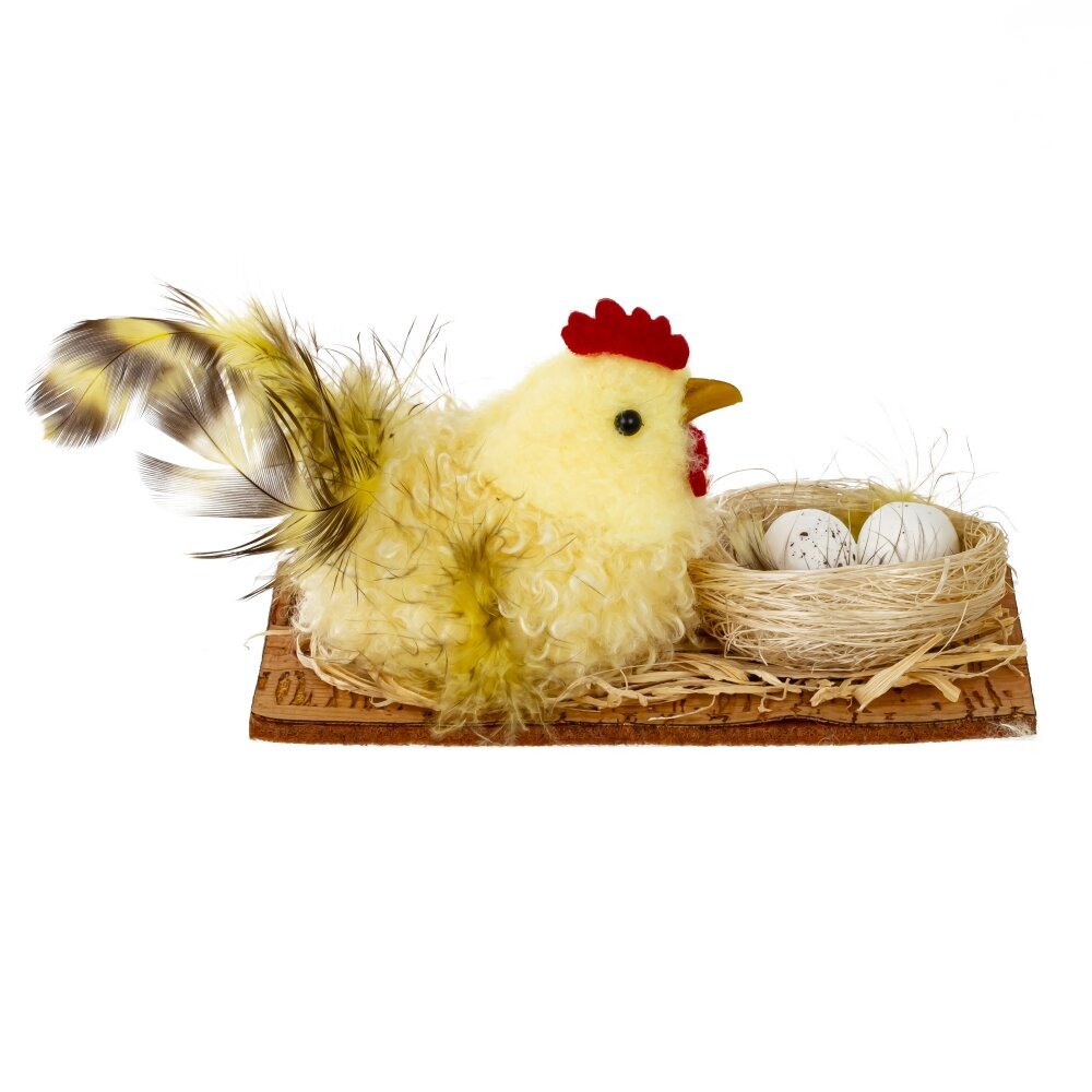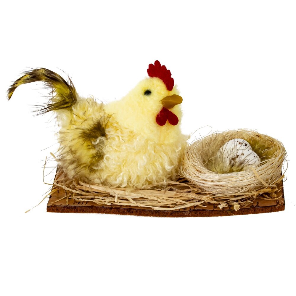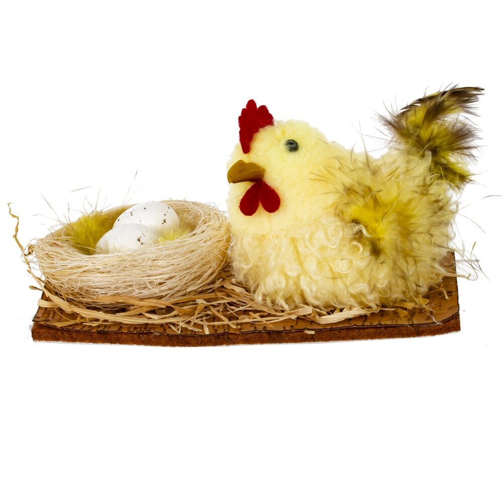 Декоративное изделие "Гнездо пасхальное" выполнено из полимерных, текстильных и натуральных материалов, идеально дополняя праздничный интерьер. Композиция включает аккуратно сплетённое гнездо с имитацией веточек, рядом с которым уютно расположена мягкая курочка из текстильных материалов с пушистым оперением, в гнезде — белые яички с реалистичными деталями. Натуральные перышки и структурированная поверхность делают украшение особенно выразительным. Этот элемент декора добавит уют и создаст атмосферу праздника, идеально подходит для оформления пасхального стола, подарков или весенних композиций. Представлено в трех вариантах.