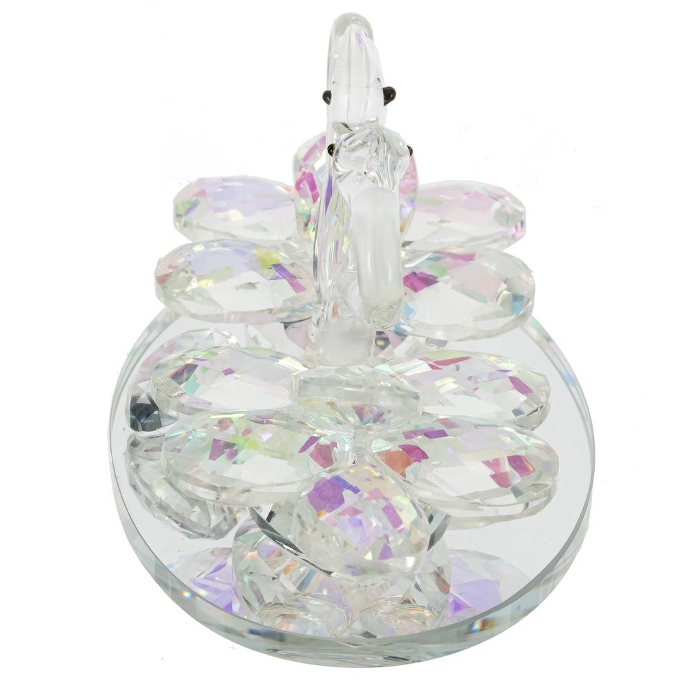 Изящная декоративная фигурка в виде двух лебедей, выполненная из прозрачного стекла с огранёнными «крыльями»-кристаллами. Перламутровые грани красиво преломляют свет и создают радужные блики, придавая композиции особое сияние. Лебеди расположены друг к другу головами, образуя сердце, что делает изделие символом любви, верности и гармонии. Фигурка установлена на круглой зеркальной подставке, которая усиливает блеск и подчёркивает утончённость формы. Идеальный вариант для украшения спальни, гостиной, полки с сувенирами, а также трогательный подарок на свадьбу, годовщину или День святого Валентина.