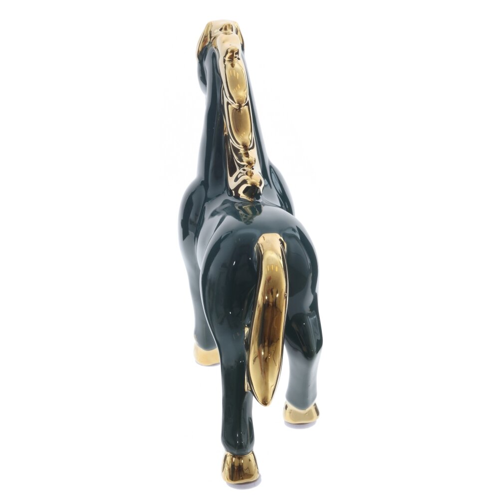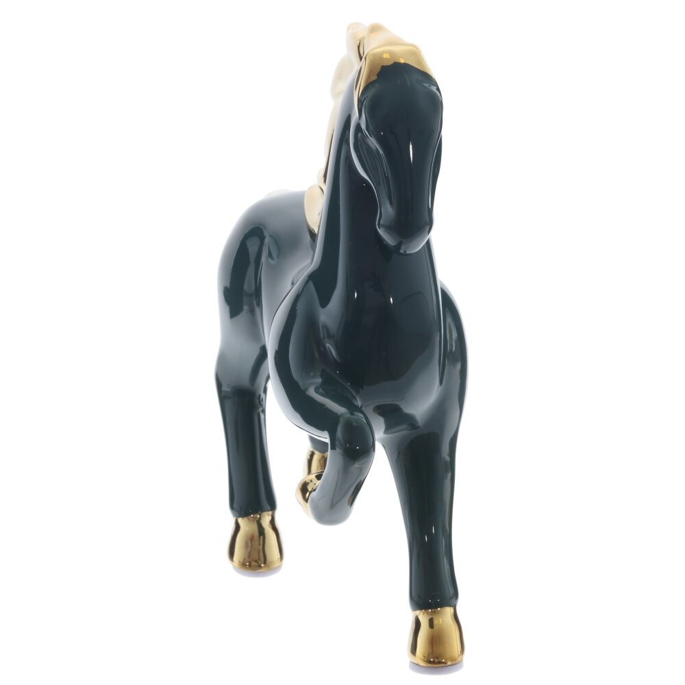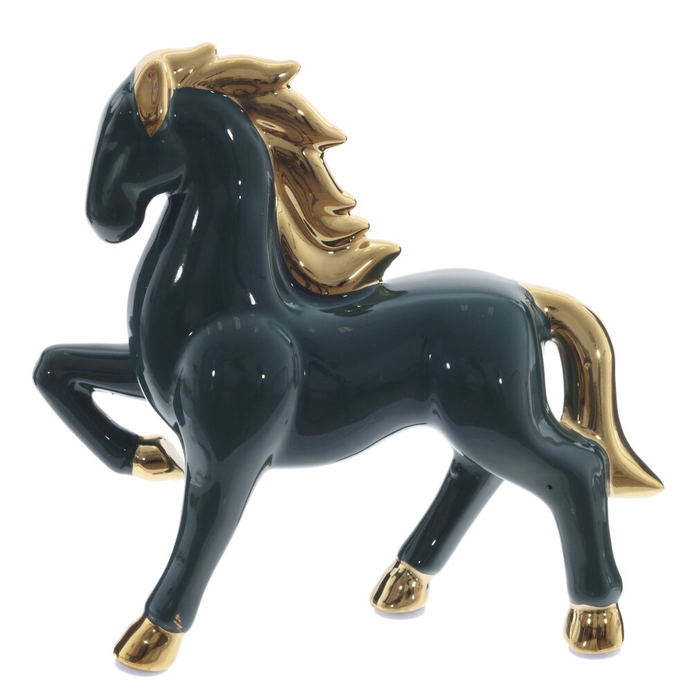 Декоративная фигурка «Лошадь» из керамики станет выразительным акцентом в интерьере и удачным подарком. Гладкая зеркальная глазурь благородного темно-изумрудного оттенка эффектно сочетается с золотистыми акцентами на гриве, хвосте и копытах. Динамичная поза с приподнятой ногой подчеркивает энергию, силу и стремление вперед, а золотой блеск символизирует достаток и успех. Лошадь традиционно считается покровительницей удачи и вдохновения, поэтому фигурка подойдет для рабочего кабинета, гостиной или прихожей, а также как талисман и символ года по восточному календарю. Устойчивая, легко очищается от пыли и долго сохраняет безупречный вид.