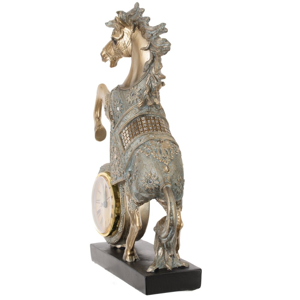 Декоративная фигурка "Лошадь" с часами — это изысканный и функциональный акцент для вашего интерьера, сочетающий элегантность и практичность! Выполнена из прочного полистоуна, устойчивого к царапинам и пыли. Установлена на подставке. Фигурка изображает реалистичную золотую лошадь в динамичной позе курбет (на задних ногах), с высокой детализацией: мускулистое тело, выразительная морда, развивающаяся грива и хвост, словно ожившие под ветром. Нарядная попона украшена изысканным узором и старазми, придающим праздничный шарм. Круглые часы с диаметром циферблата 7 см имеют римские цифры и работают от одной батарейки АА (батарейки не прилагаются). Это практичный подарок как символ года Лошади, идеальный для коллекционеров, любителей лошадей и ценителей стильного декора. Прекрасно дополнит полку, стол или витрину, принося нотку грации и функциональности в любое пространство!