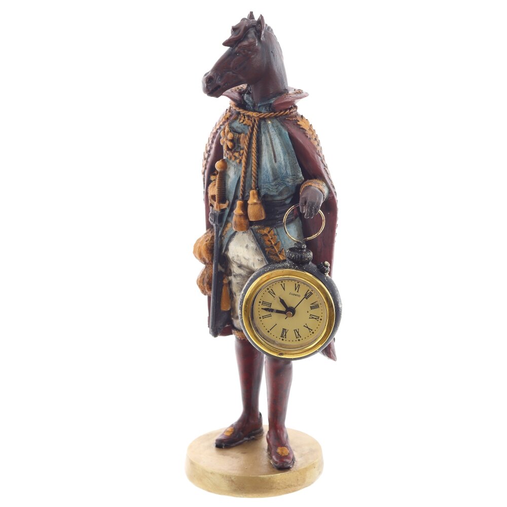 Декоративная фигурка «Лошадь» с часами — эффектный акцент для дома и удачный символ года. Скульптура изображает благородного персонажа с головой лошади в парадном наряде: камзол, плащ с тесьмой и кистями, тонкая имитация старинной отделки. В руке — винтажные часы-подвеска с круглым циферблатом D4 см и римскими цифрами. Изделие выполнено из прочных полимерных материалов, детали тщательно проработаны, окраска с лёгкой патиной. Конструкция устойчива благодаря круглой подставке. Часы работают от одной батарейки LR44 (1 шт.). Фигурку удобно разместить на полке, камине или рабочем столе. Оригинальный подарок и стильный талисман, приносящий энергию и удачу года Лошади.