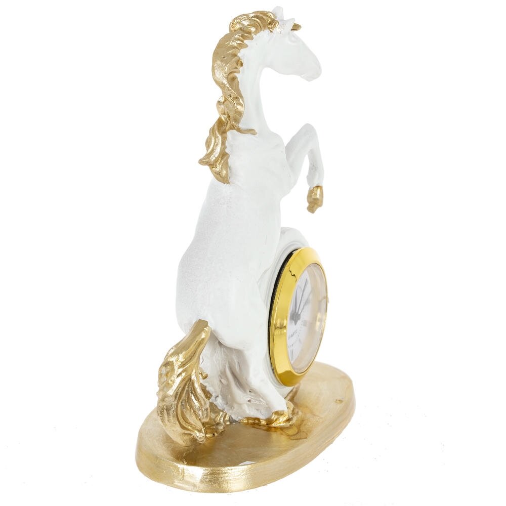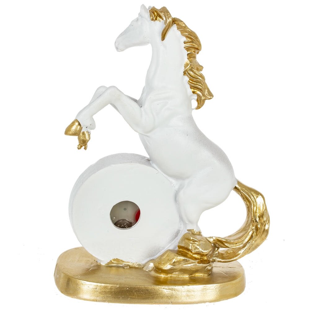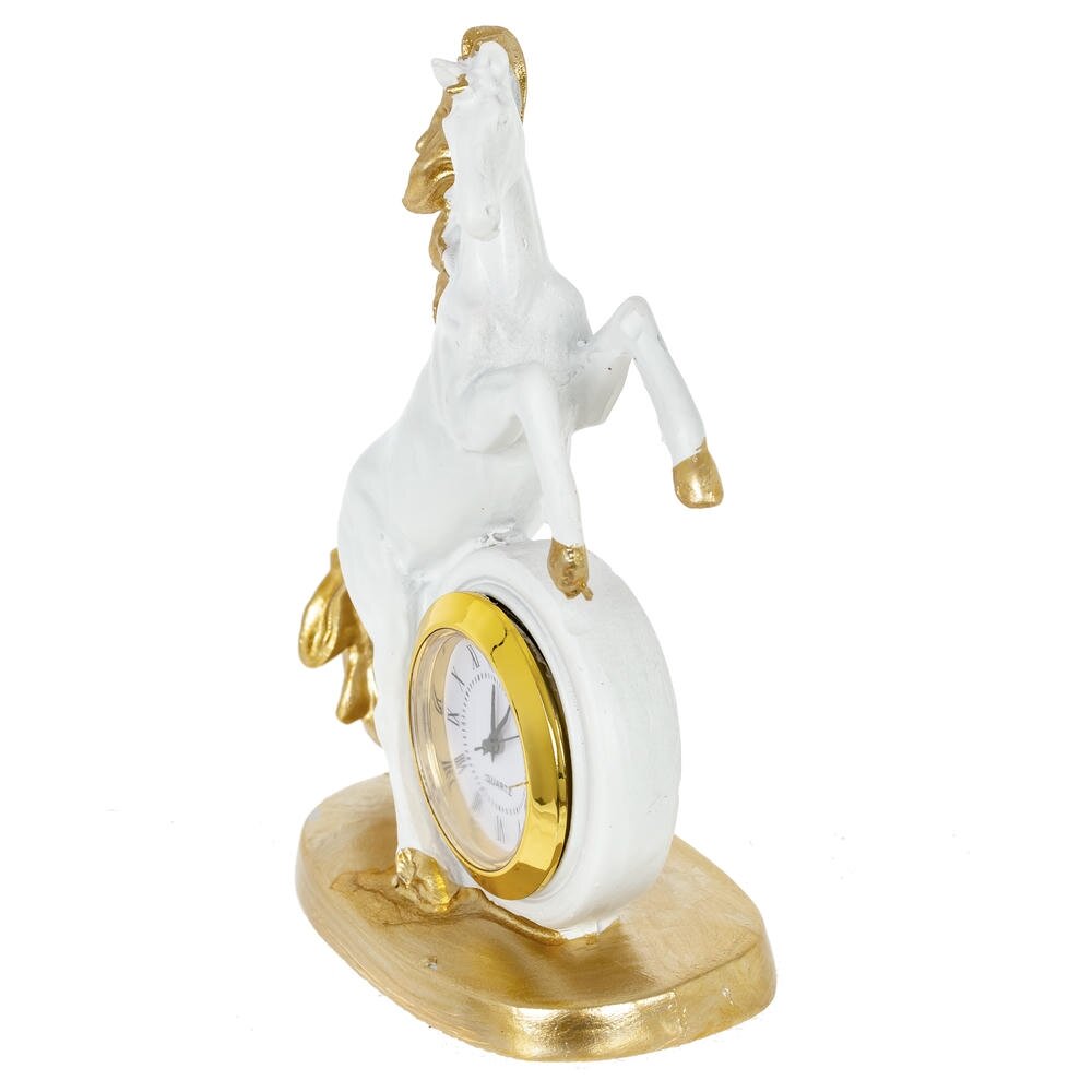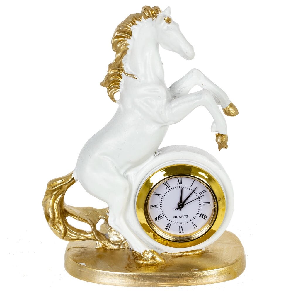 Ощутите ритм времени и неукротимую энергию с декоративной фигуркой "Лошадь" с часами — изысканным символом 2026 года, предназначенным для дома или офиса! Выполненная из прочного полистоуна в бело-золотом цвете, эта стильная лошадка в динамичной позе олицетворяет силу, процветание и удачу в делах. Идеальна в качестве оригинальныого новогоднего подарка или как дополнение к интерьеру, она добавит шарм любому пространству. Наполните свой день магией — эта фигурка подарит гармонию и вдохновение на целый год!